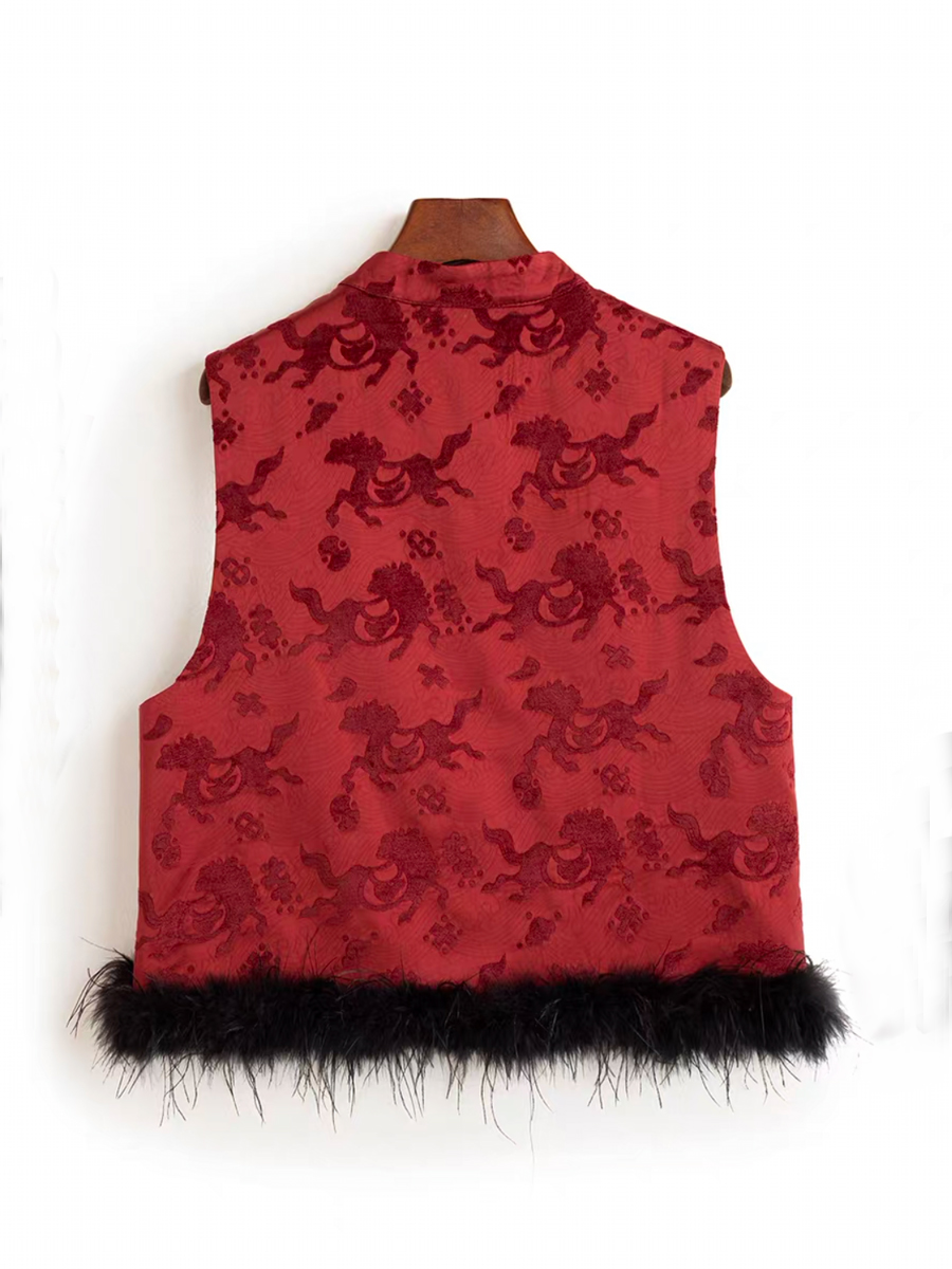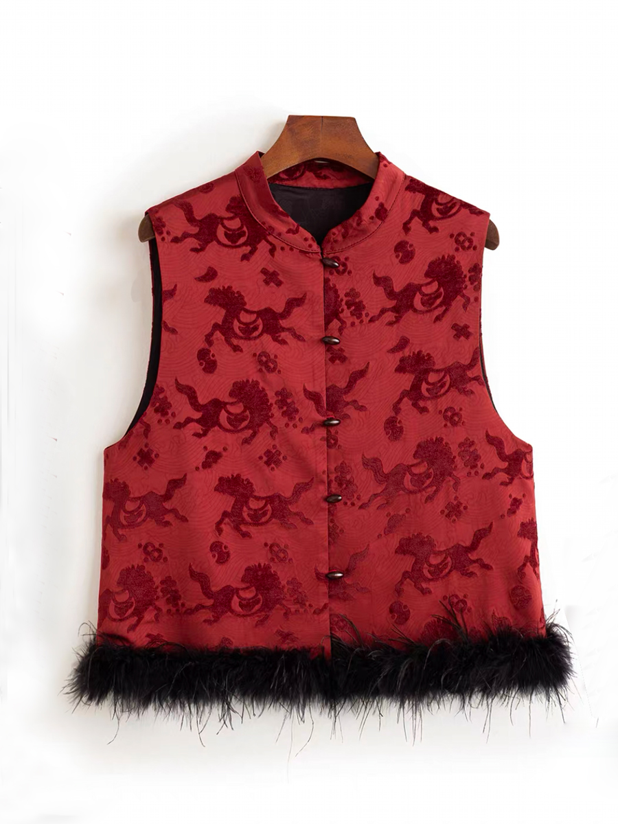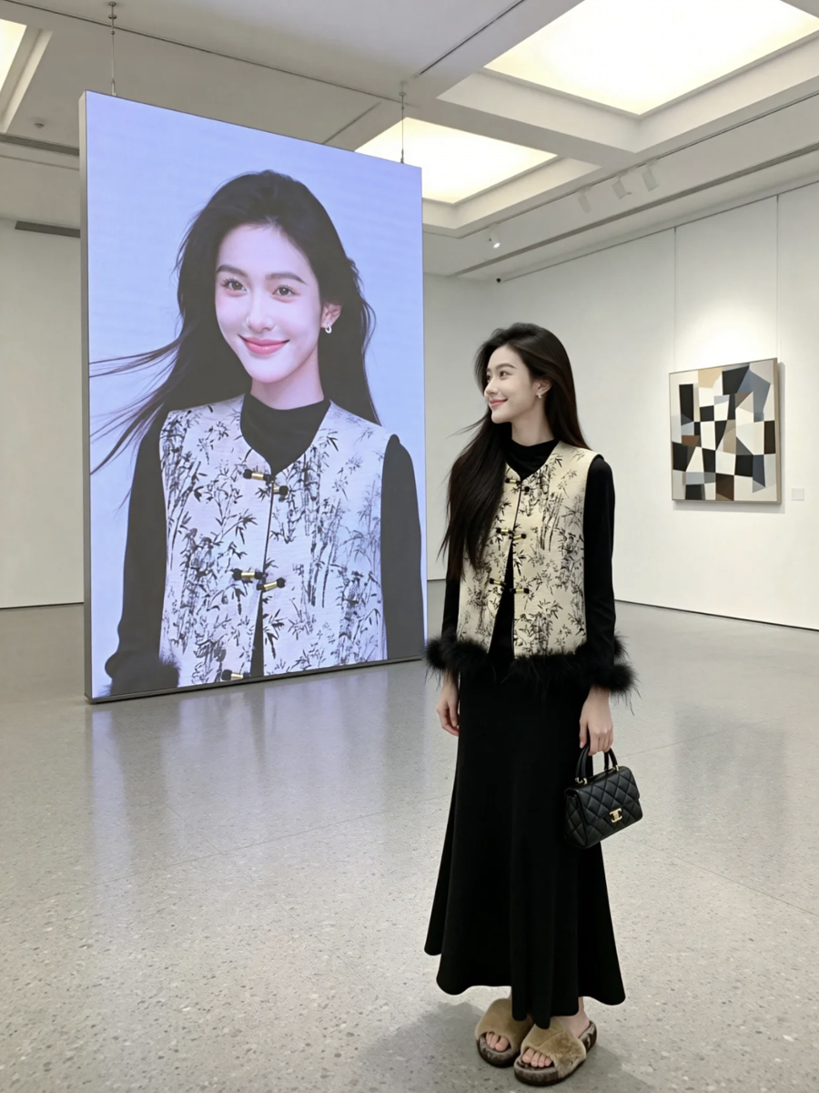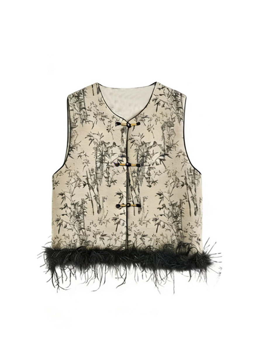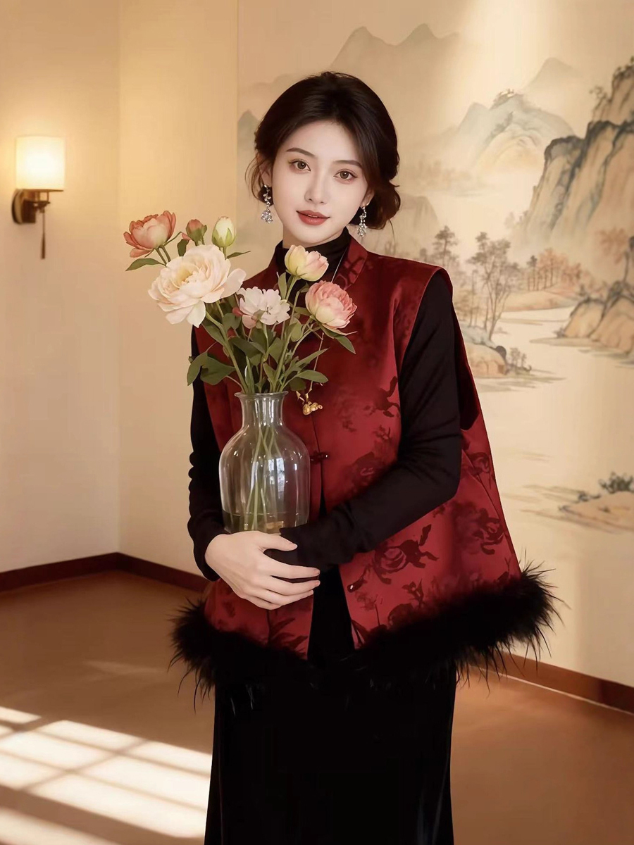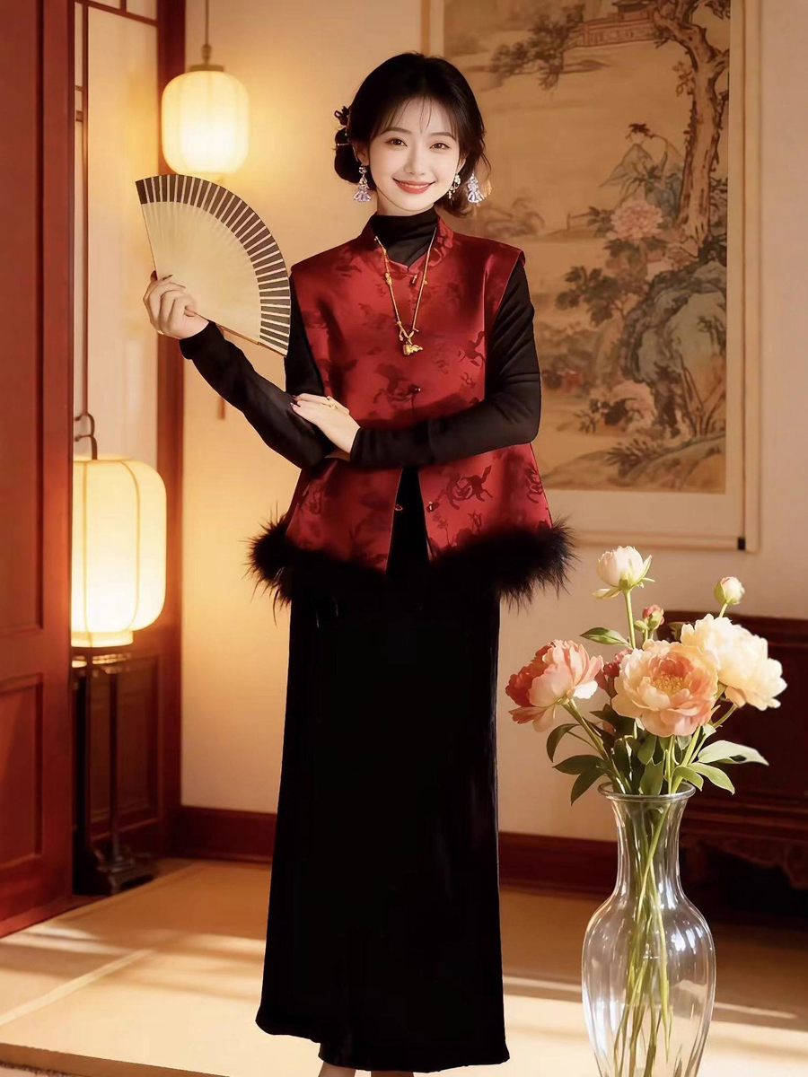 【百图lulu定制】【月移竹影三件套】夹棉新中式马甲 鸵鸟毛 T恤 丝绒半身裙 三件套