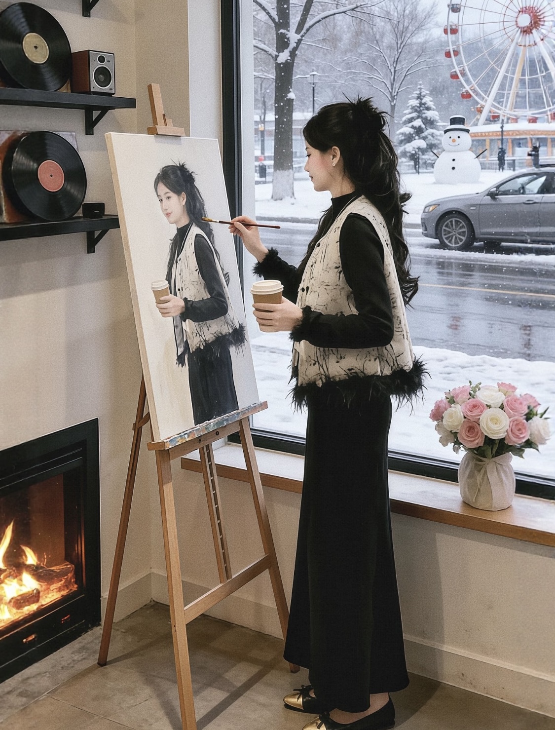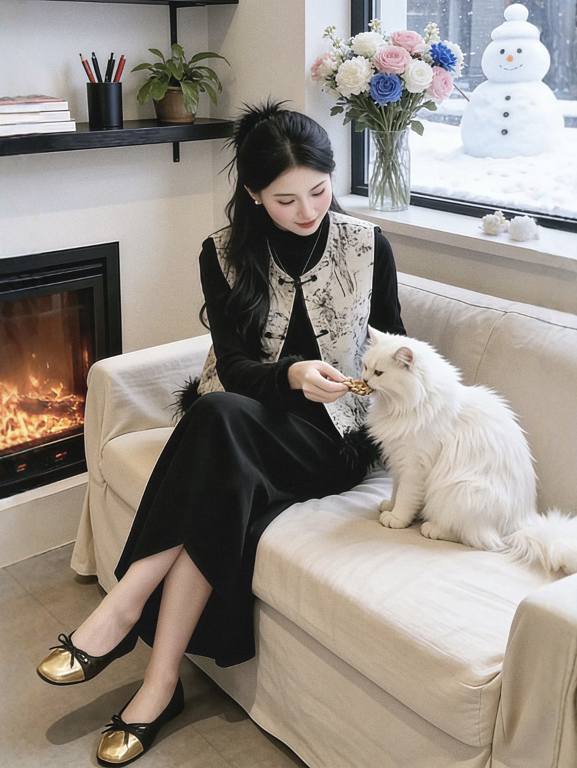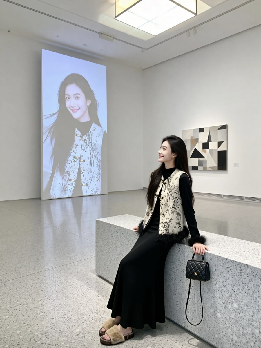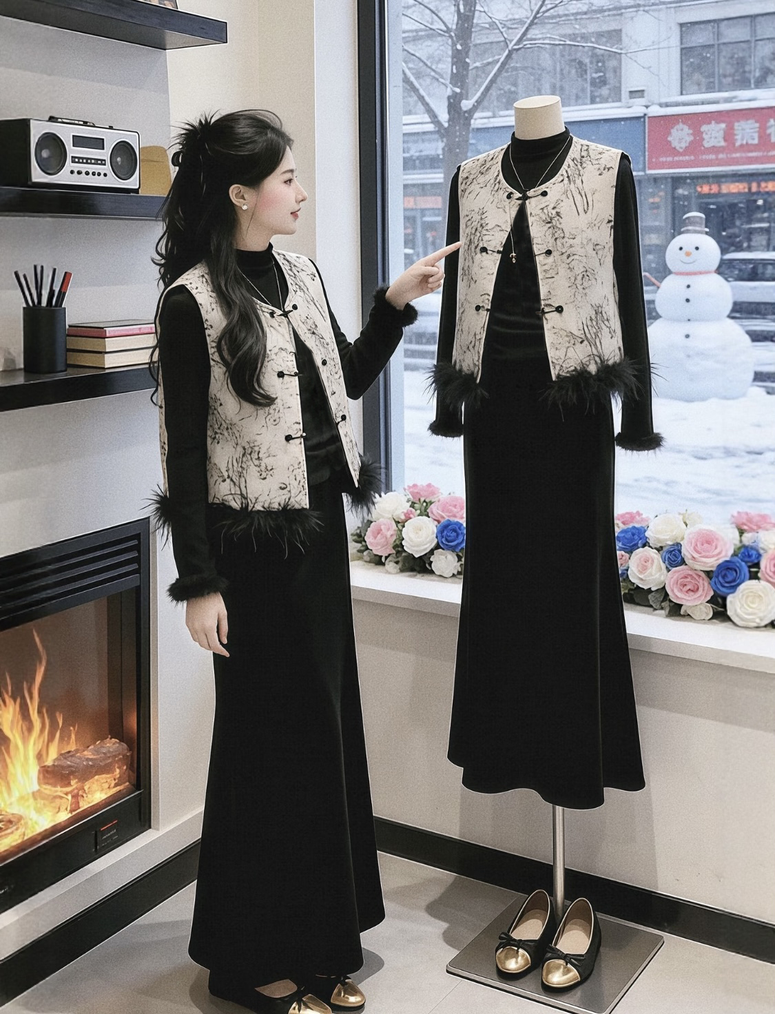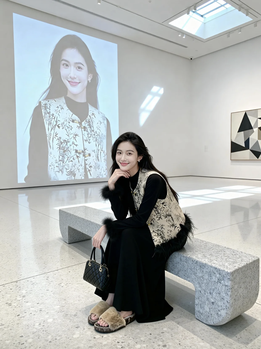 【百图lulu定制】【月移竹影三件套】夹棉新中式马甲 鸵鸟毛 T恤 丝绒半身裙 三件套