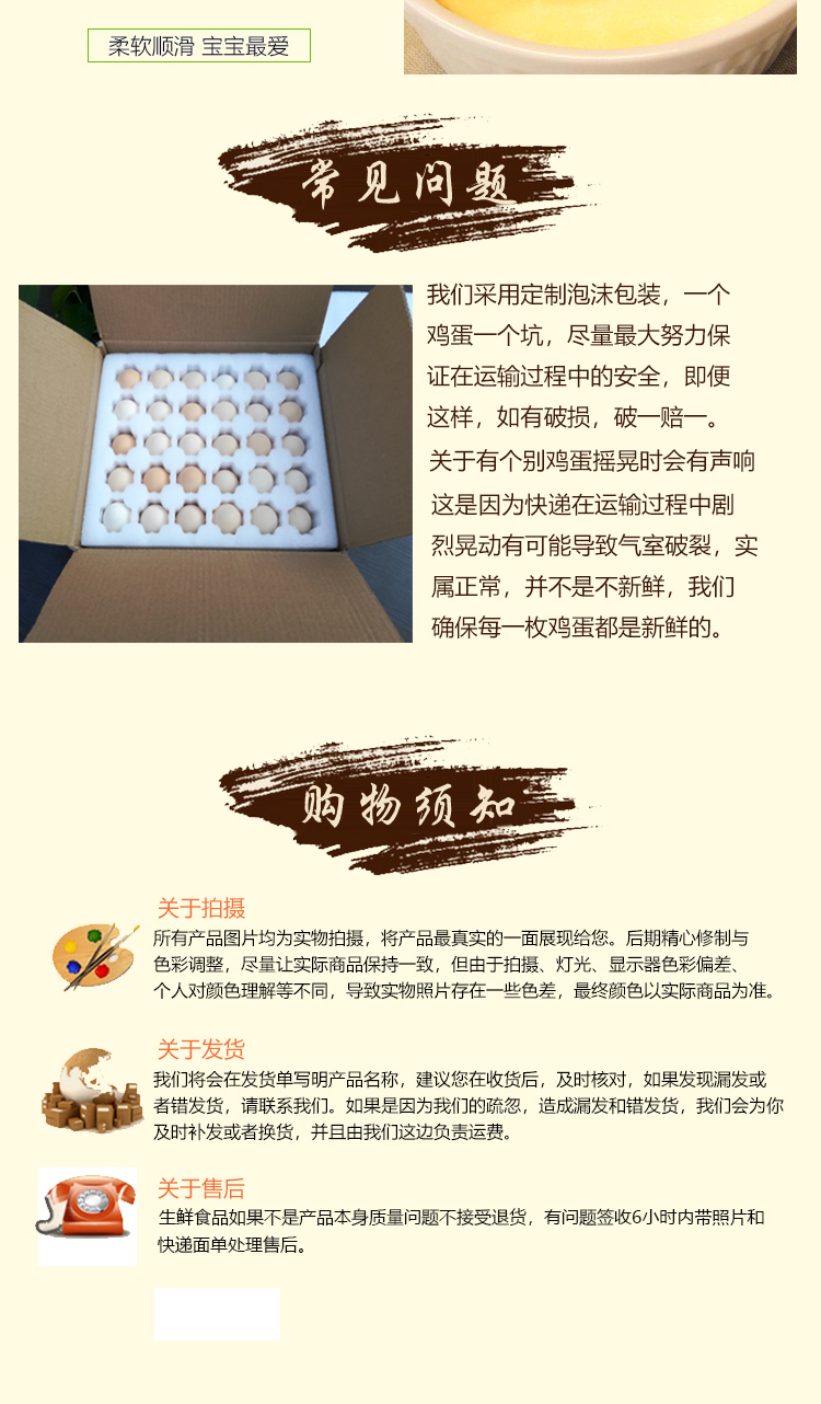 收到鸡蛋有质量问题第一时间反馈,签收24小时之内带快递单和包装箱 鸡蛋收到后要从珍珠棉里拿出来,放到冰箱保鲜层