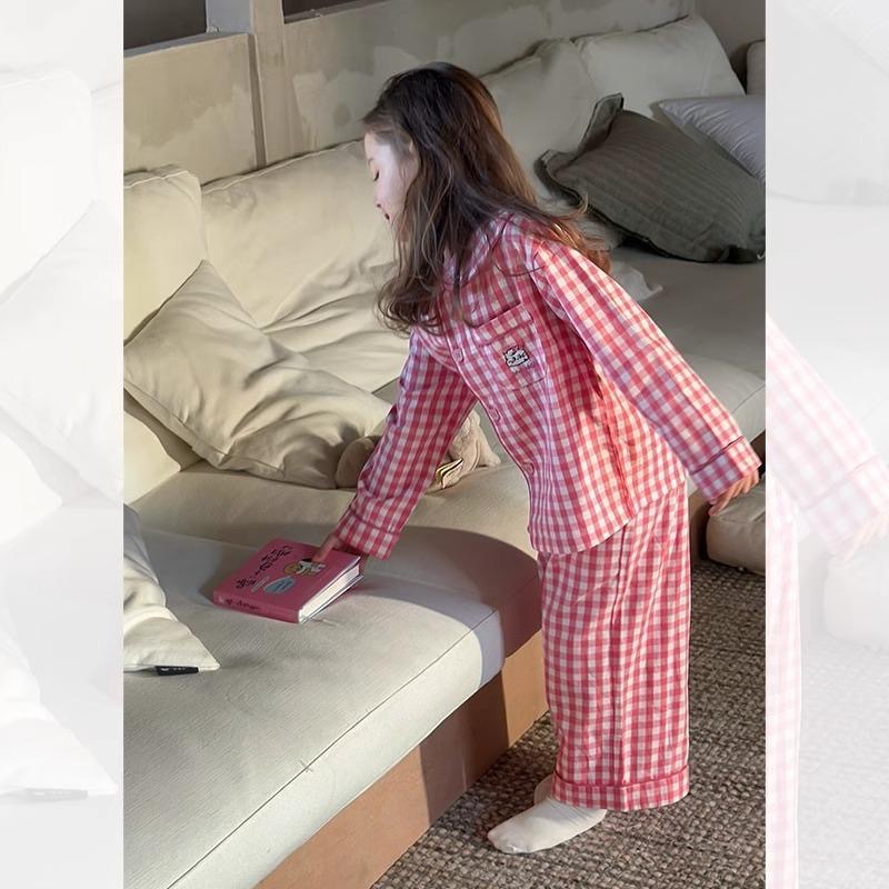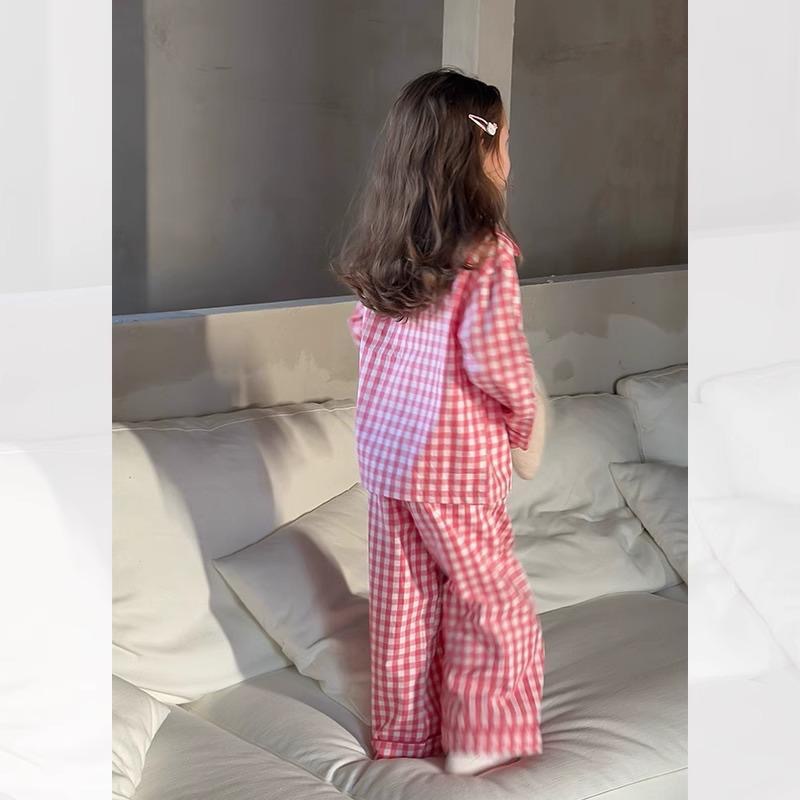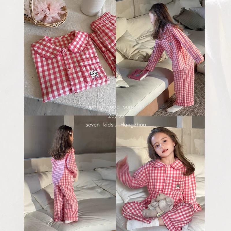 宸之昊女童睡衣春秋新款洋气女孩甜美可爱卡通格子长袖家居服两件套装★ 商品图0