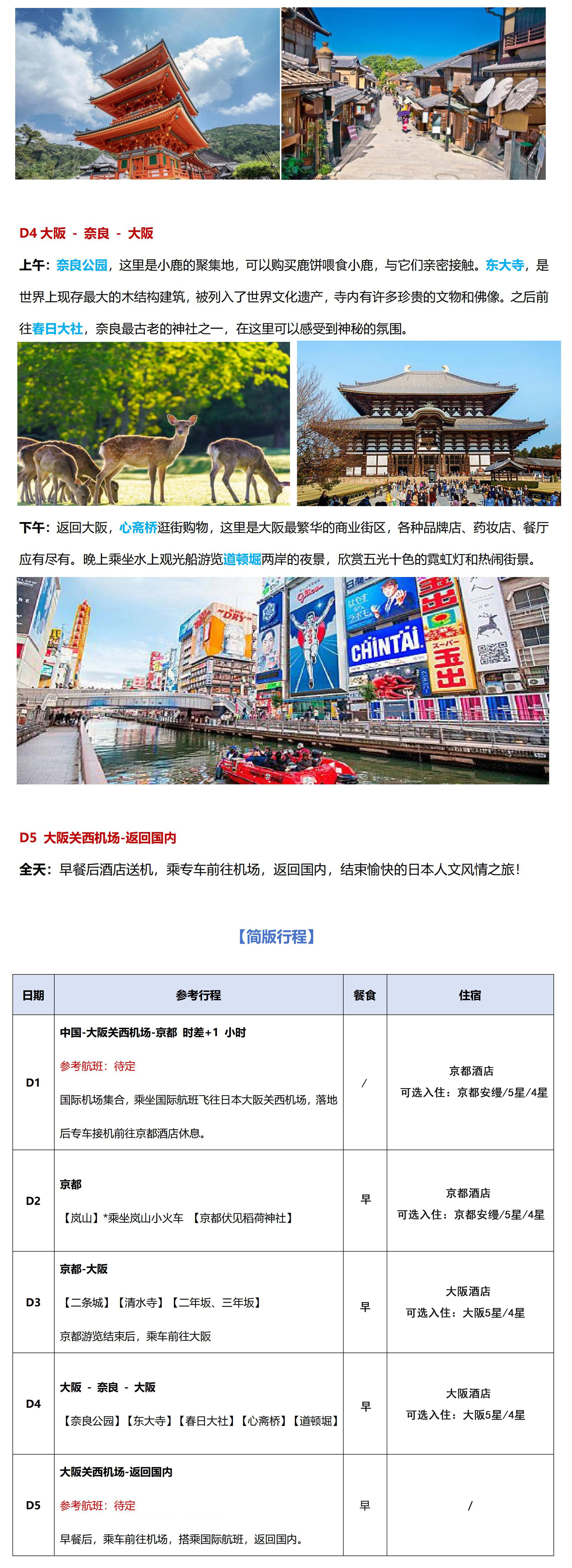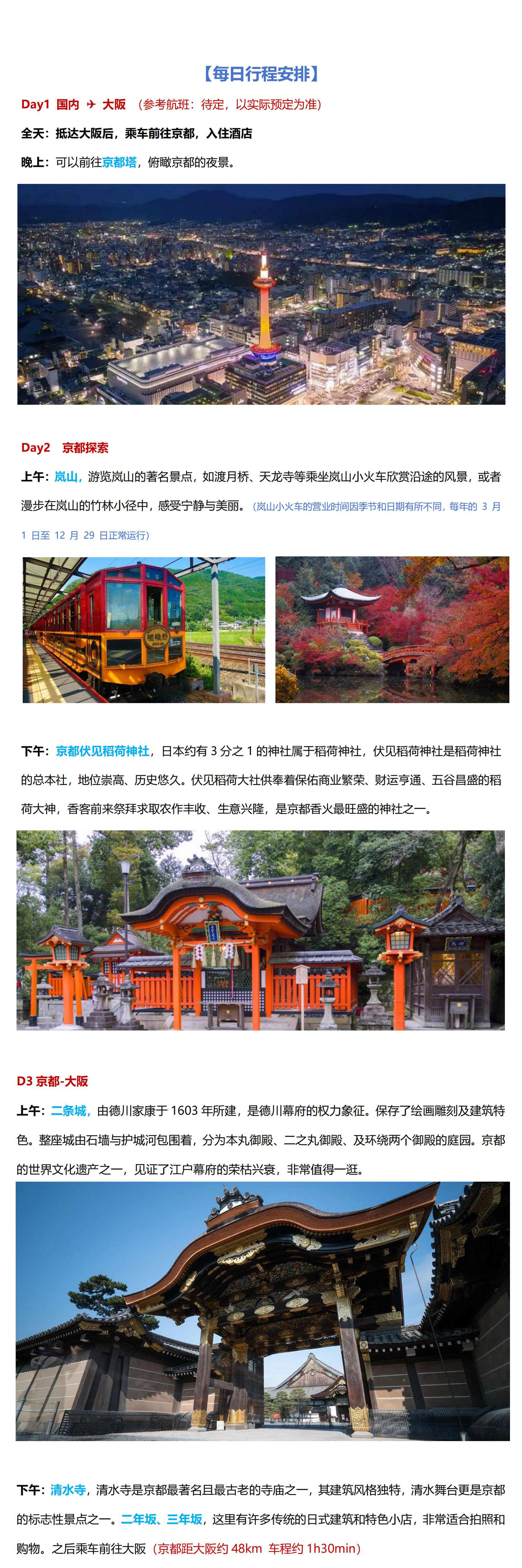 1.【可选】套餐1:D1-D2 京都4星 2晚,D3-D4 大阪4星 2晚,含早 2人一间;