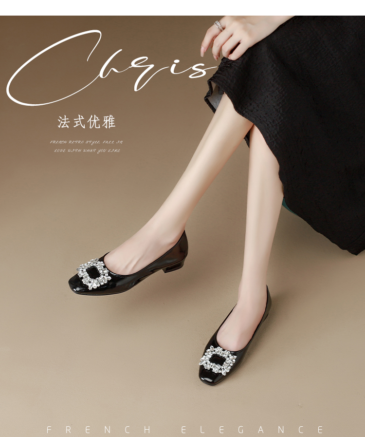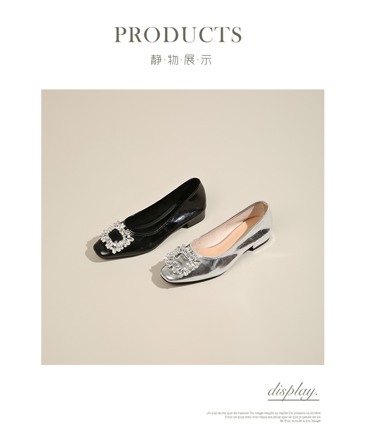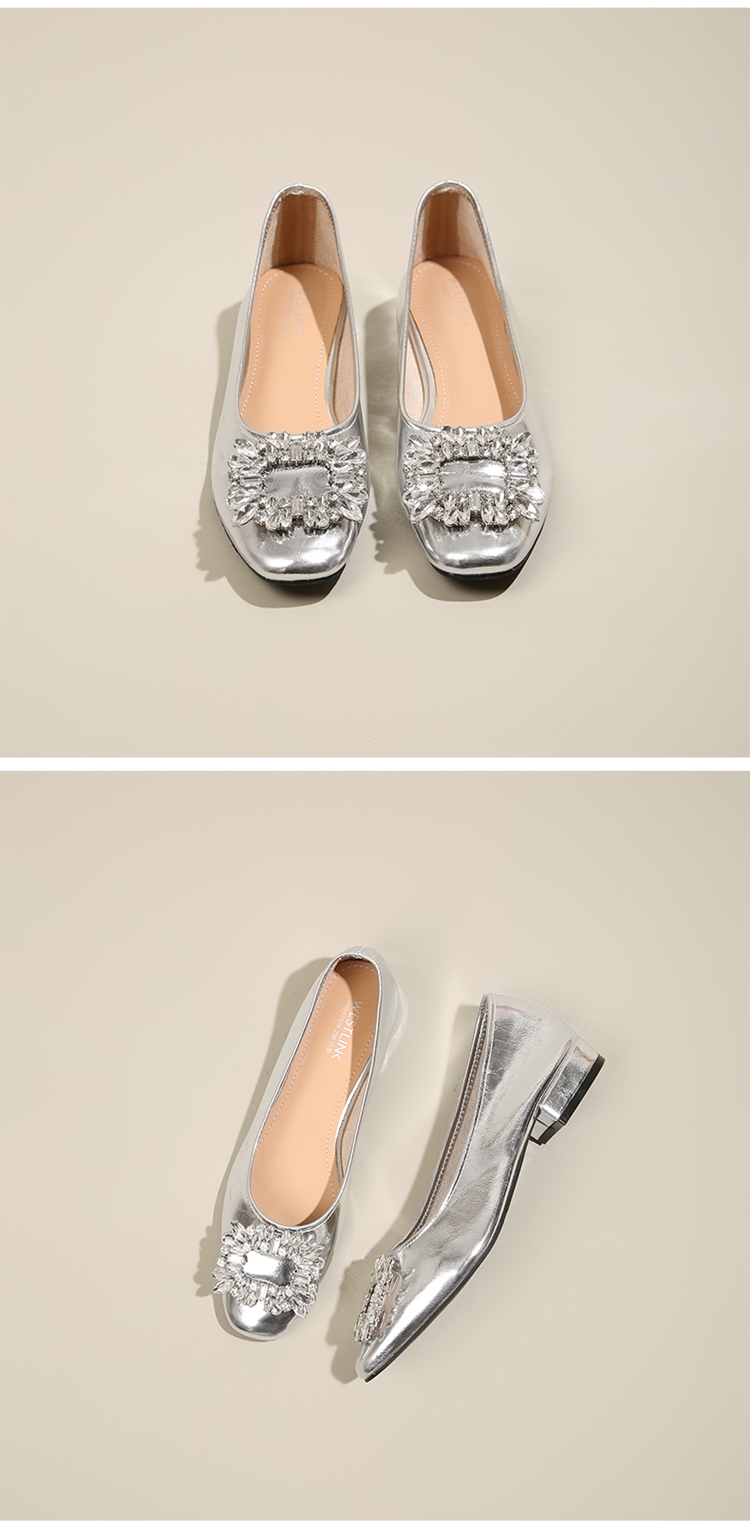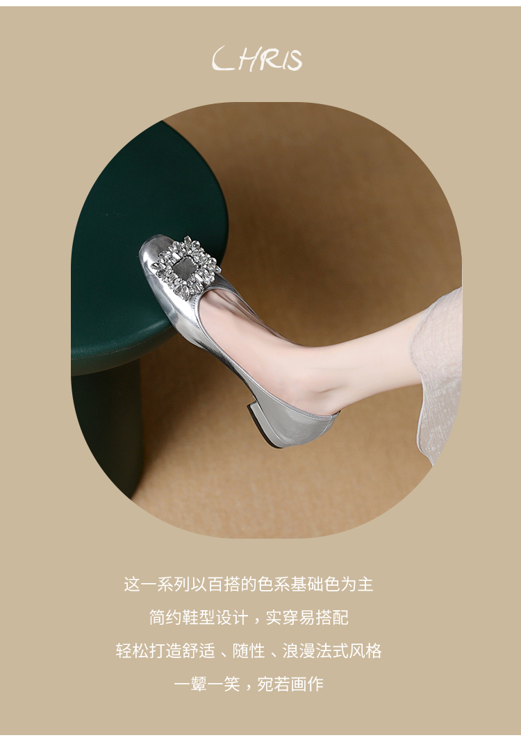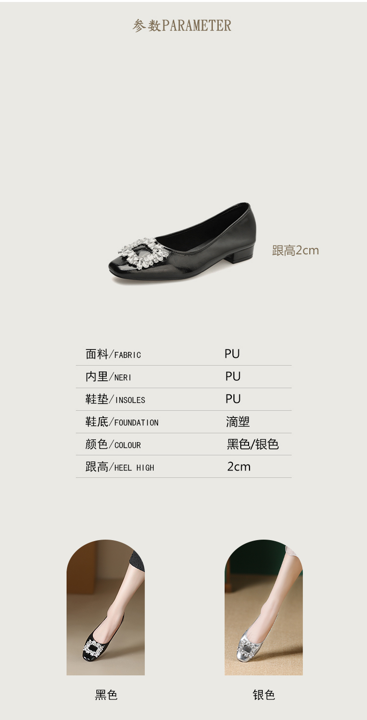 西遇低跟法式单鞋新款早春气质通勤百搭女鞋方钻银色浅口船鞋V0047338