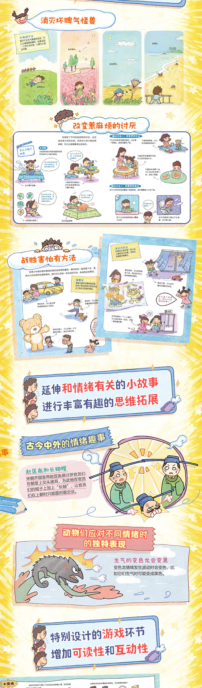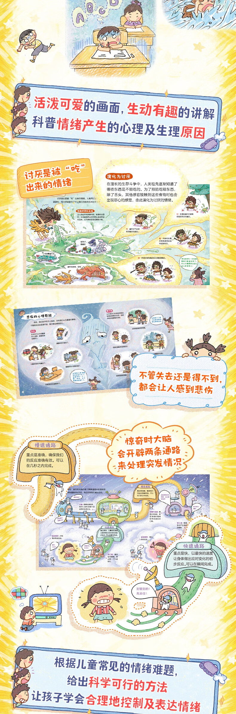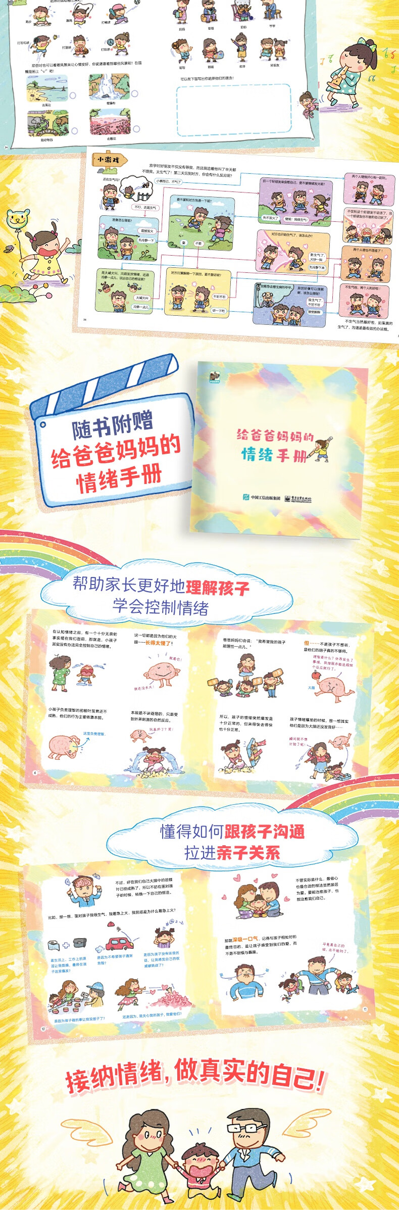 在儿童成长的过程中,不可避免地会爆发各种各样的小情绪,但有时情绪的不正当表达会让孩子陷入苦恼之中。《超级麻烦的情绪:儿童心理学科普绘本》以快乐、害怕、惊奇、讨厌、生气、悲伤这6种人类非常基础的情绪作为出发点进行讲解,用轻松活泼的画面及生动有趣的语言,向孩子介绍各种各样的情绪,同时解密这些情绪背后的生理原因。 比如"为什么生气的时候会忍不住提高音量?”"惊讶的时候为什么会先深吸一口气?”"为什么有的人胆子很大有些人胆子却很小?”……在经过详细有趣的科普之后,让孩子了解情绪带来的生理及心理反应,并更清晰地分辨不同的情绪,从而合理地、正确地对待自己的情绪问题,并及时的疏导和缓解不良的情绪,收获健康、快乐的成长。