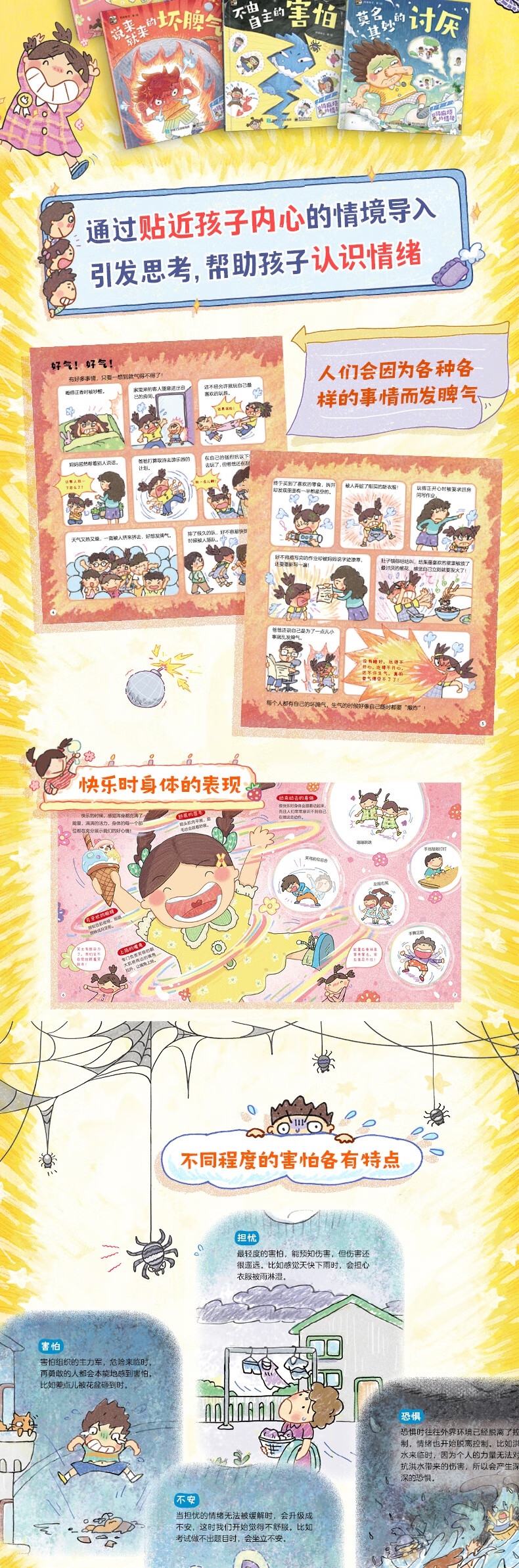 治愈系心理学科普童书,以快乐、悲伤、害怕、惊奇、讨厌、生气这6种人类的基础情绪作为出发点展开,通过生动活泼的漫画、轻松幽默的语言、深入浅出的讲解,向孩子介绍各种情绪等心理学方面的知识,帮助孩子读懂情绪,认识自己,同时接纳自己,快乐成长!