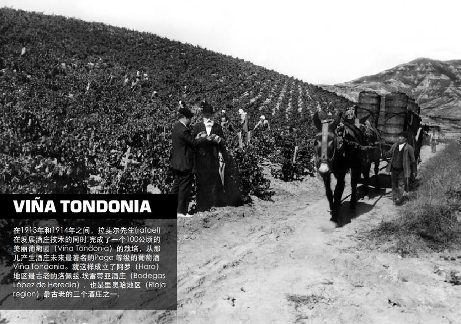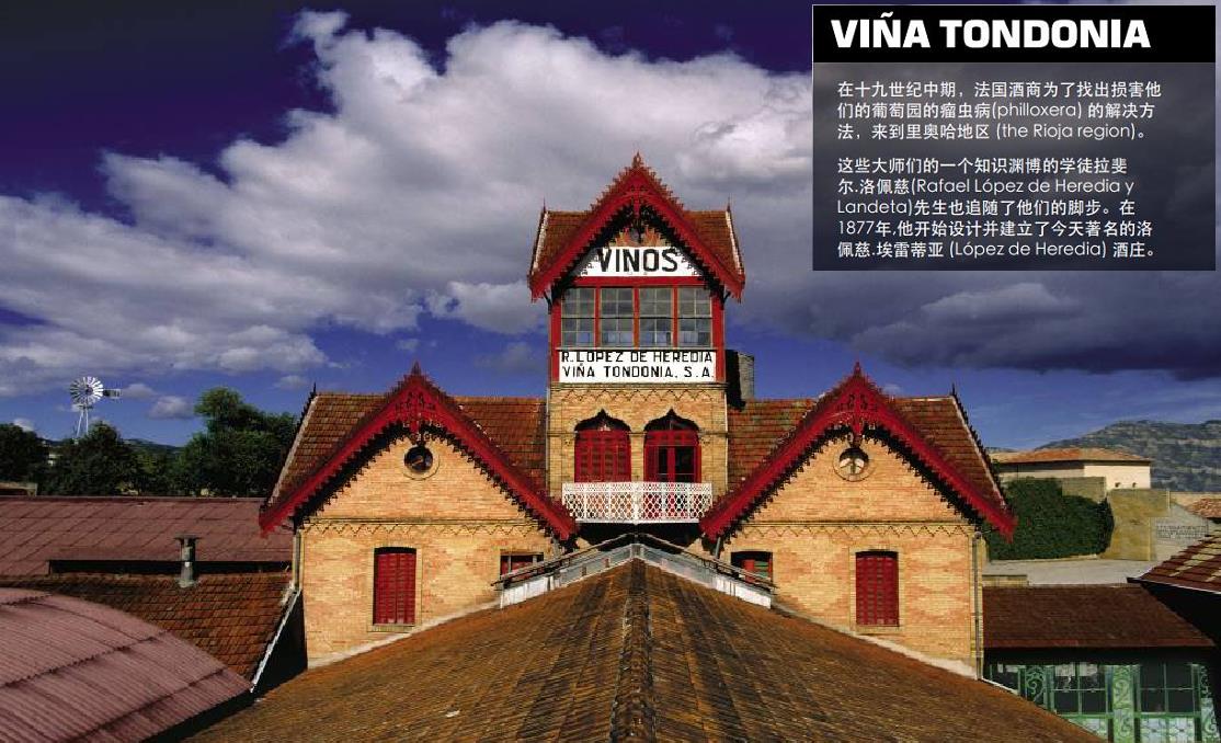 19世纪中期,法国酒商到西班牙Rioja地区寻找根治葡萄根瘤病(Philloxera)的方法,其中一位名叫Rafael Lopez de Heredia y Landeta的酒商被Rioja地区独特的风土和文化所吸引,认为这里是一块适合种植葡萄的宝地。1877年,他把自己的想法付诸于实际行动,在这里建造了Vina Tondonia酒庄。现在,一个多世纪过去了,Vina Tondonia酒庄依然是Rioia法定产区为数不多的家族酒庄之一,酒庄现在的拥有者是Lopez de Heredia家族的第4代传
