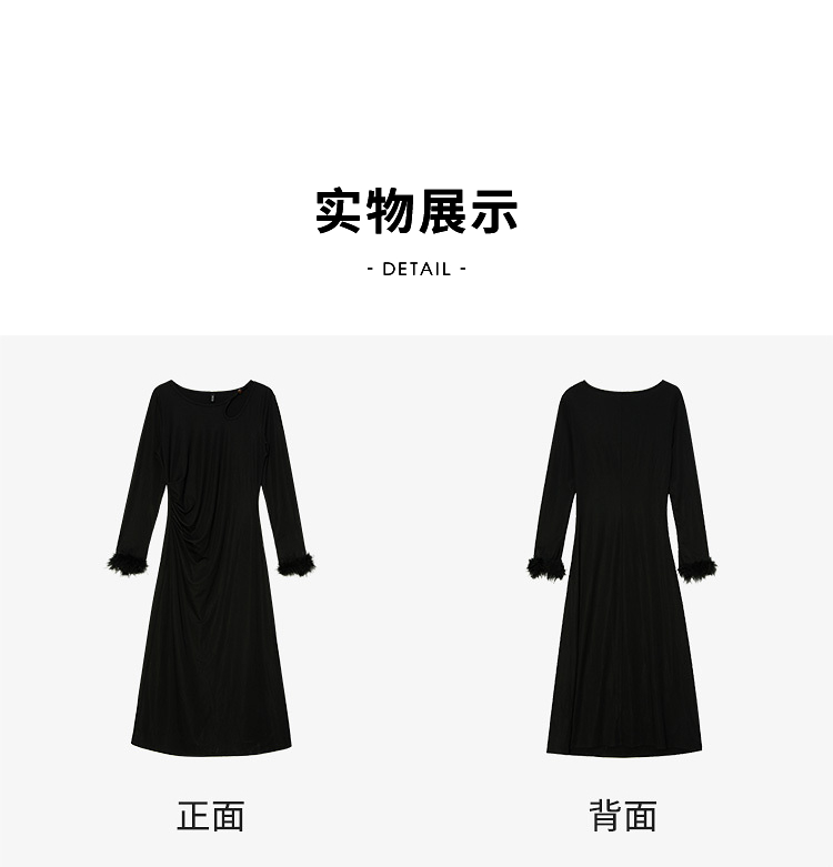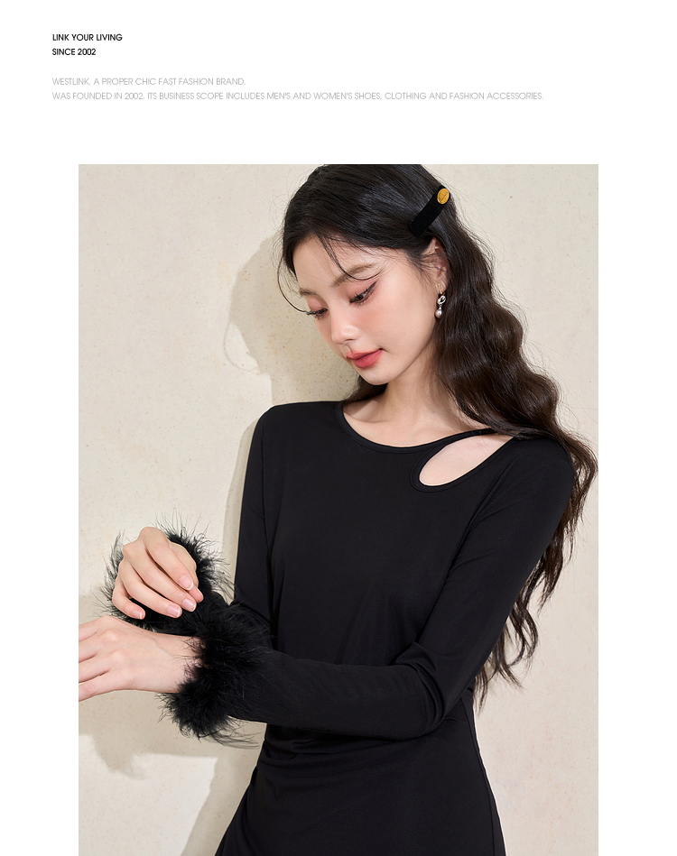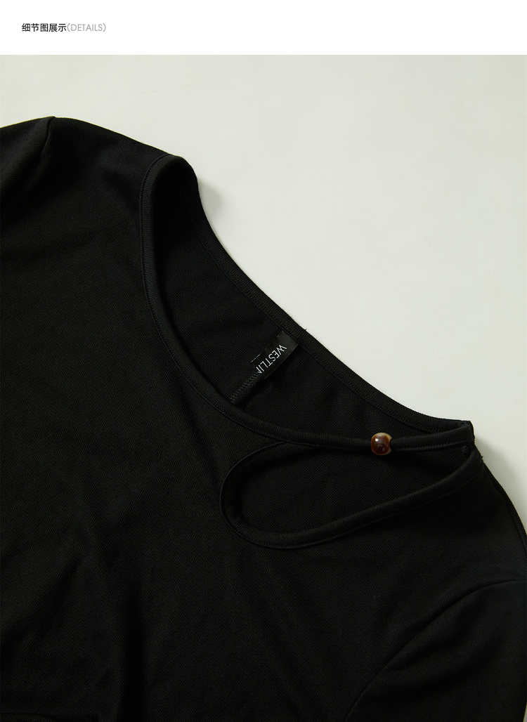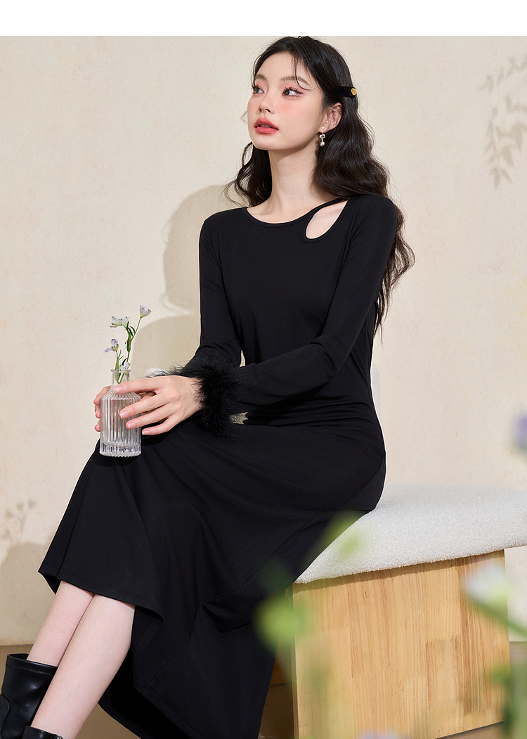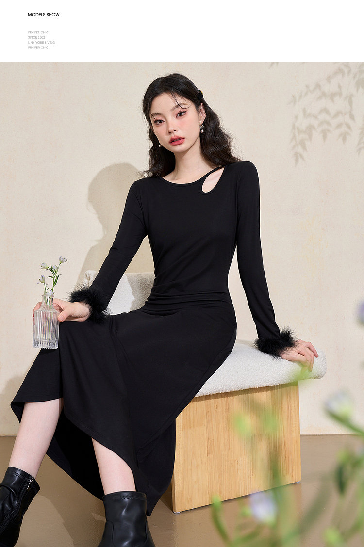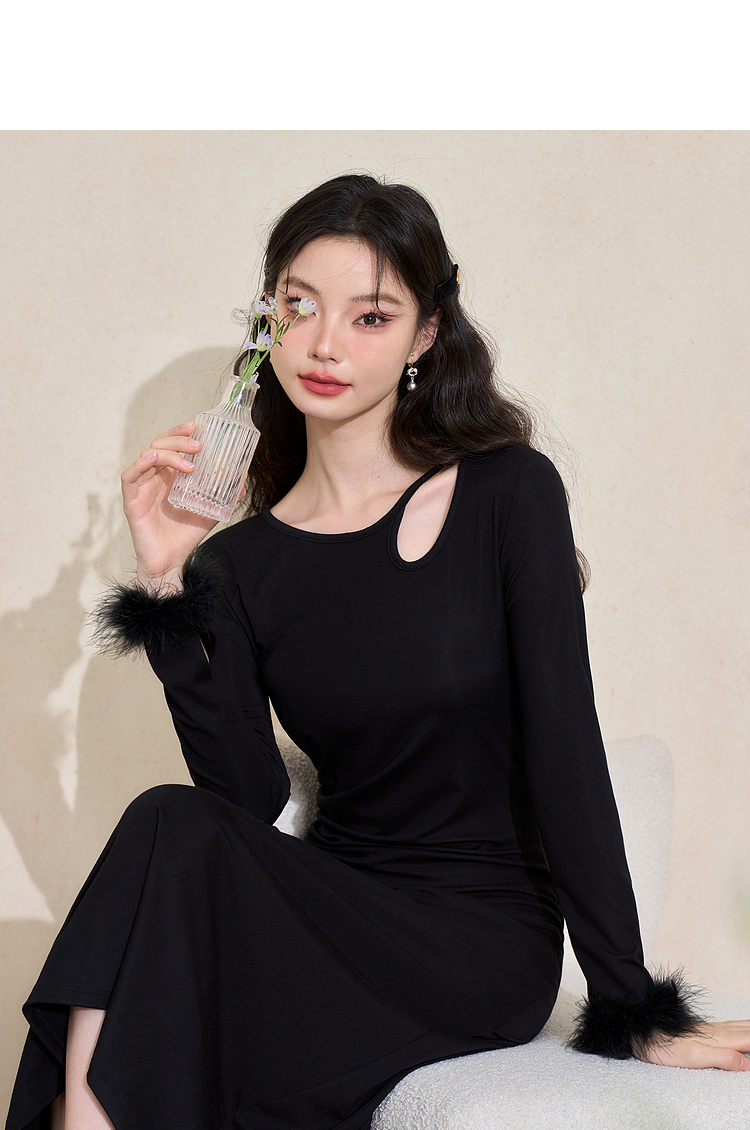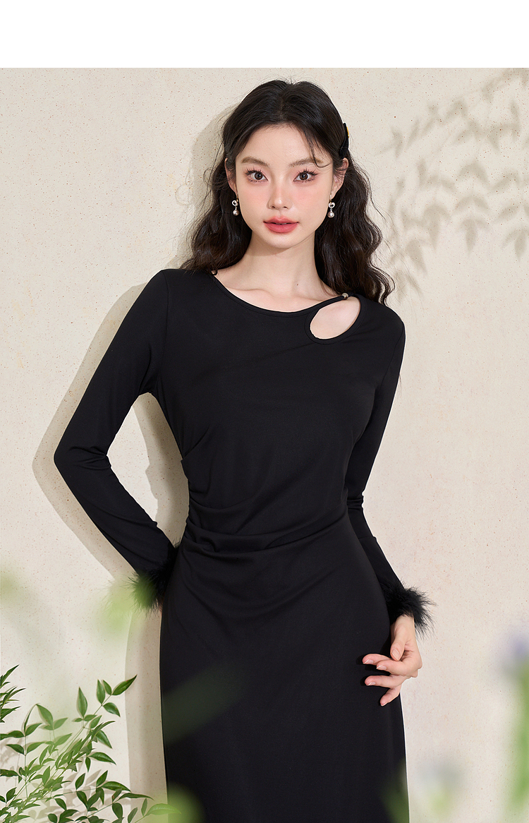 西遇黑色长袖针织连衣裙女2024年秋季新款法式镂空修身高弹长裙D3342229
