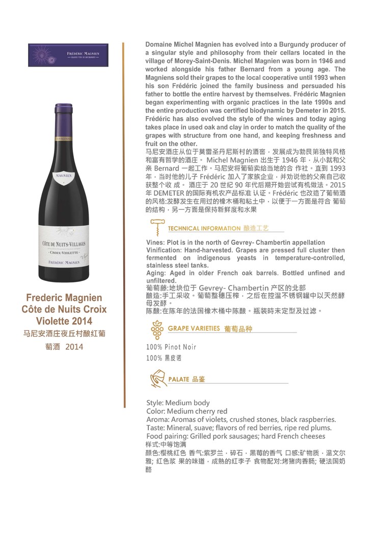 马尼安酒庄夜丘村酿红葡萄酒 2014 Frederic Magnien Côte de Nuits Croix Violette
