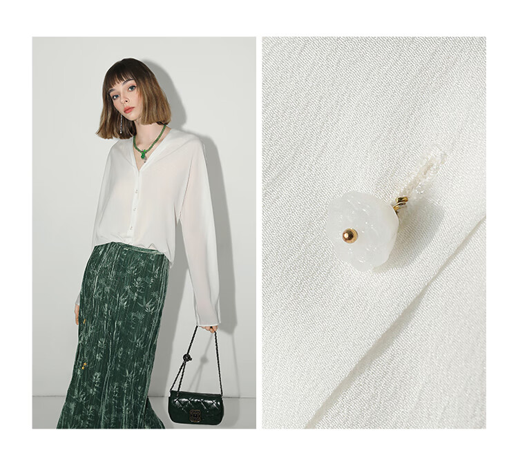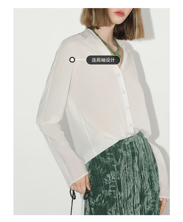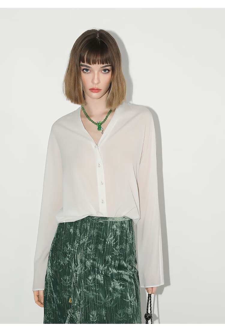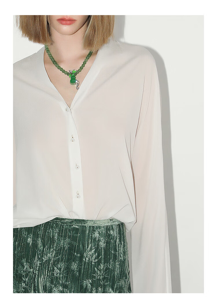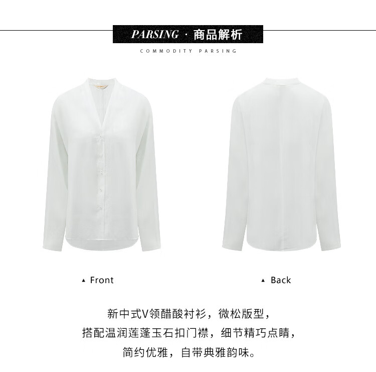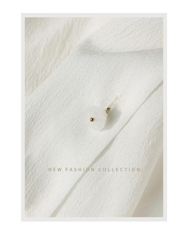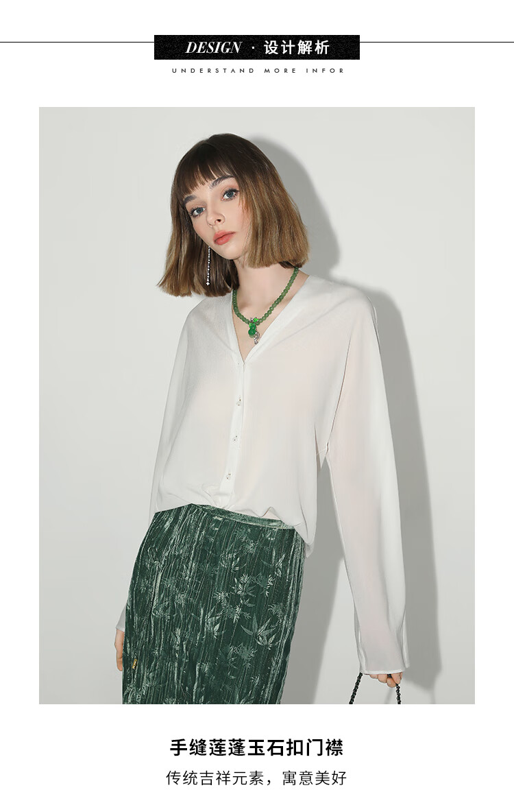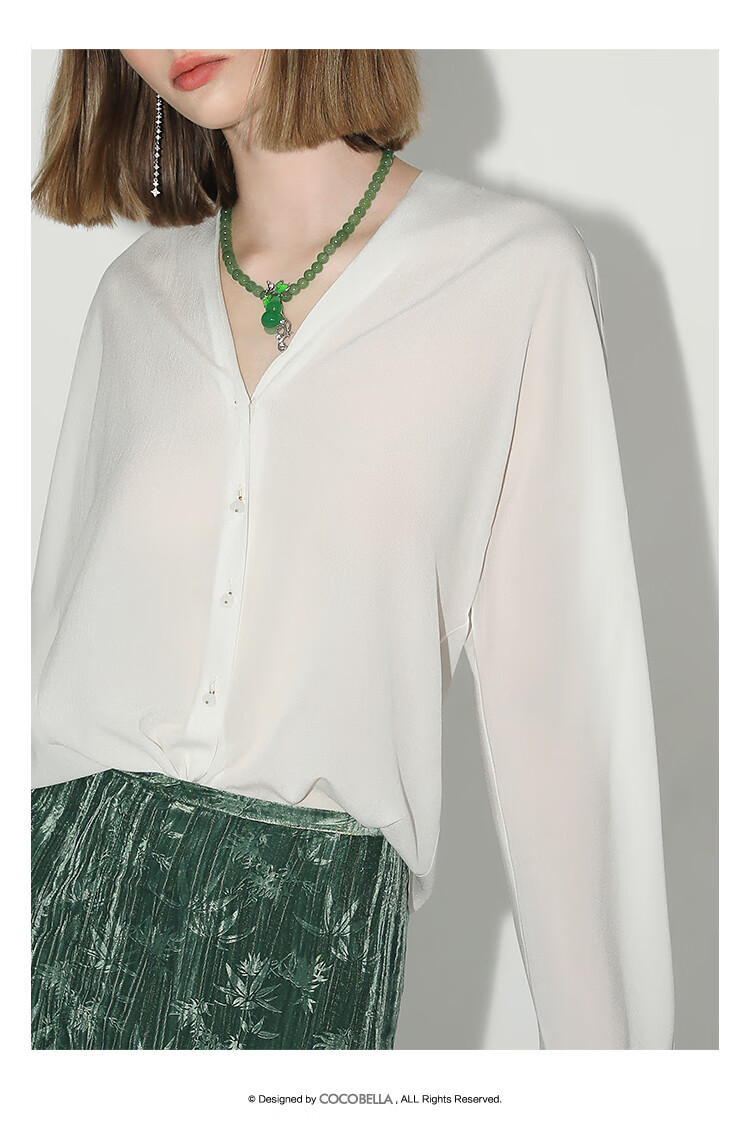 COCOBELLA轻奢醋酸纤维新中式V领白衬衫玉石扣质感衬衣SR0021