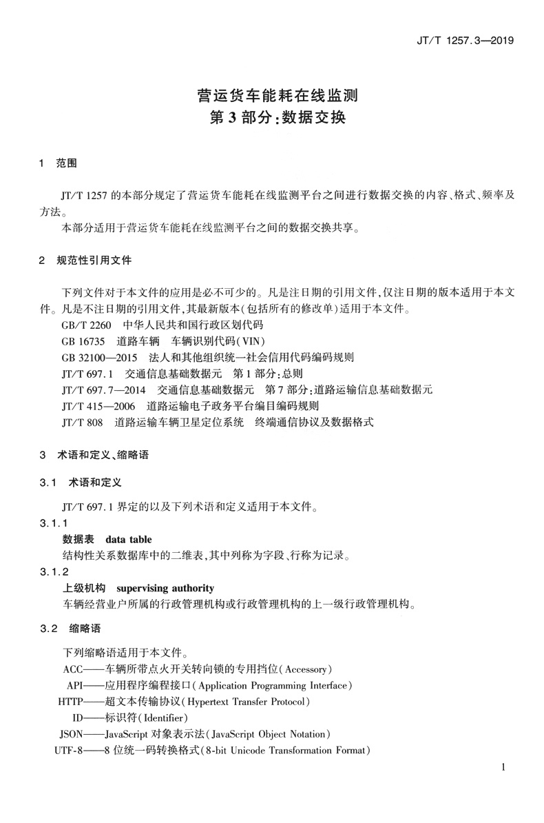 书名:营运货车能耗在线监测 第3部分:数据交换(JT/T 1257.3—2019)