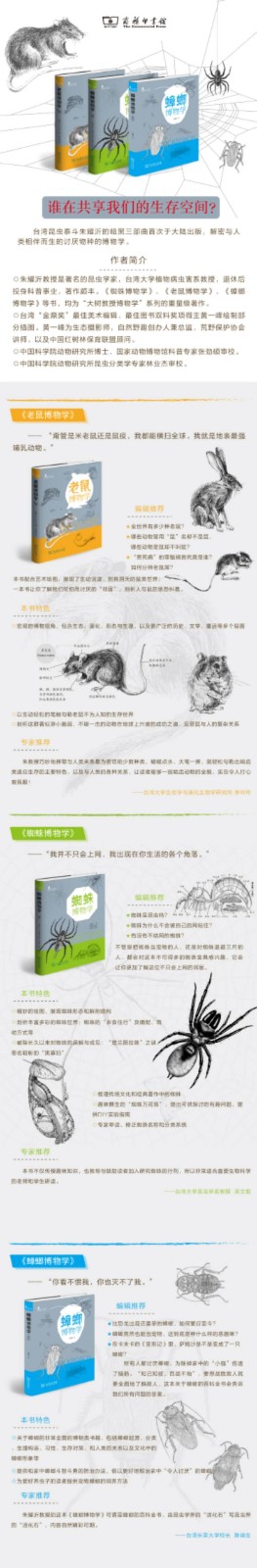 朱耀沂教授是著名的昆虫学家,台湾大学植物病虫害系教授,退休后投身科普事业,著作颇丰。《蜘蛛博物学》、《老鼠博物学》、《蟑螂博物学》等书,均为“大树教授博物学”系列的重量级著作。
