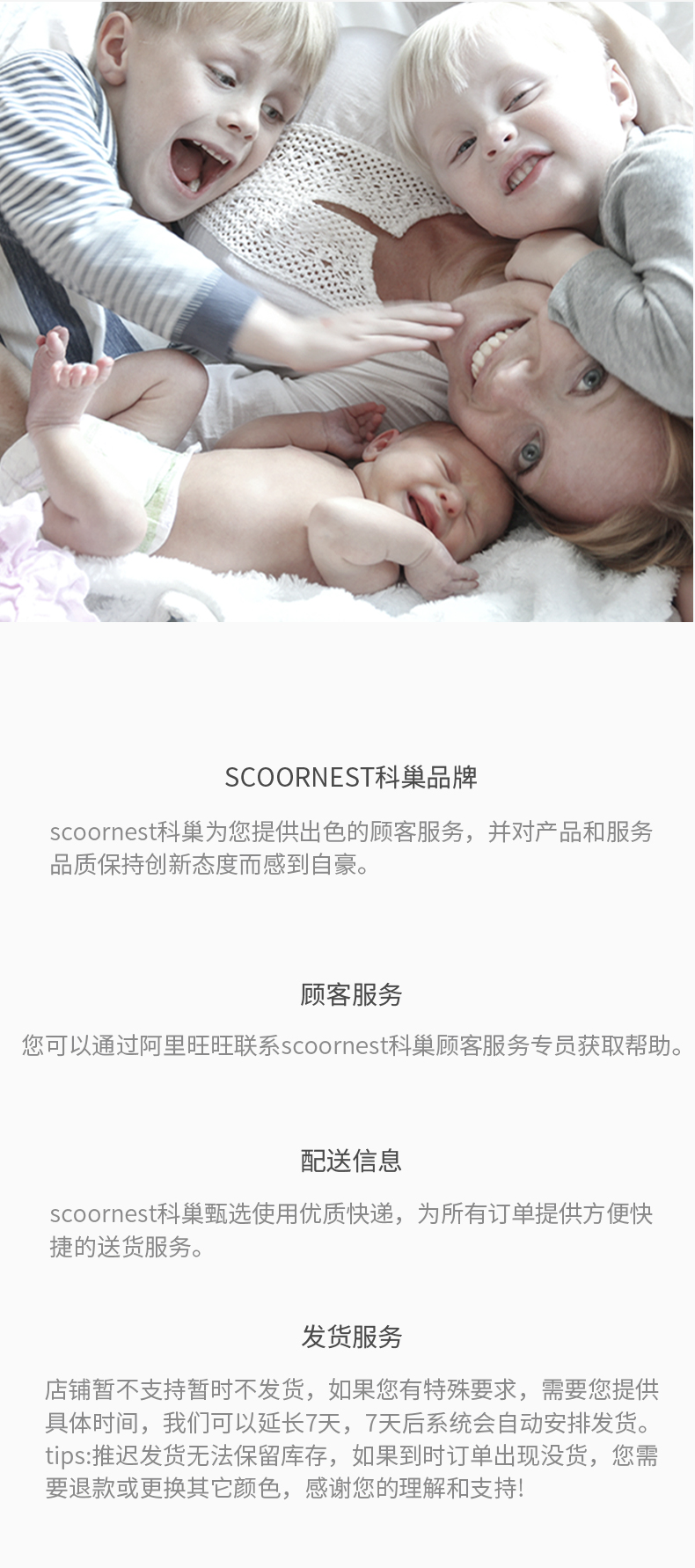 - Scoornest始终秉承给每一位宝宝送去科学的、关心的、创新的成长体验,通过提供商品和服务,使顾客形成守护、发展、巩固这种弥足珍贵的亲情的爱。