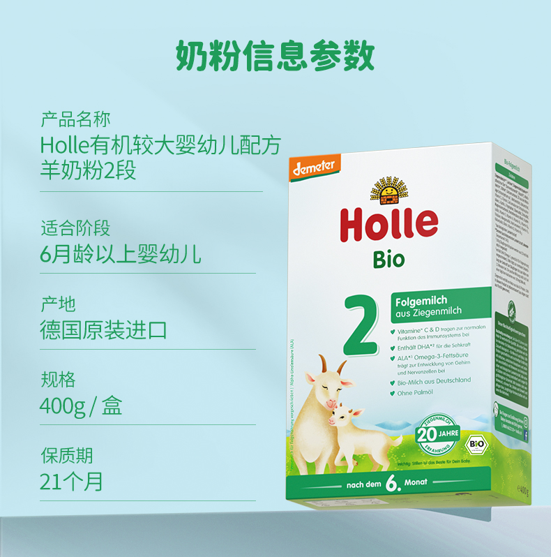 Holle(泓乐)有机婴儿配方羊奶粉2段400g/盒 添加DHA德国原装进口 好吸收 适用于6个月以上宝宝 效期到2027-2-8 含税价(未税价:228元/盒)