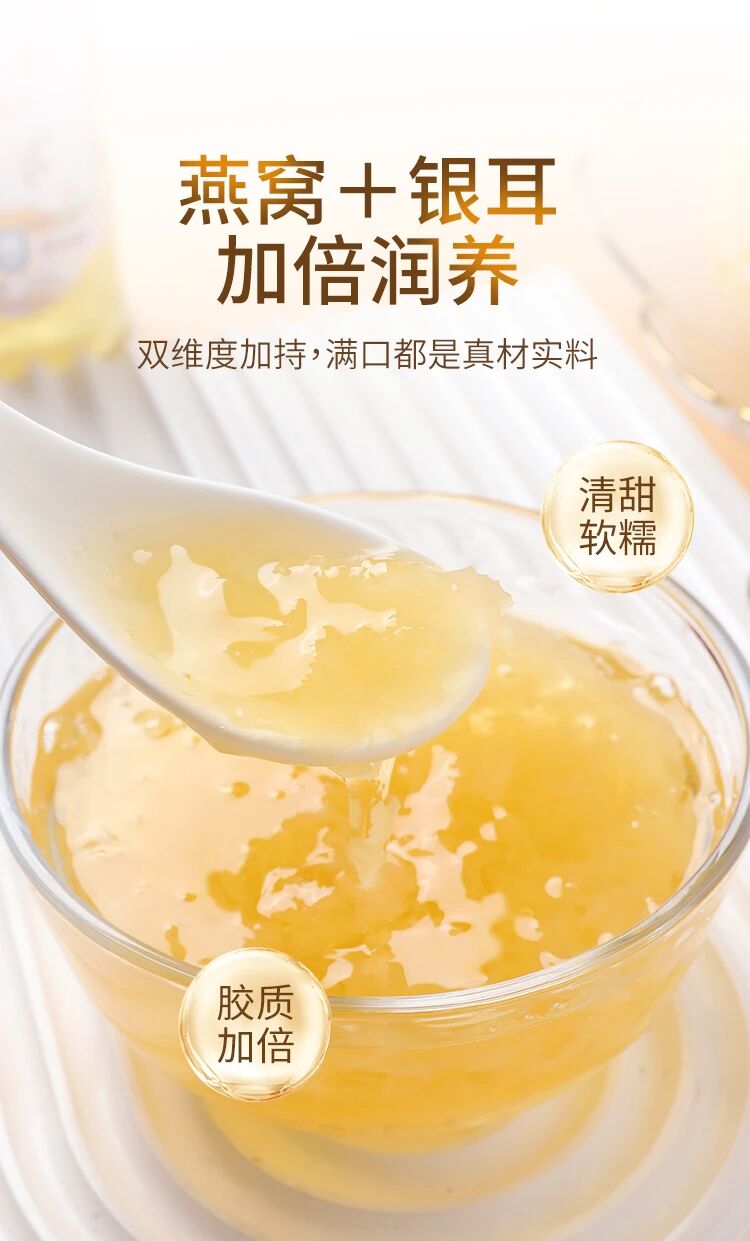 银耳汤装在罐头瓶里的时候,是新鲜的生银耳和纯净水,并不是干银耳煮烂的汤。装在罐头瓶全密封后,才用蒸汽超高温加热,把生银耳制成罐头。