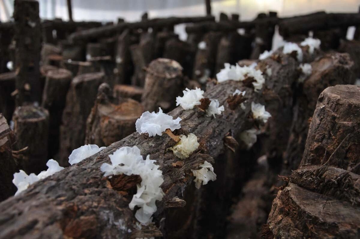传统的段木栽培,银耳长在七年以上的青冈木段上,会有一个特别硬的“根”。因为根要长到木头里面,还会有黑色的部分。由于木质并不疏松,银耳得到的营养不够,长得不够健壮大朵。