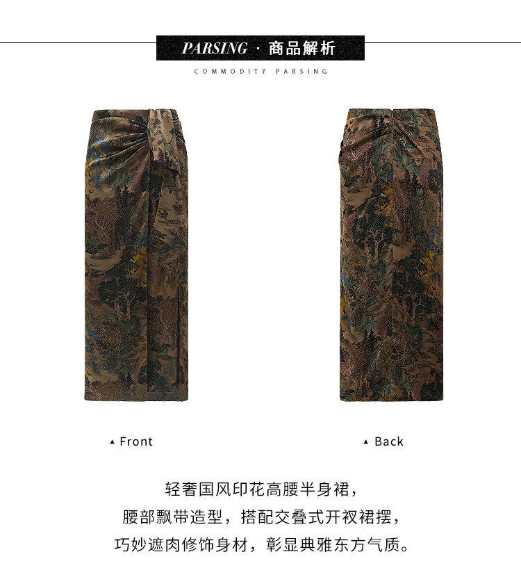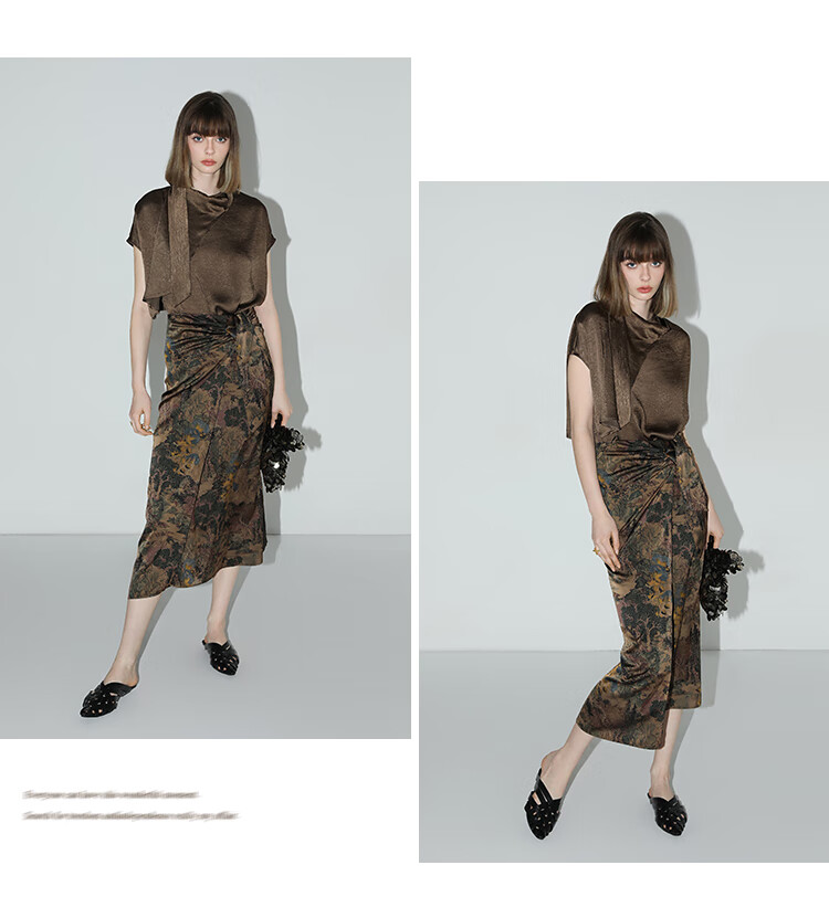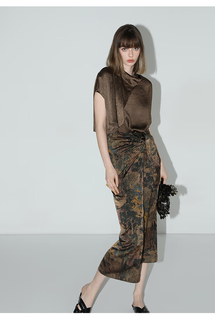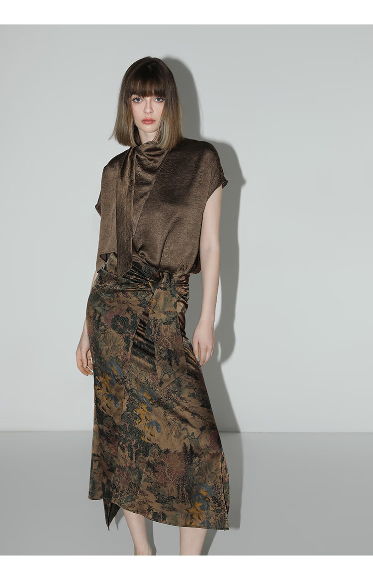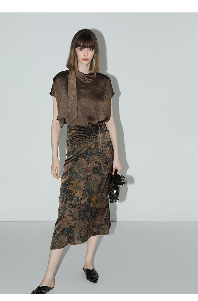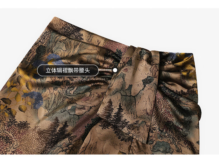 【限时秒杀】COCOBELLA轻奢新国风飘带印花半身裙高腰捏褶缎面筒裙HS0018