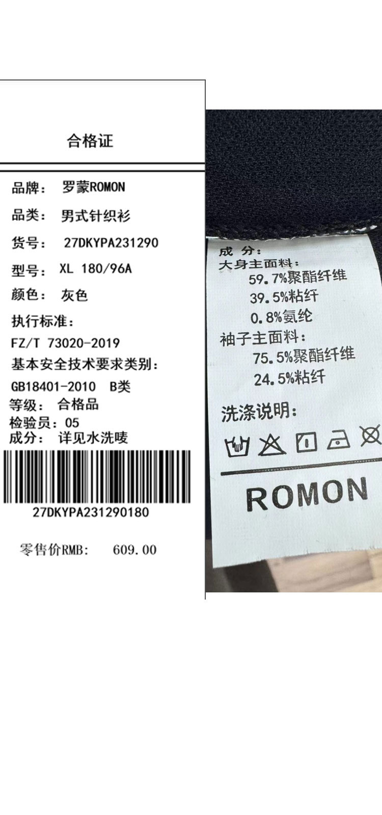 大身主面料:59.7%聚酯纤维 39.5%粘纤 0.8%氨纶