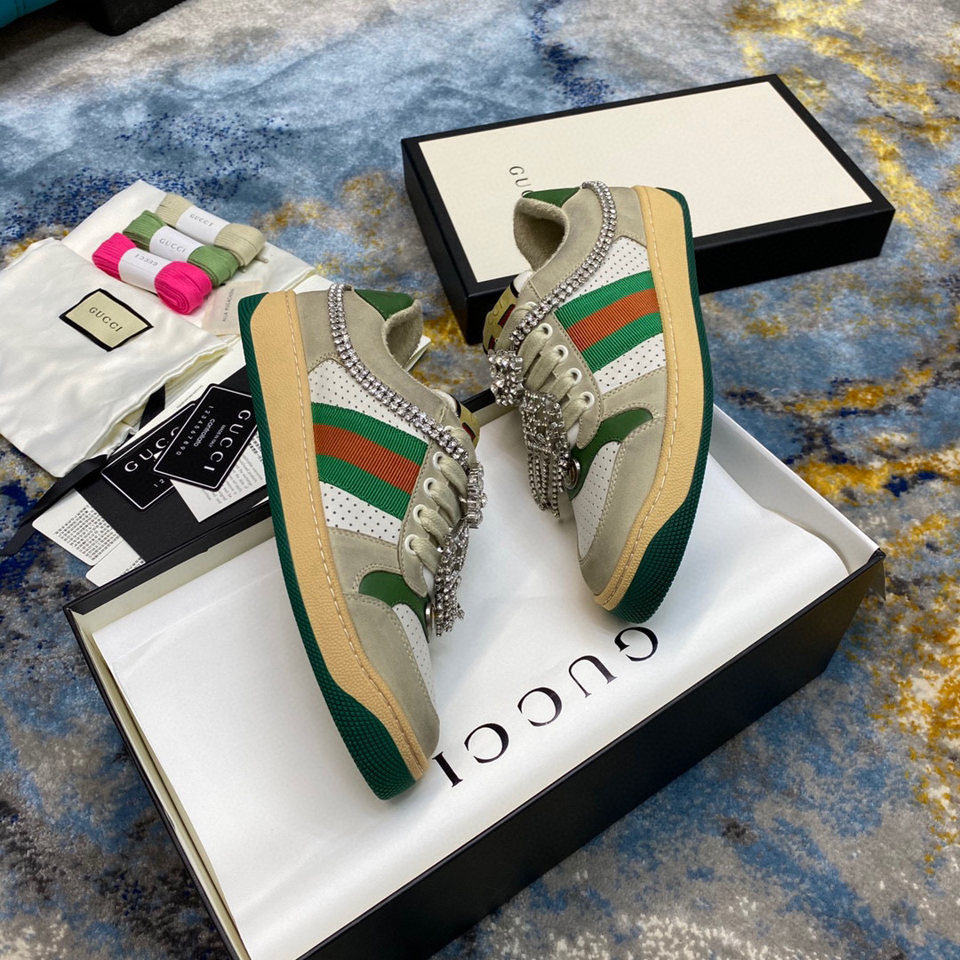 鞋面擦色牛皮拼接经典双G布面料,皮面切口全油边封口工艺,原版毛巾布里细腻柔软更舒适透气,垫脚乳胶注塑一体,私模钢印双色原版TPU大底(下层宽,上层窄)