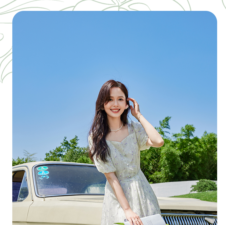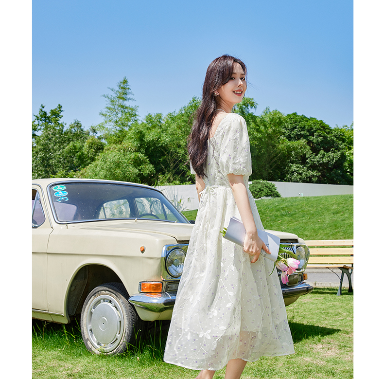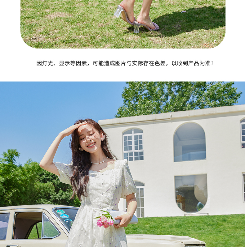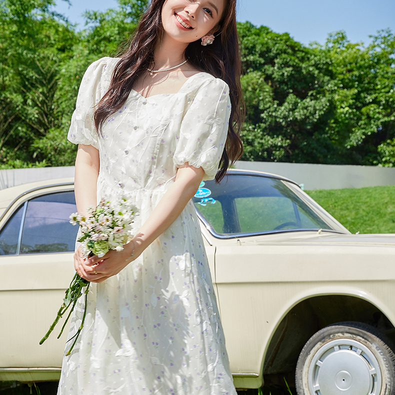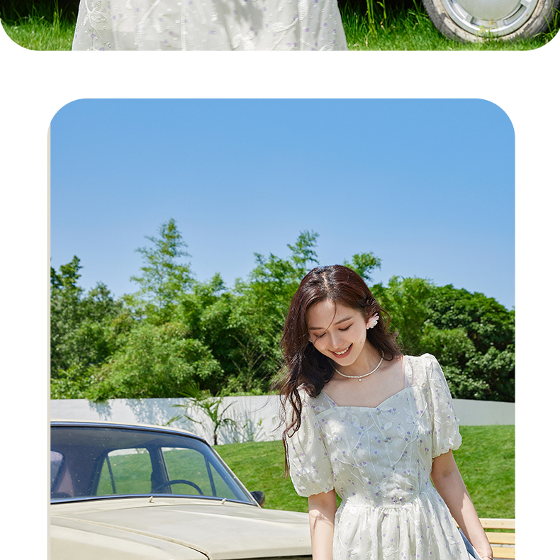 VICTORIA&VERA夏季新款法式小清新方领初恋系温柔风绣花肌理感连衣裙