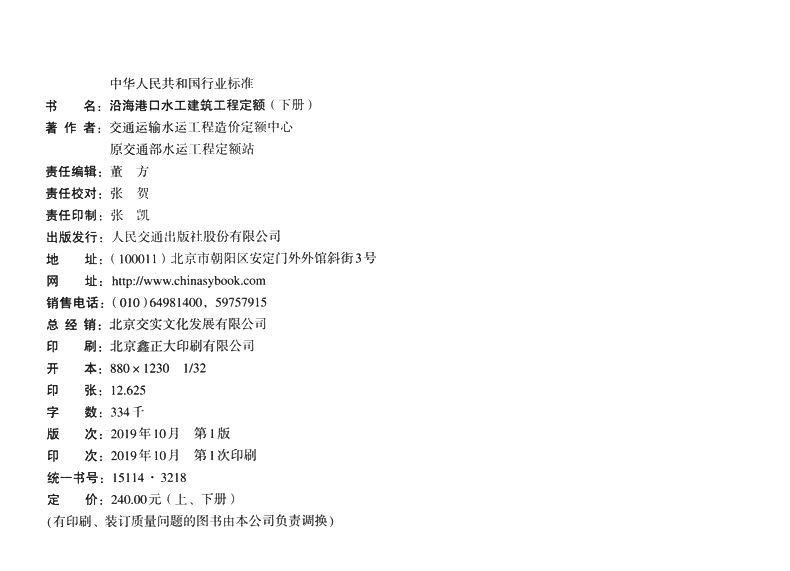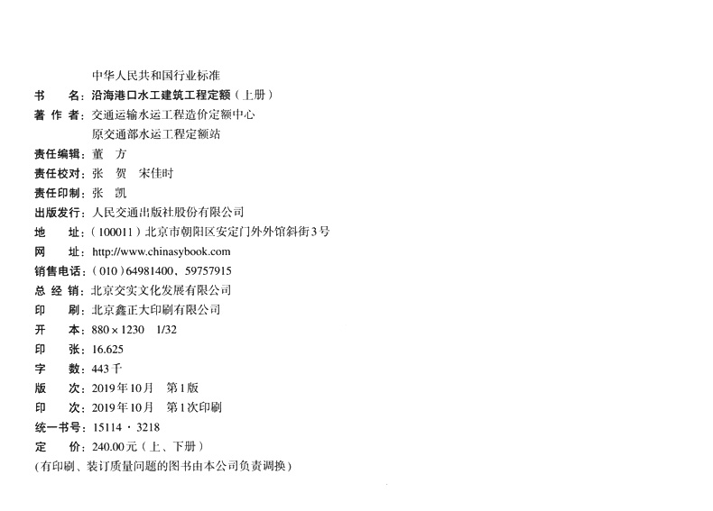 书名:沿海港口水工建筑工程定额(上下册)(JTS/T276-1-2019)