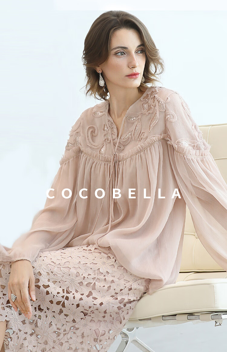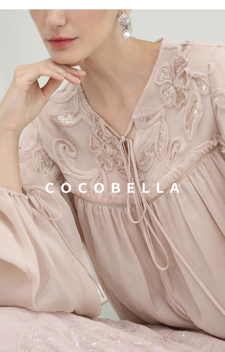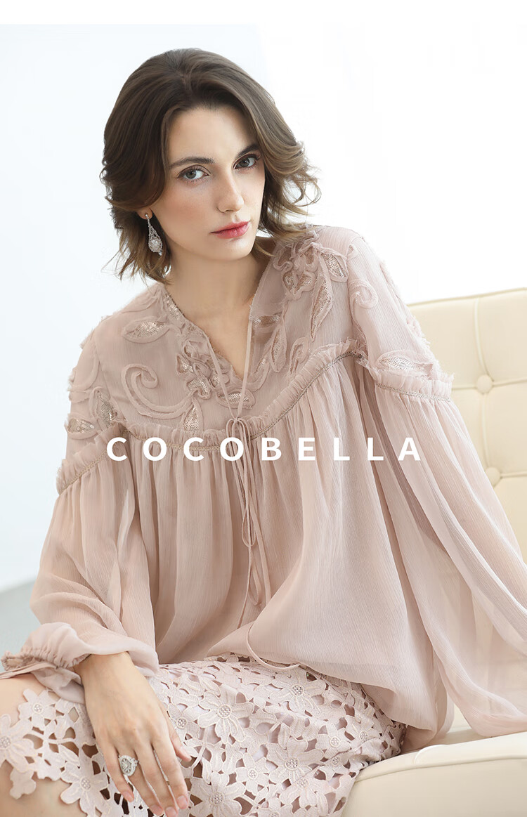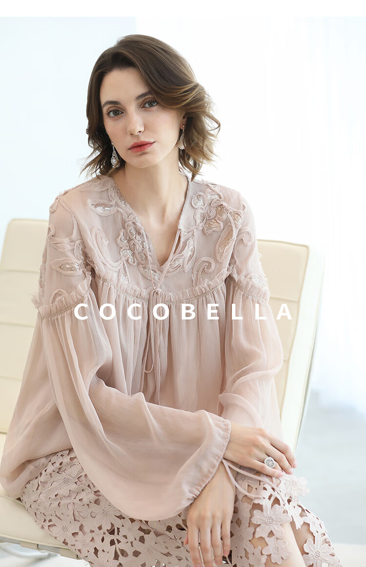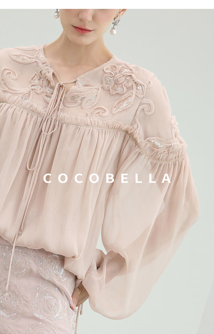 COCOBELLA名媛风玫瑰金盘花刺绣仙女上衣女仿真丝衬衫SR3212