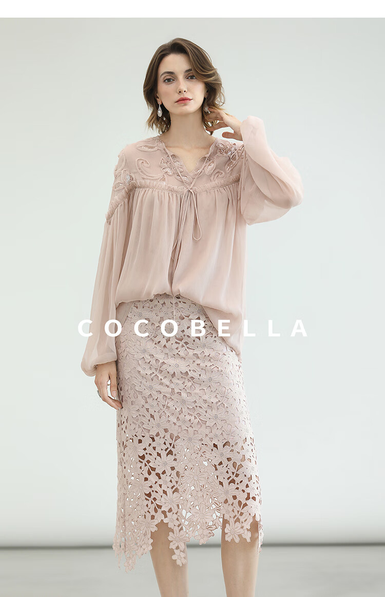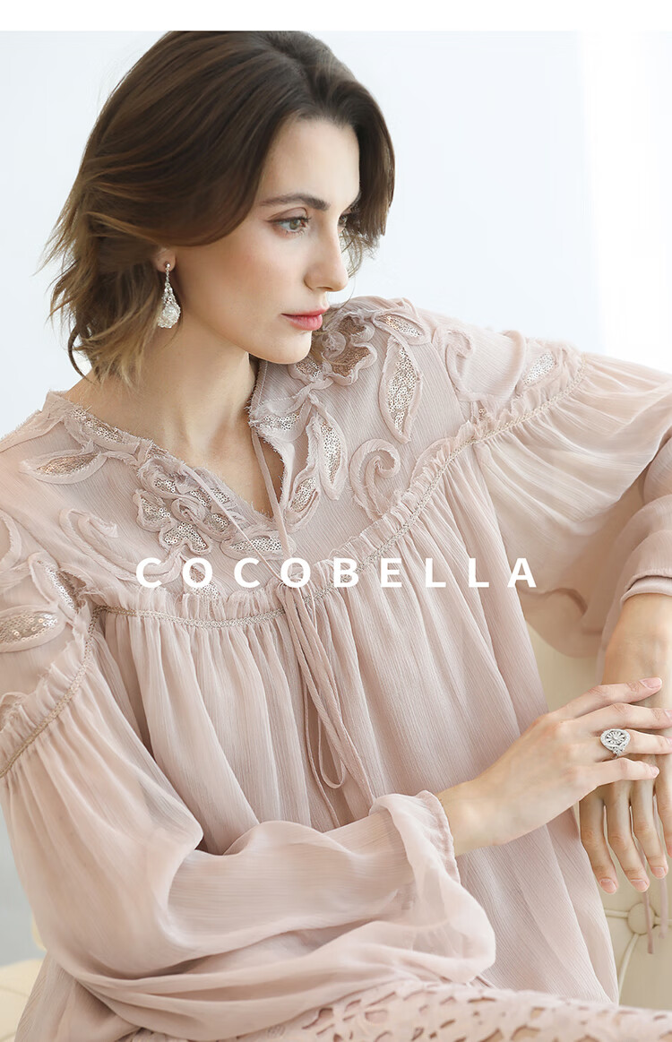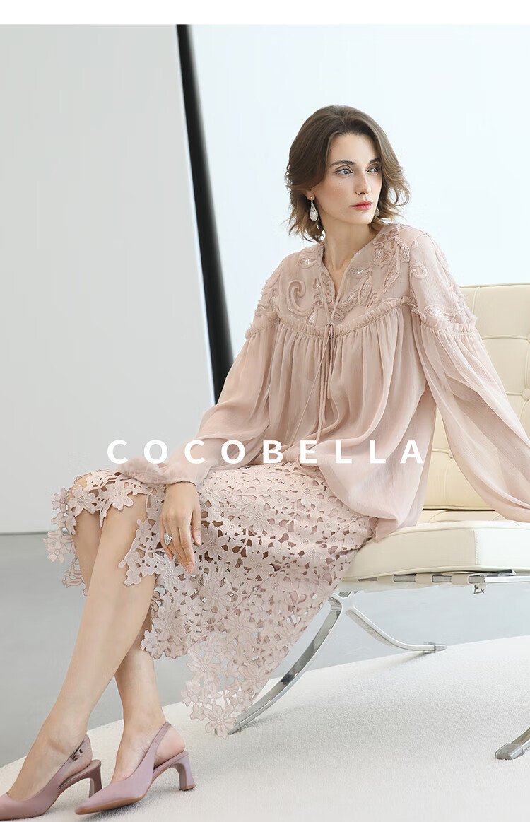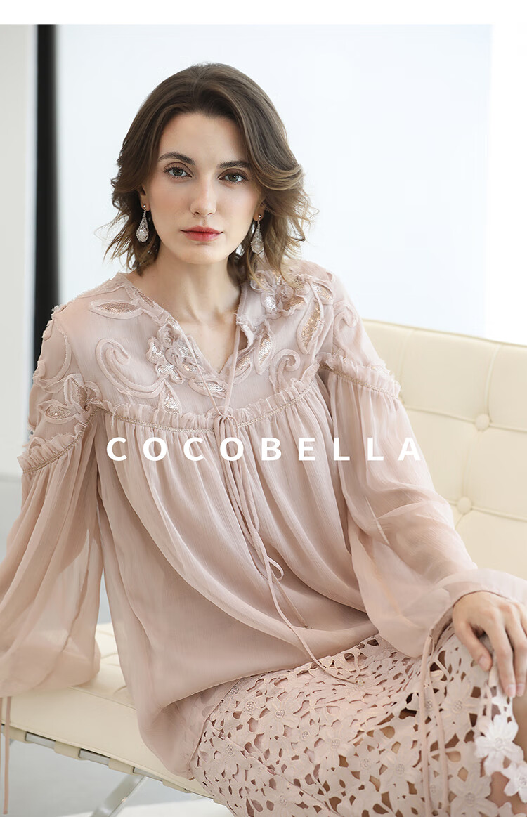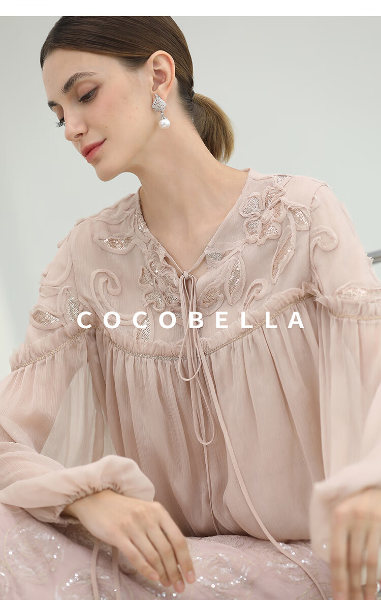 COCOBELLA名媛风玫瑰金盘花刺绣仙女上衣女仿真丝衬衫SR3212