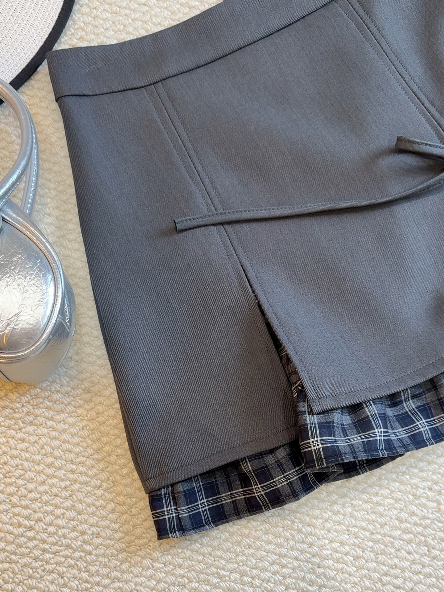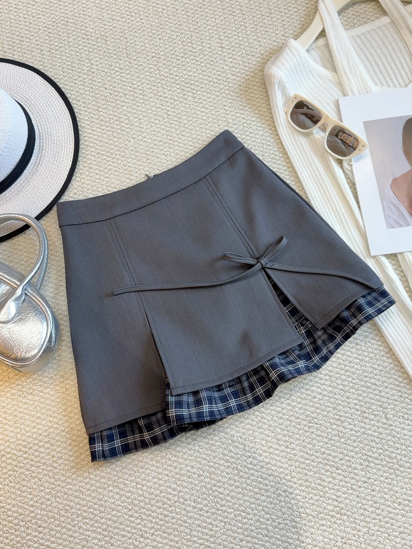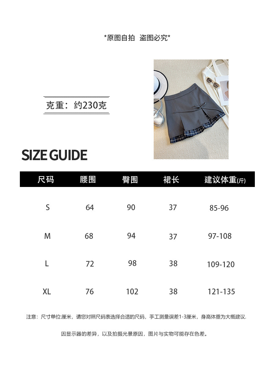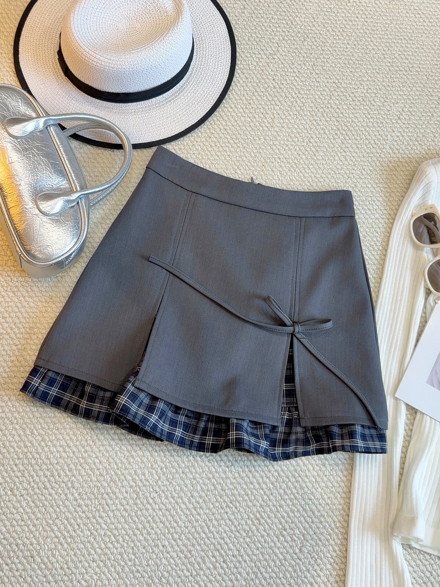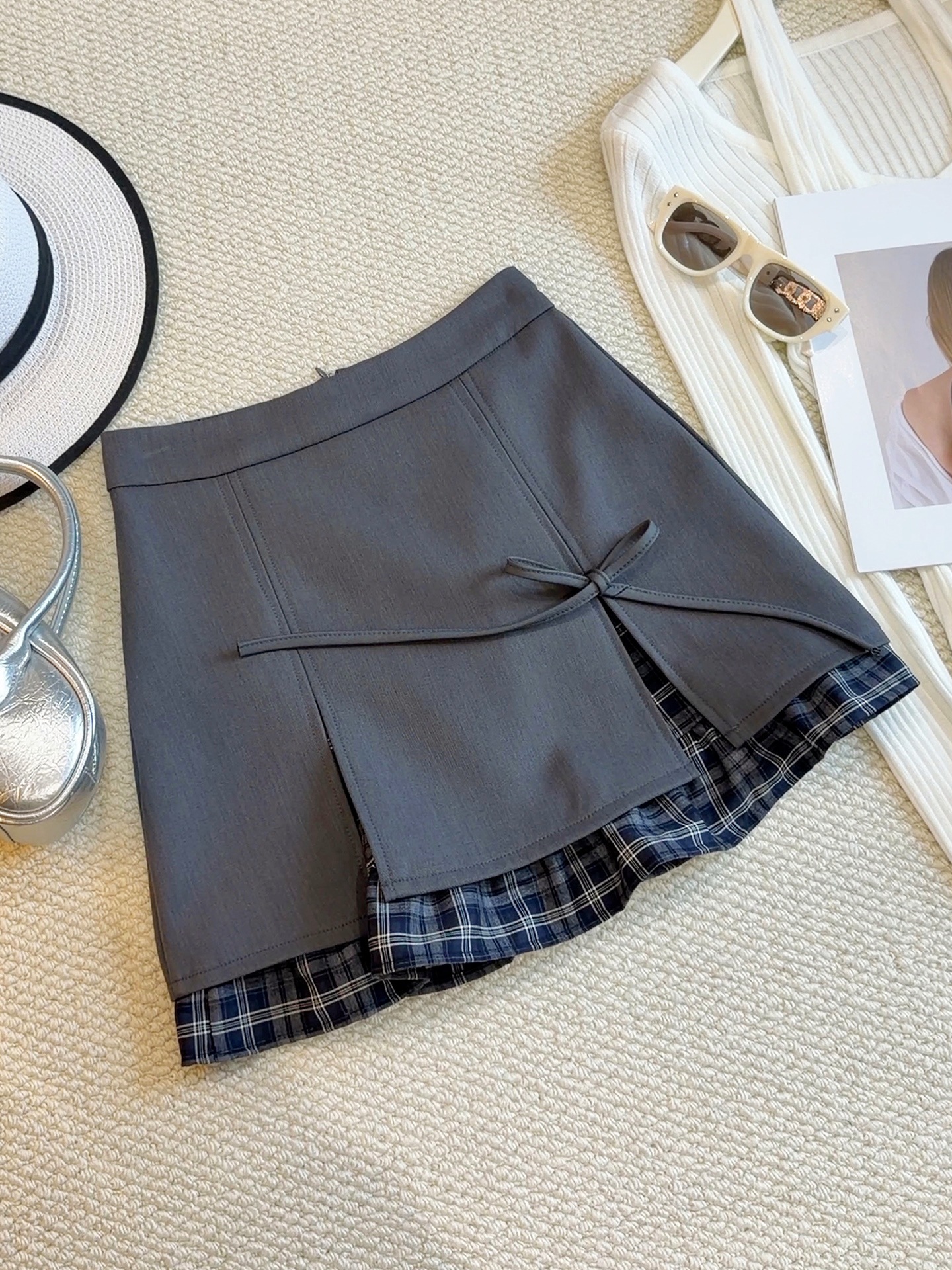 【小众设计款!高腰A字裙】春季格子拼接开叉西装半身裙 女2026新品气质灰色时尚高腰A字短裙