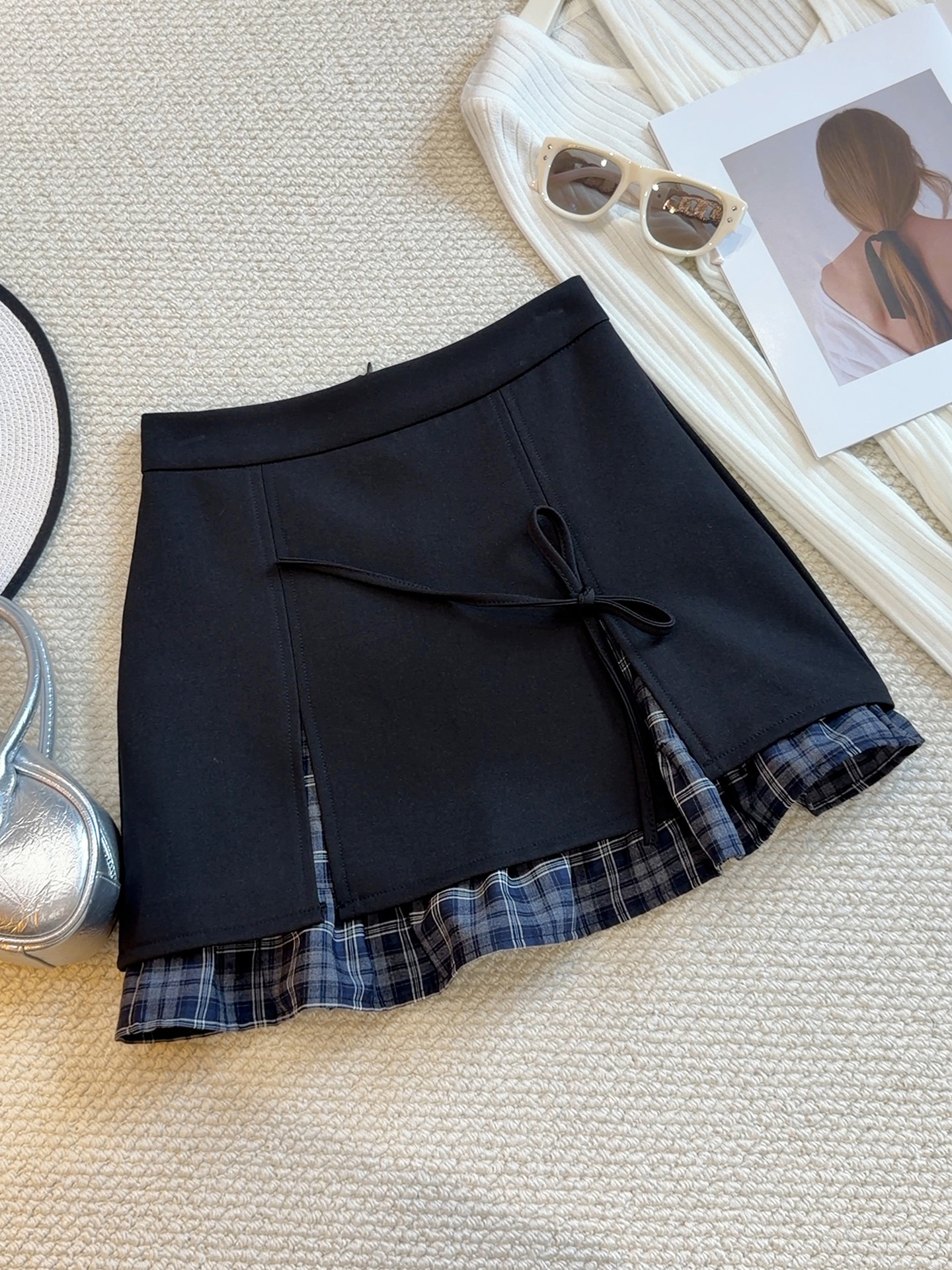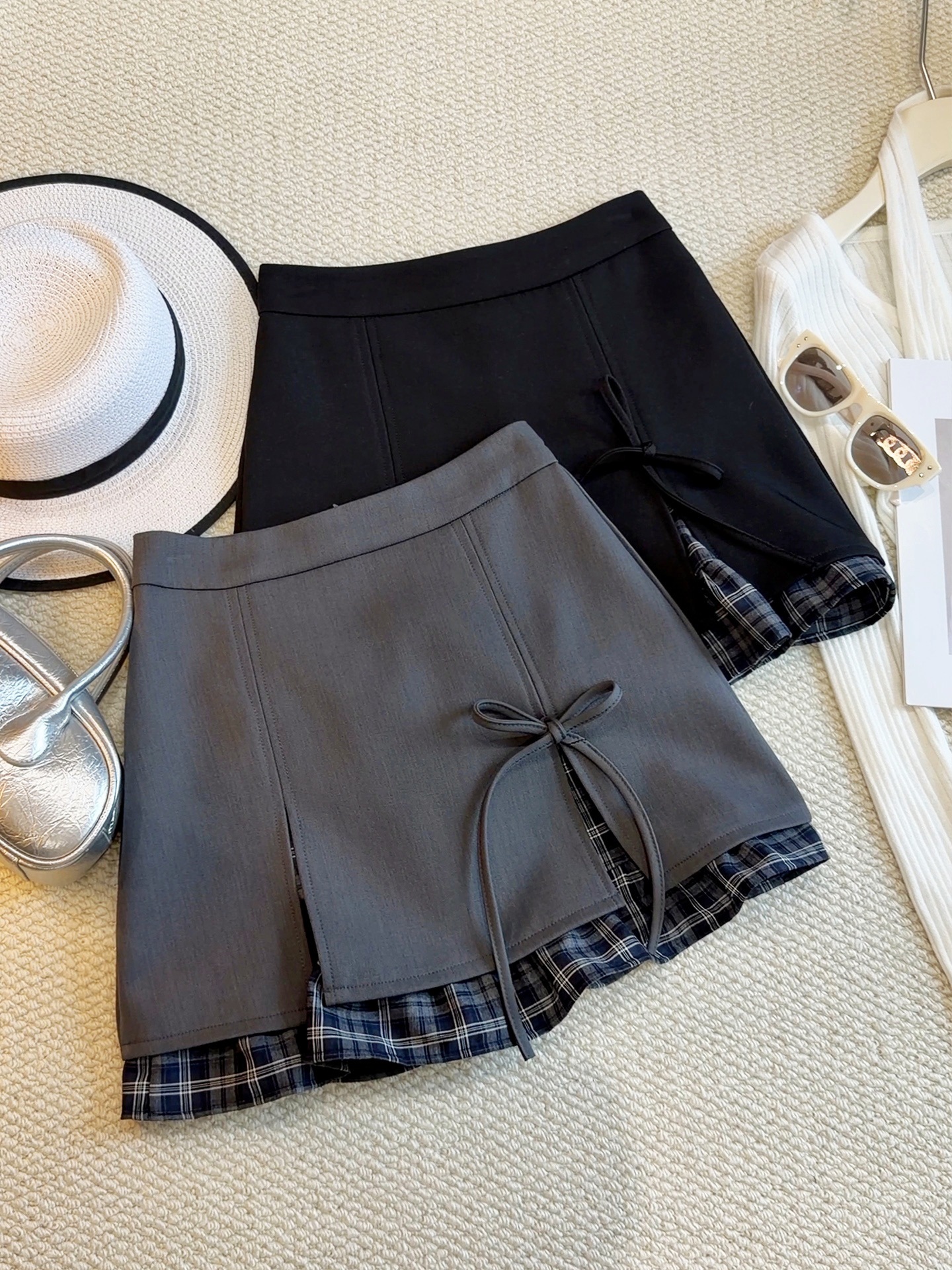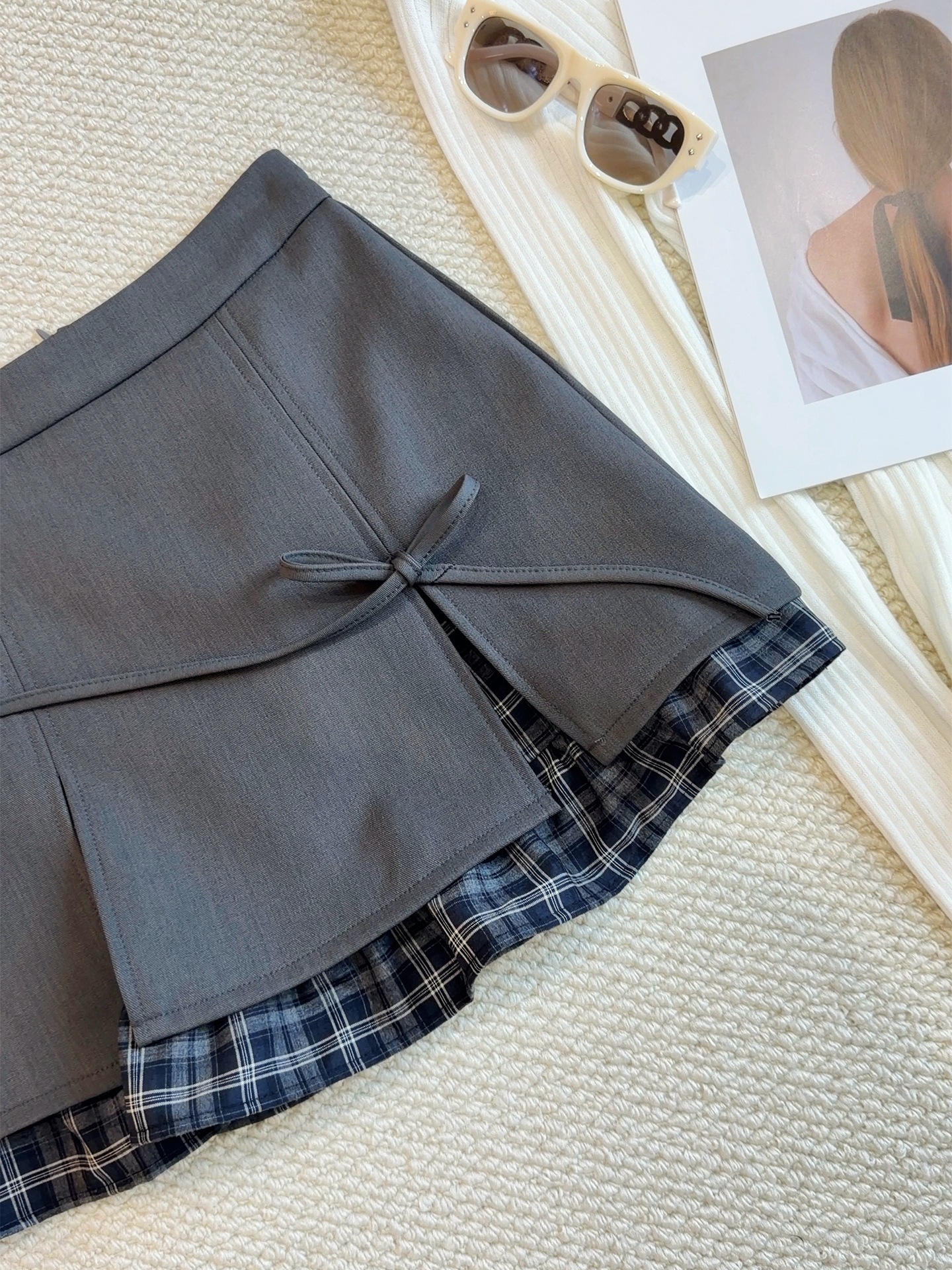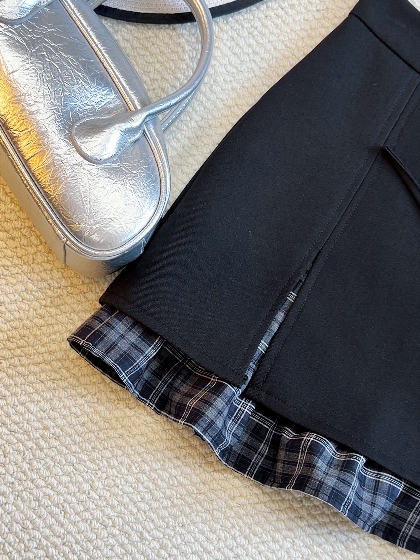 【小众设计款!高腰A字裙】春季格子拼接开叉西装半身裙 女2026新品气质灰色时尚高腰A字短裙