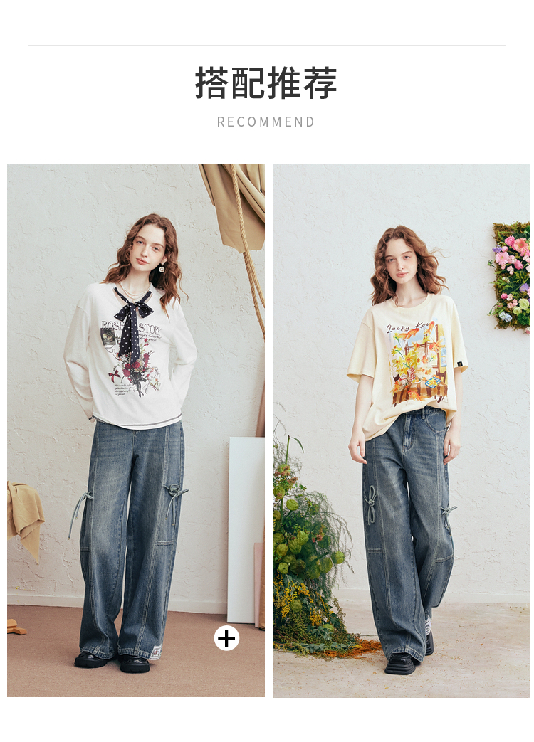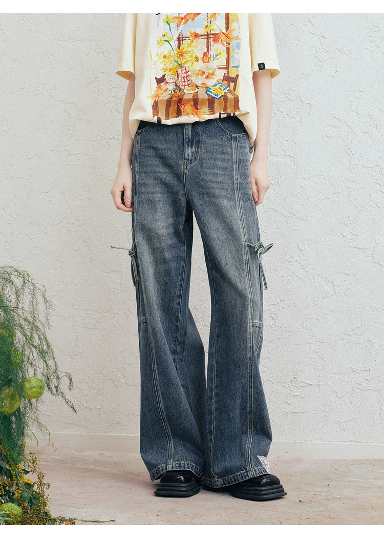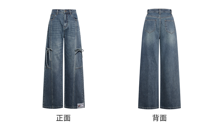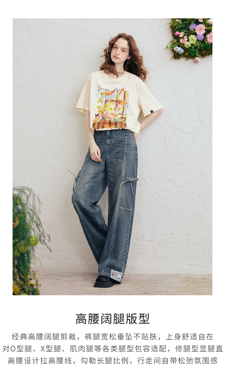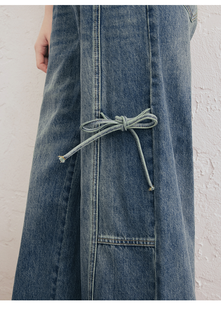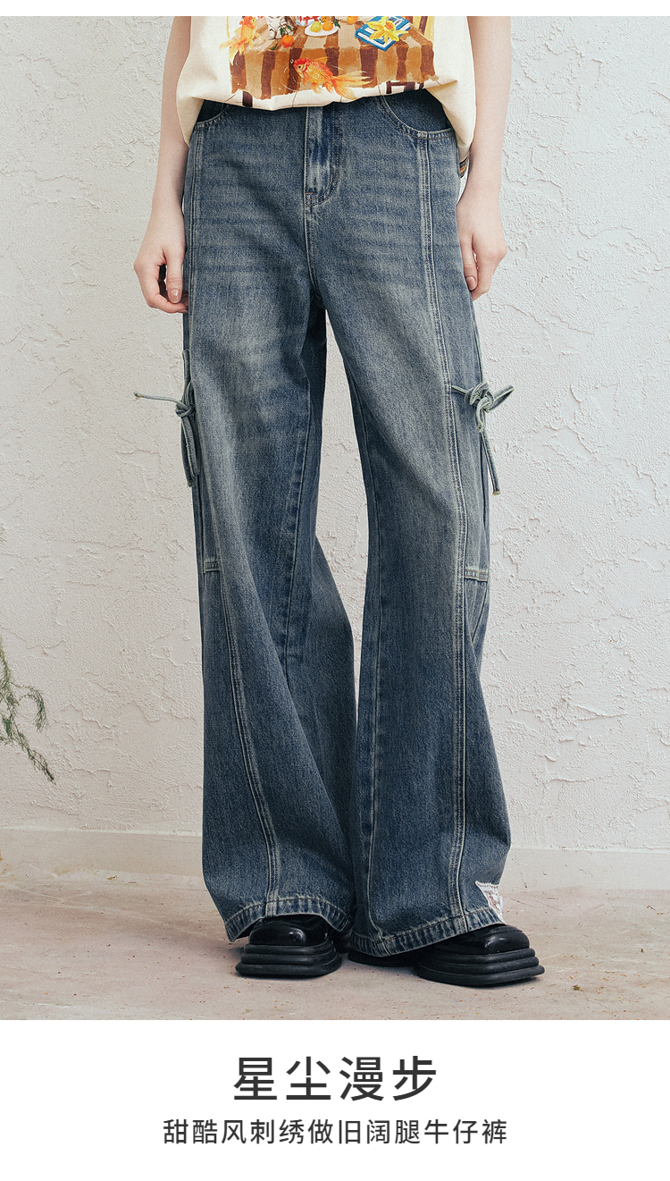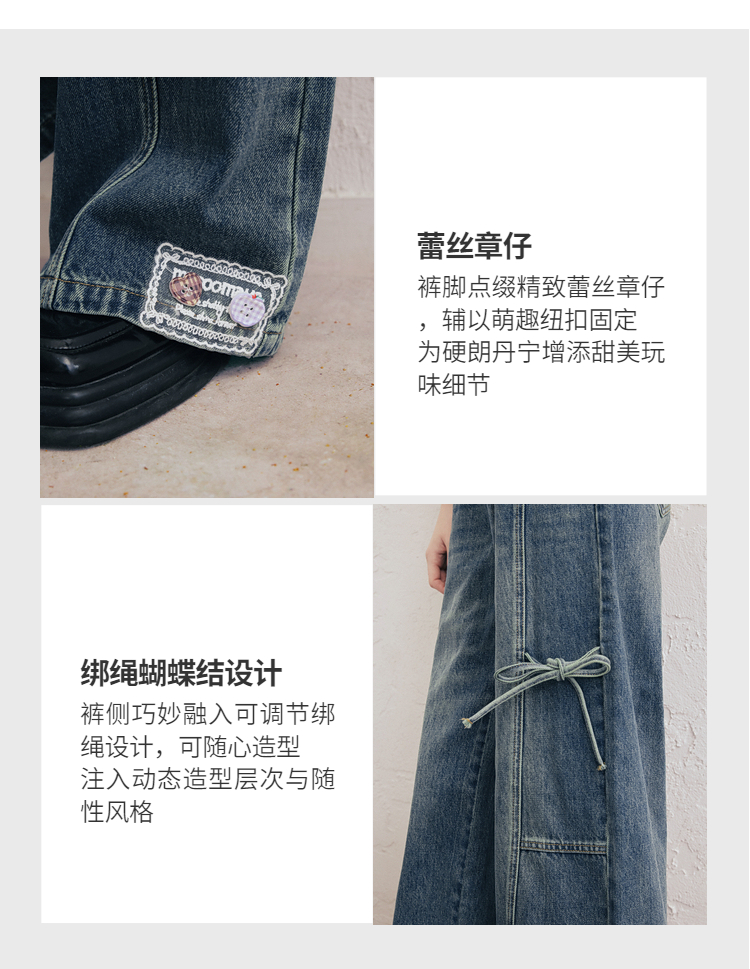 两三事星尘漫步2026春季新款复古绑带蝴蝶结蕾丝章仔阔腿牛仔裤女