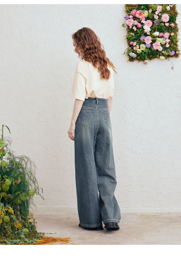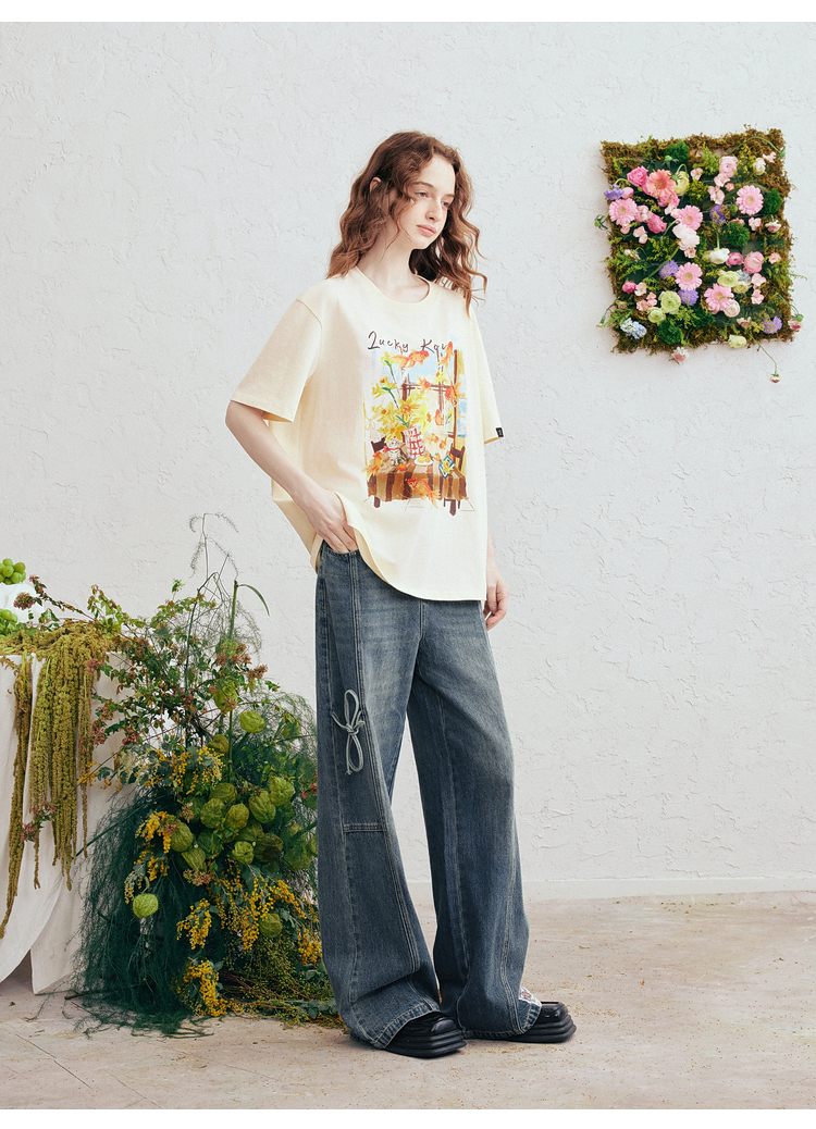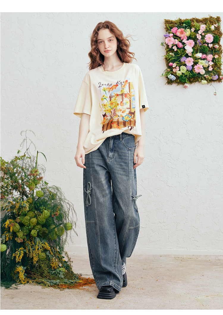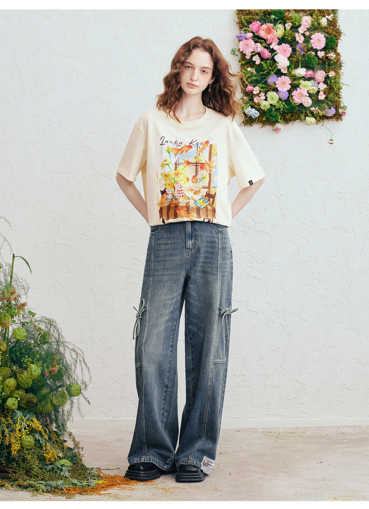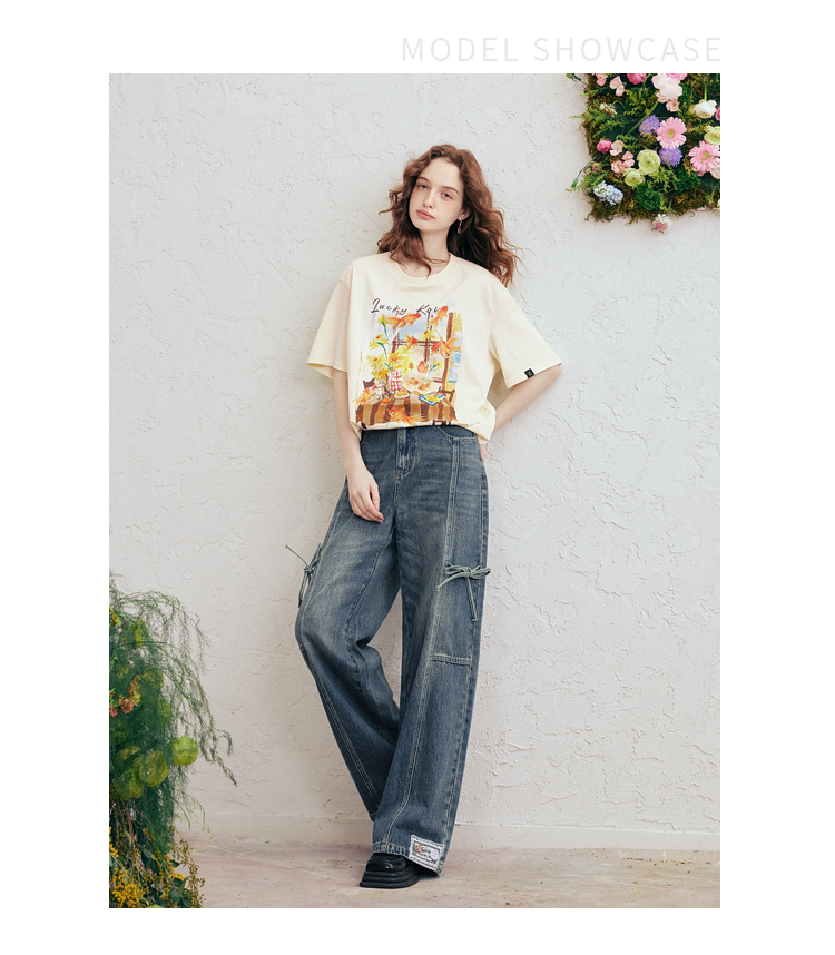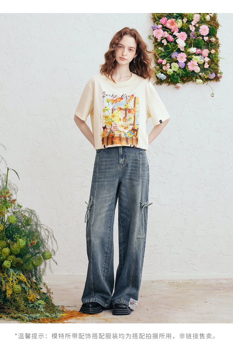两三事星尘漫步2026春季新款复古绑带蝴蝶结蕾丝章仔阔腿牛仔裤女