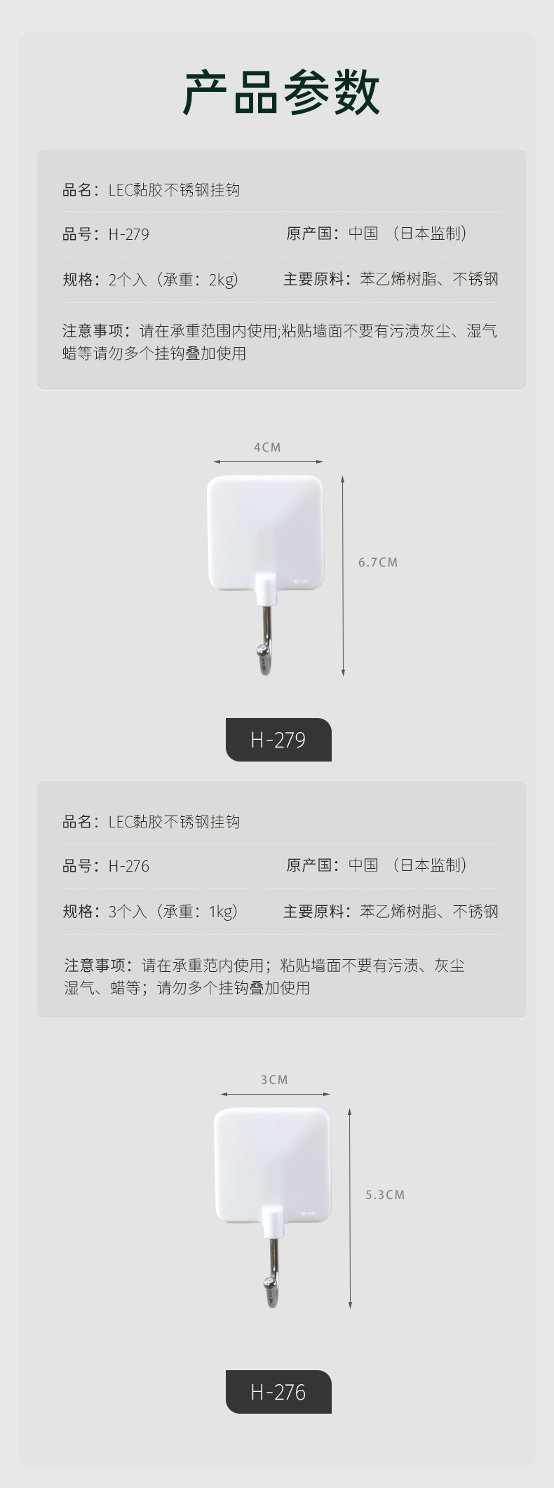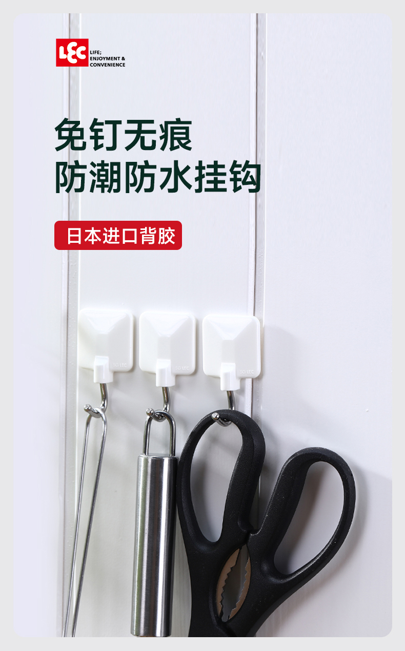 日本LEC墙壁不锈钢挂钩无痕粘胶免打孔强力粘贴厨房墙面墙上免钉挂钩
