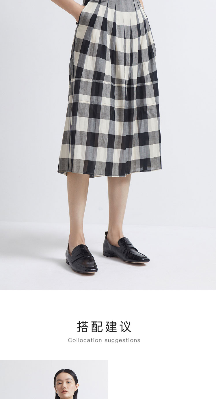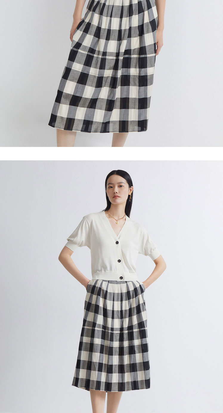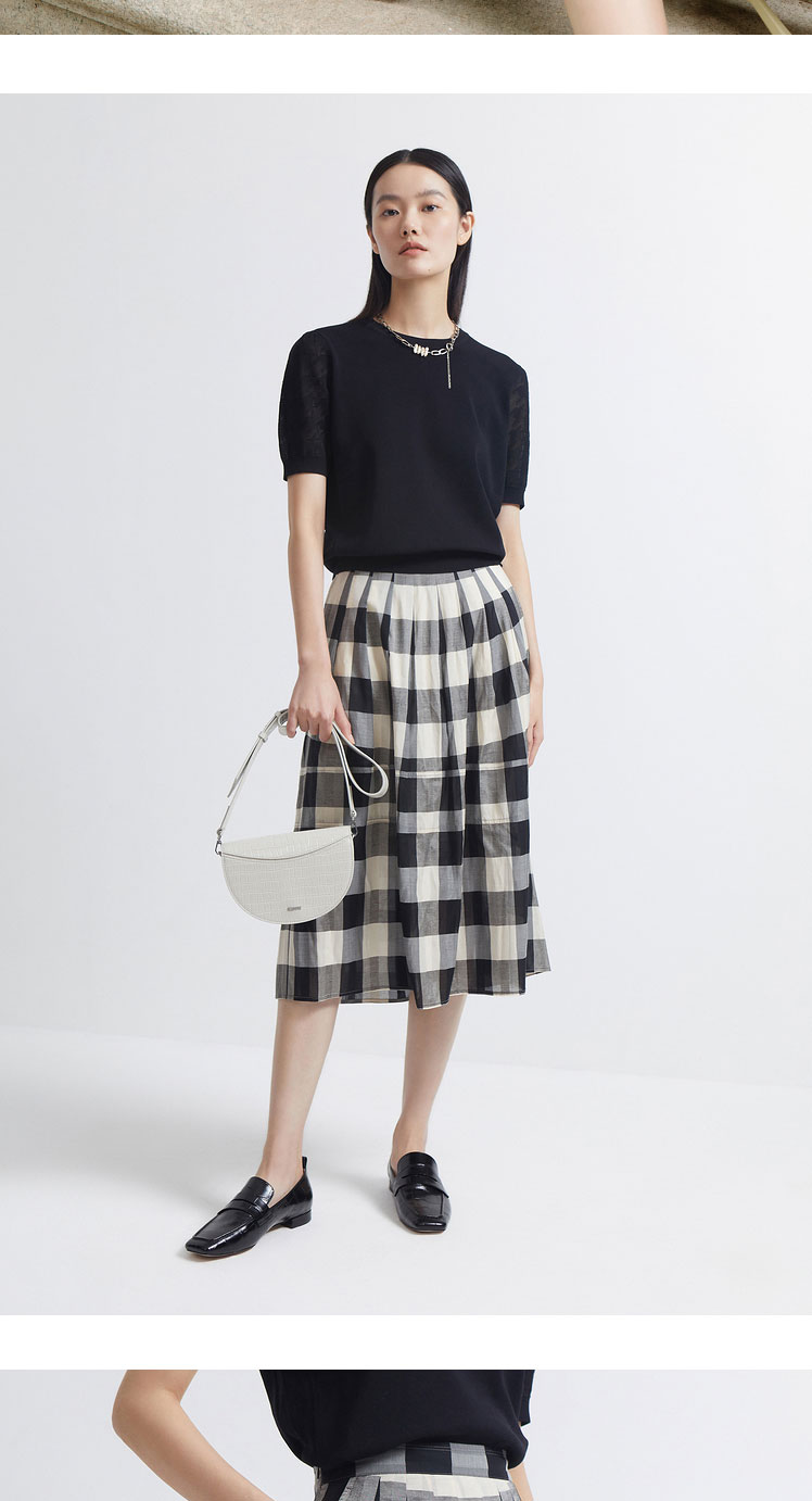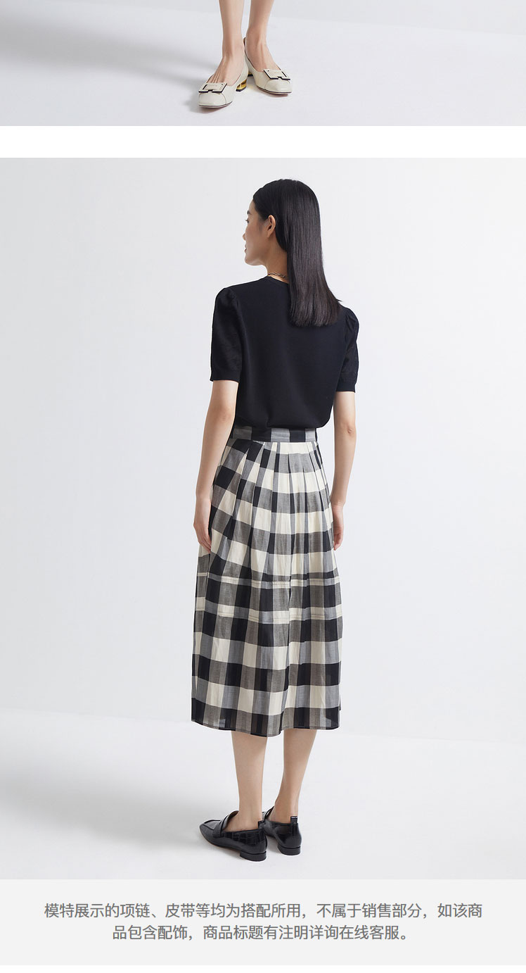 INSUN恩裳2022夏季新款时尚黑白撞色格纹层次感收褶醋酸半身裙9C32250050