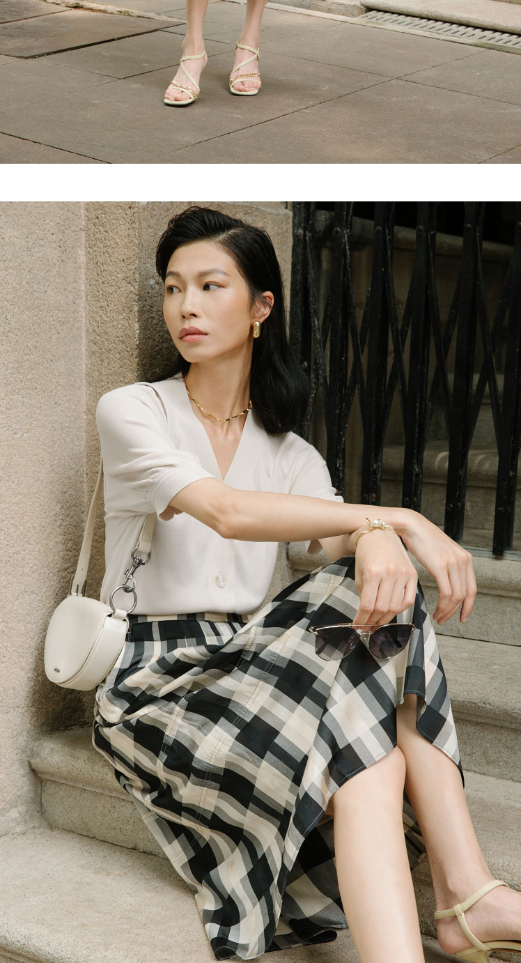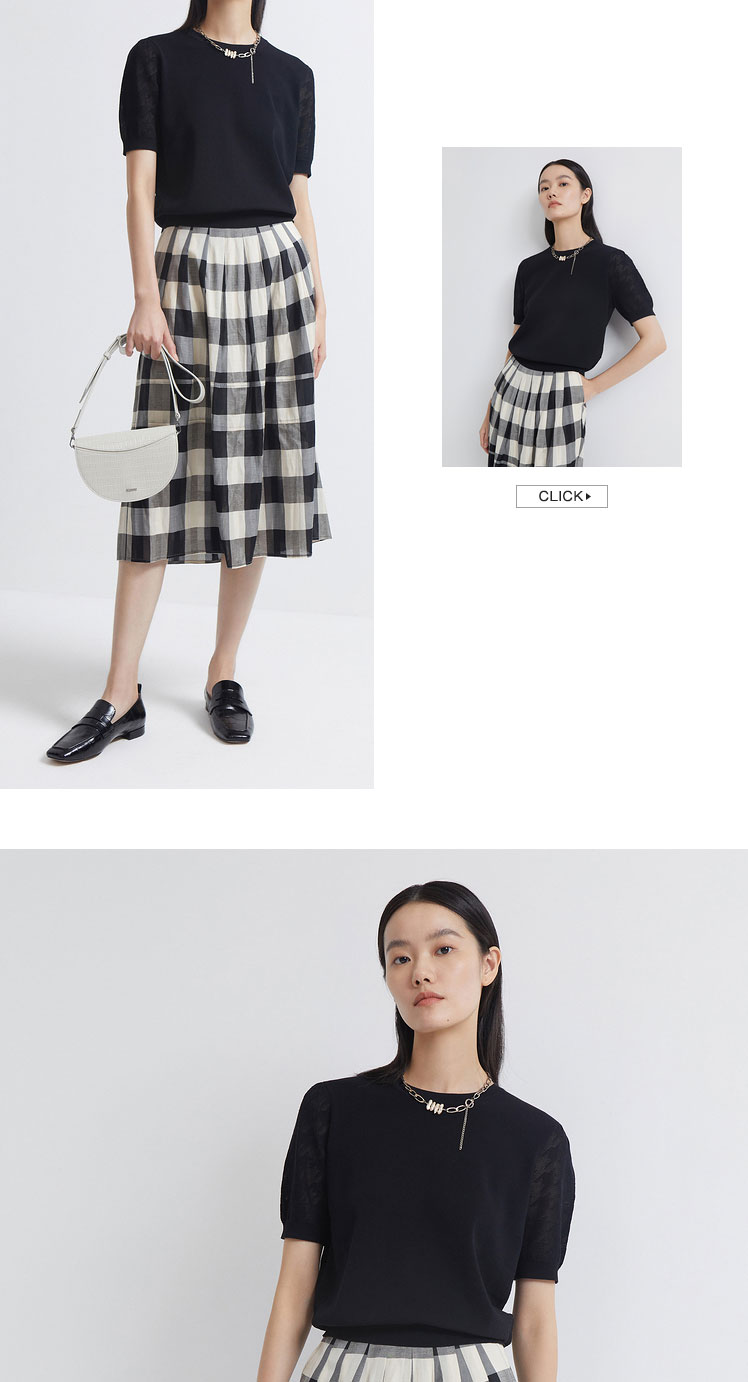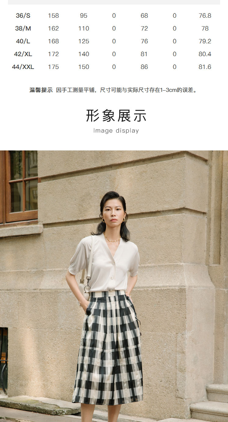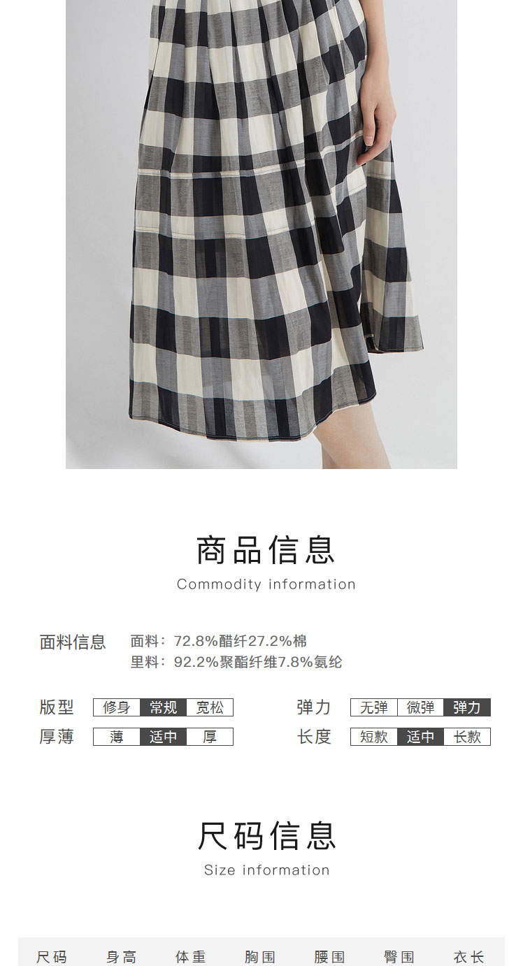 INSUN恩裳2022夏季新款时尚黑白撞色格纹层次感收褶醋酸半身裙9C32250050