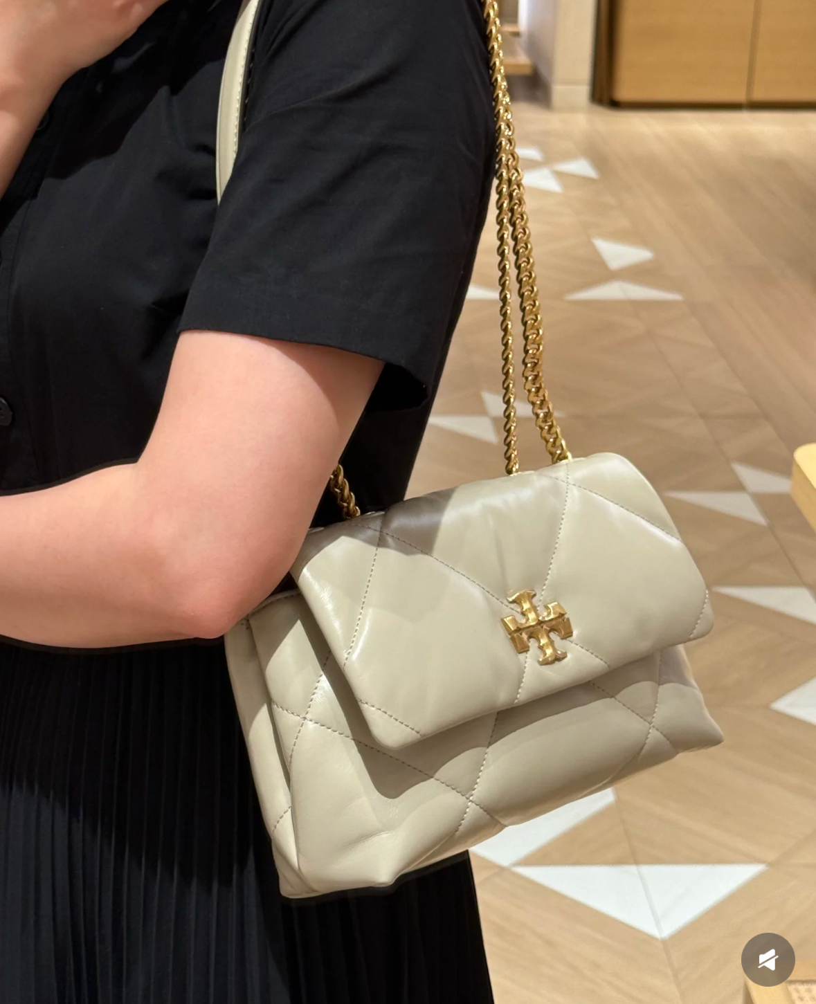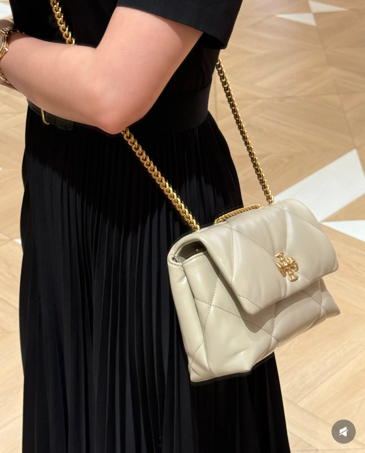 TORY BURCH 汤丽柏琦 KIRA 小号菱格纹肩背包女包 154706-251奶灰色 Kira 菱格纹绗缝小号肩背包,材质柔软耐用,菱格纹绗缝呈现立体蓬松感,质地轻柔,时尚舒适。配有斜纹双T饰件。通过调节折叠链条带可随心变换背法,折叠可单肩背,放长可斜挎。