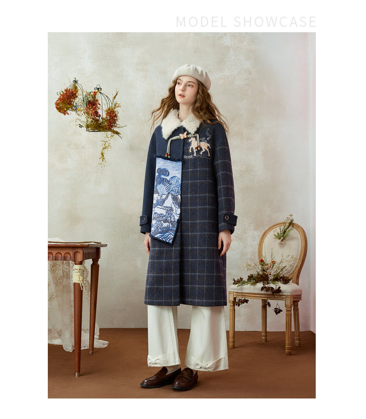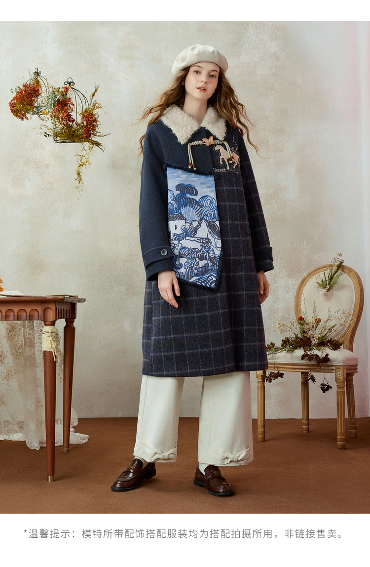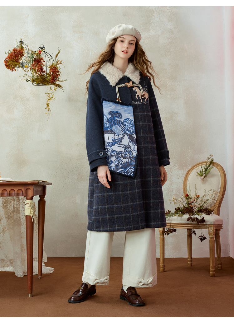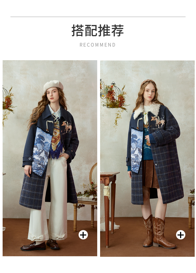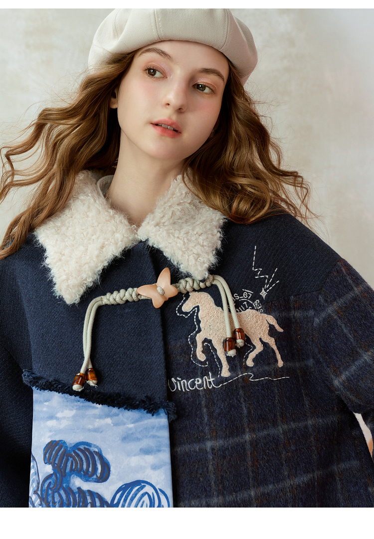 【暖冬内购】两三事梵高文艺云雾漫枝2025冬新款毛绒领印花拼接格子毛呢外套女