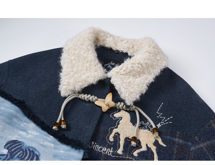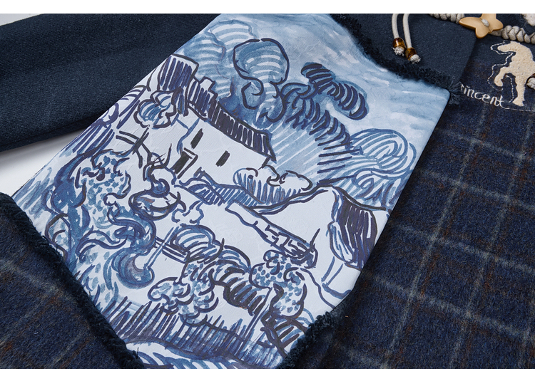 【暖冬内购】两三事梵高文艺莱茵河畔2025秋冬款印花拼接拼色海军领毛呢外套女