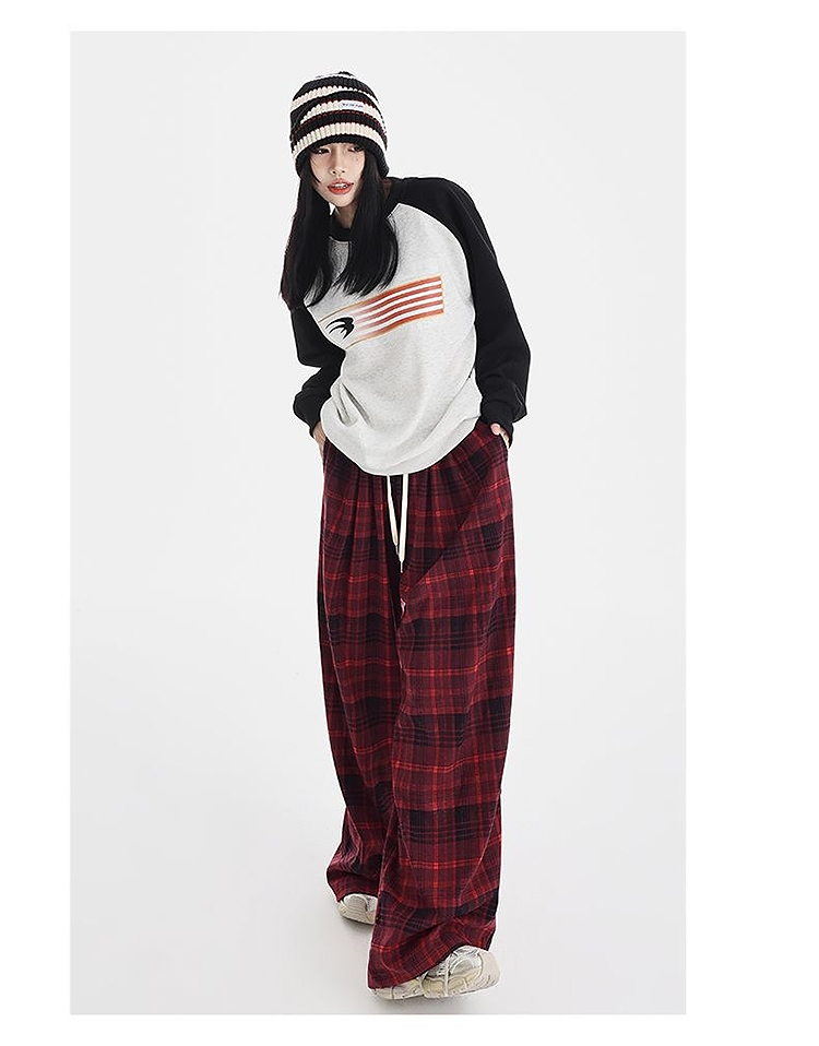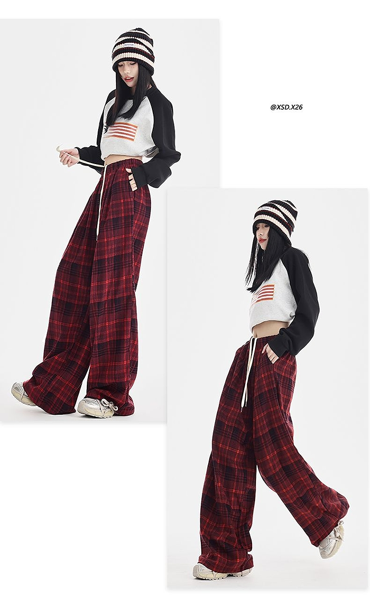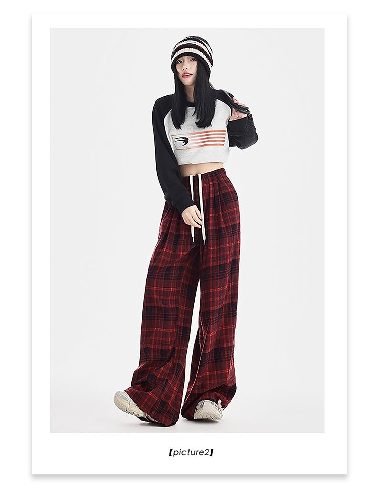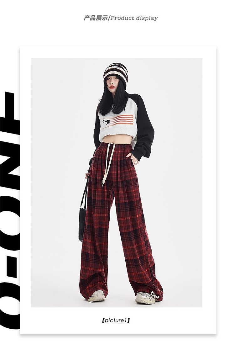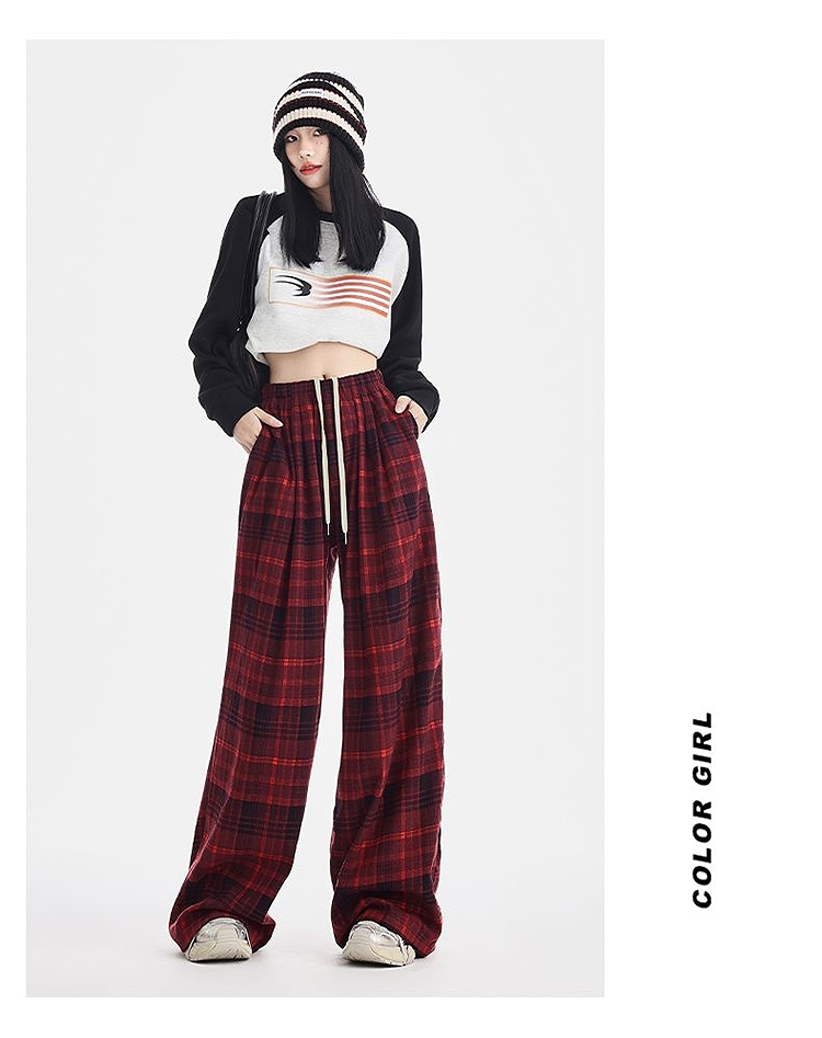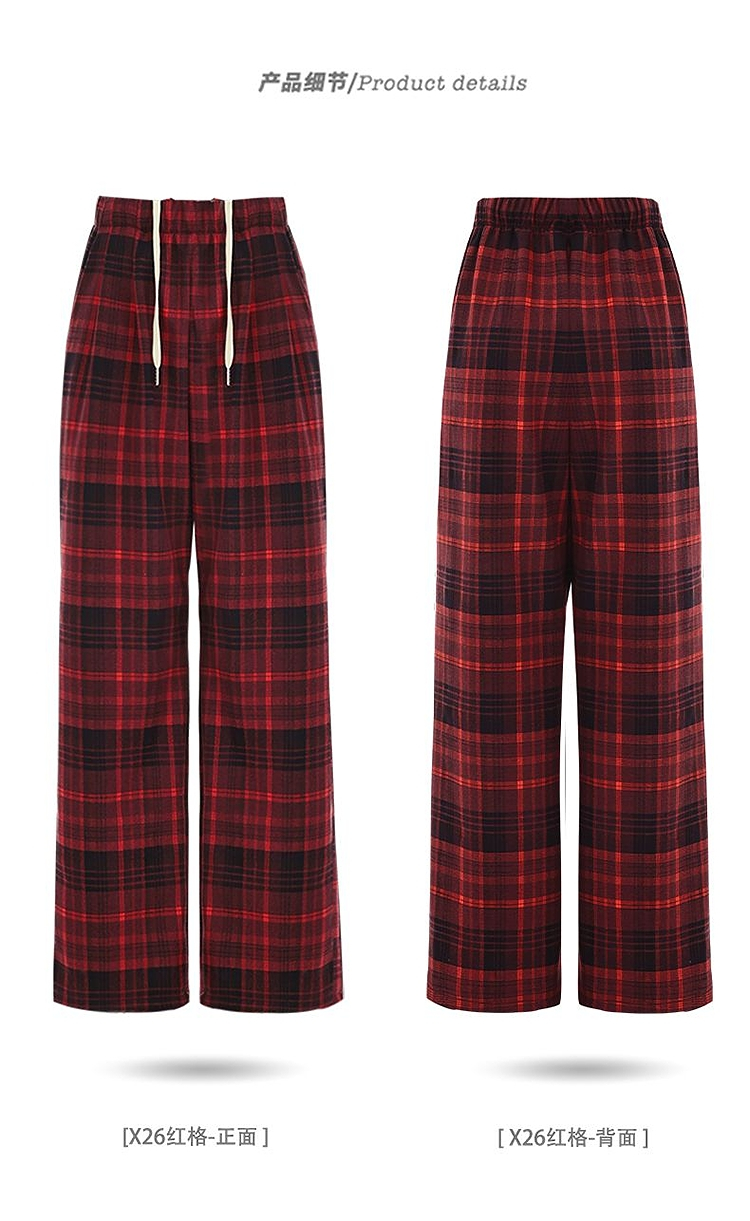 西遇格子宽松休闲裤女秋季新款红色高腰抽绳直筒阔腿裤子SS051377