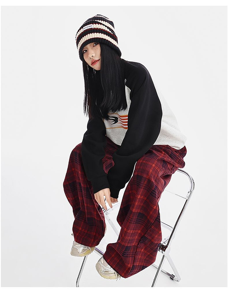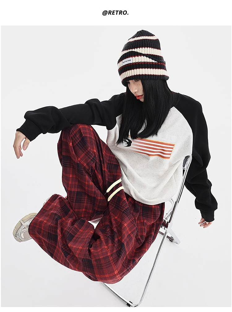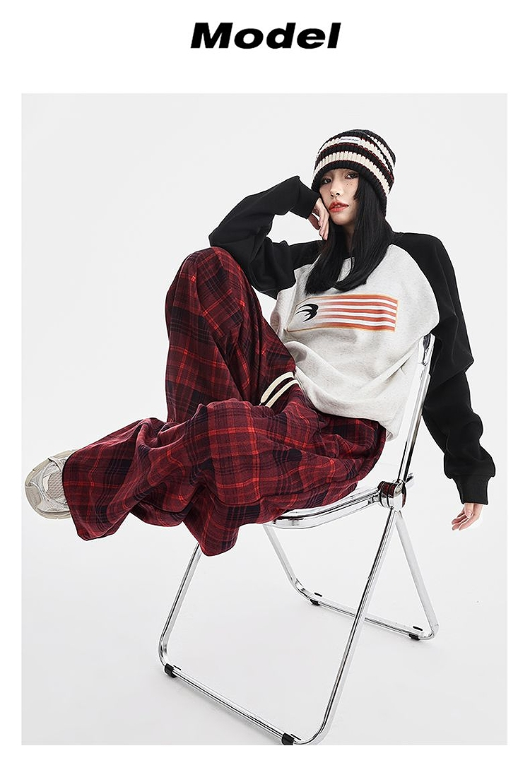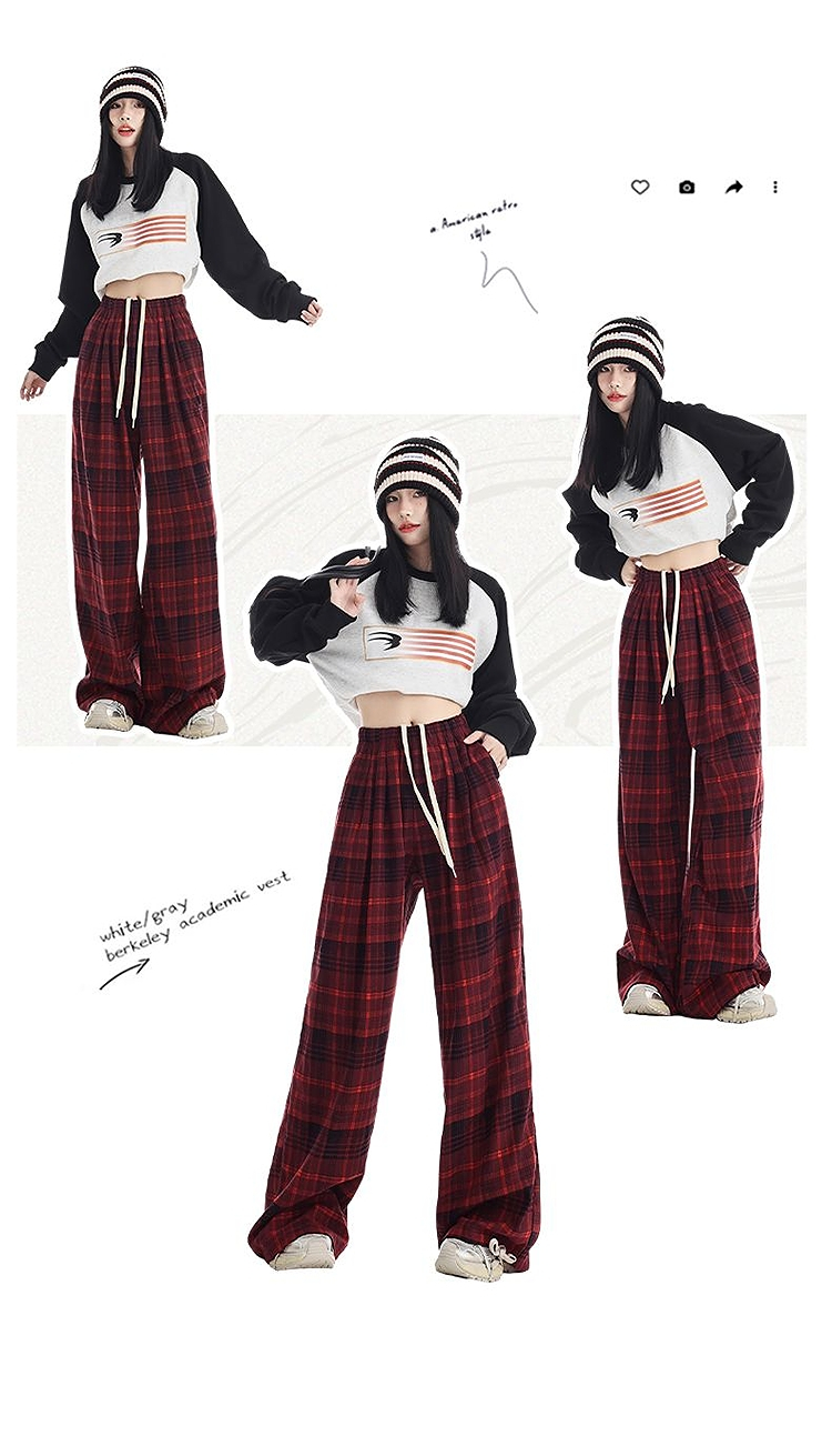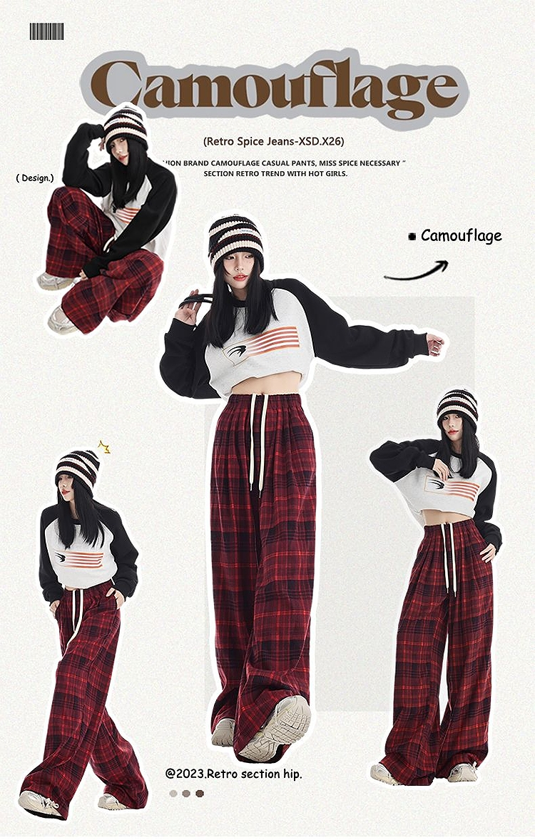西遇格子宽松休闲裤女秋季新款红色高腰抽绳直筒阔腿裤子SS051377