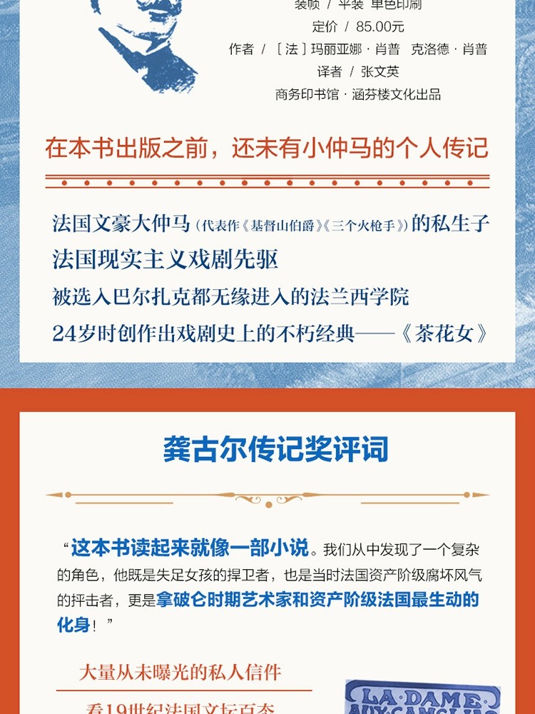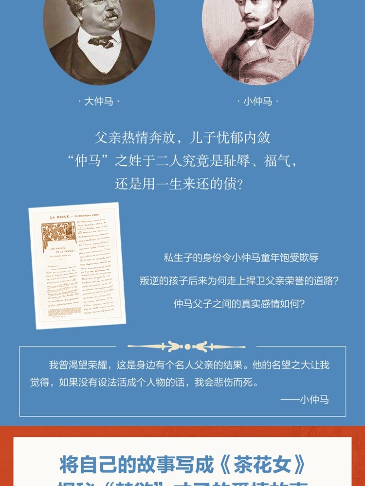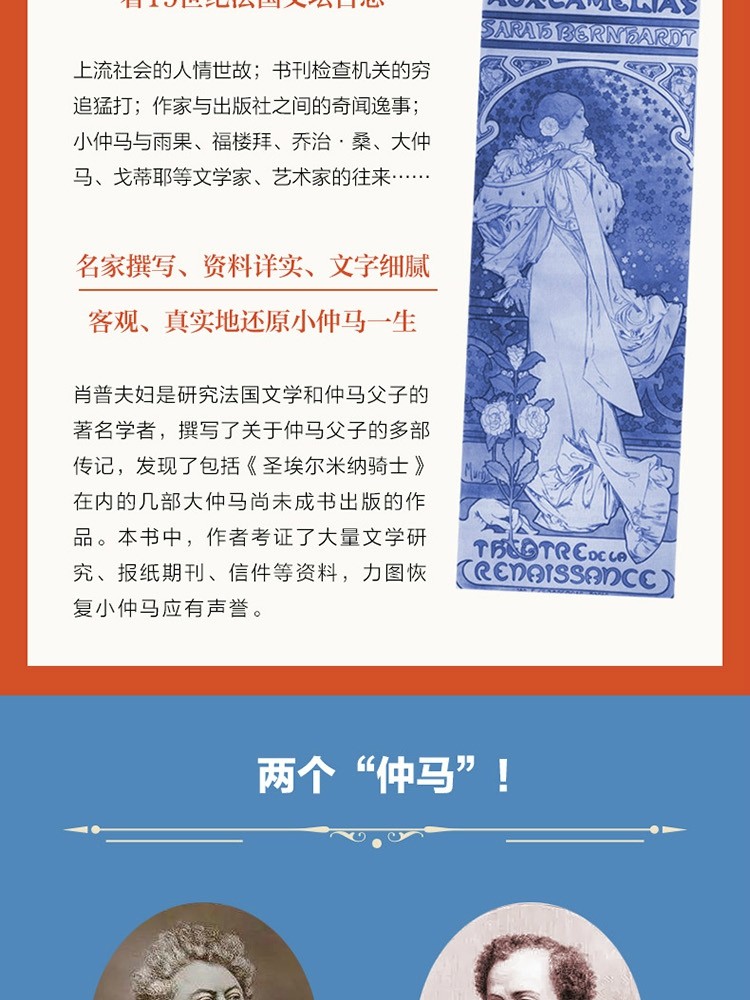 玛丽亚娜·肖普、克洛德·肖普(Marianne Schopp & Claude Schopp):克洛德·肖普是研究仲马父子生活和作品的著名专家,除了撰写了大量评论文章之外,他还发现了几部大仲马尚未成书出版的不为人知的作品,其中著名的是《圣埃尔米纳骑士》,还撰写了关于仲马父子的多部传记。本书为肖普夫妇合作撰写,于2017年获得了“龚古尔传记奖”。