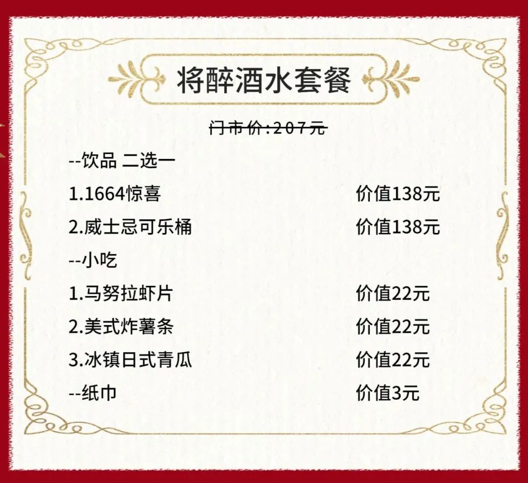 将醉酒水套餐 抢购价:99元/套(门市价:207元)