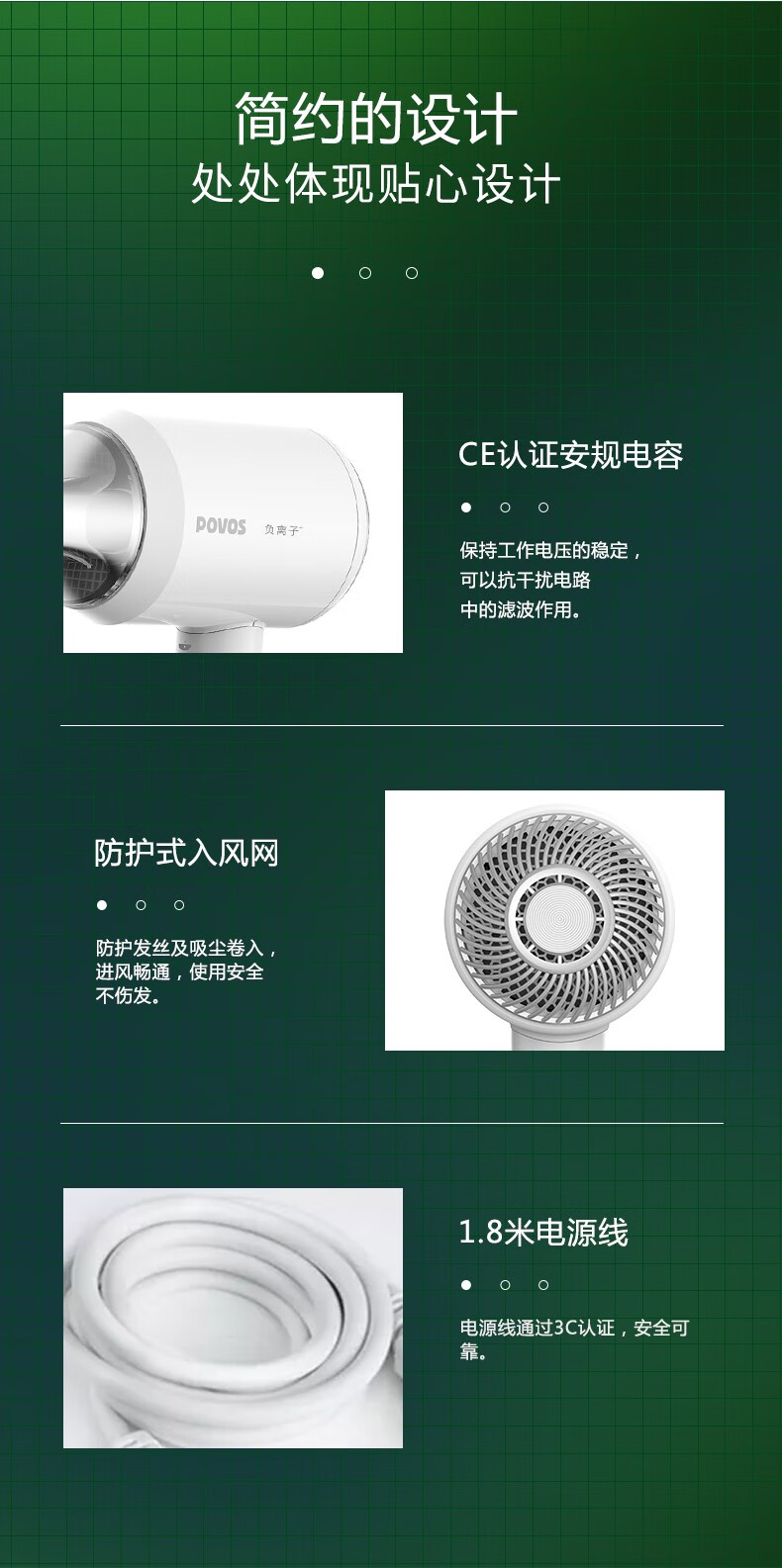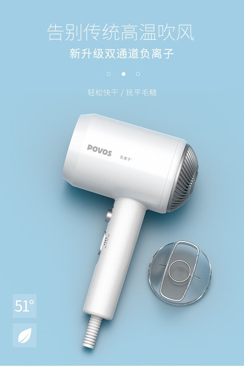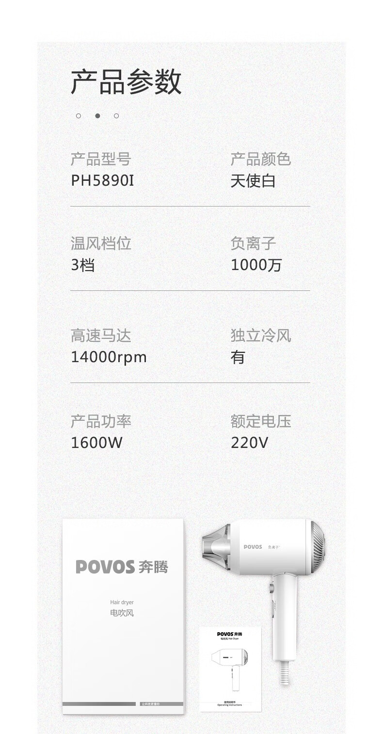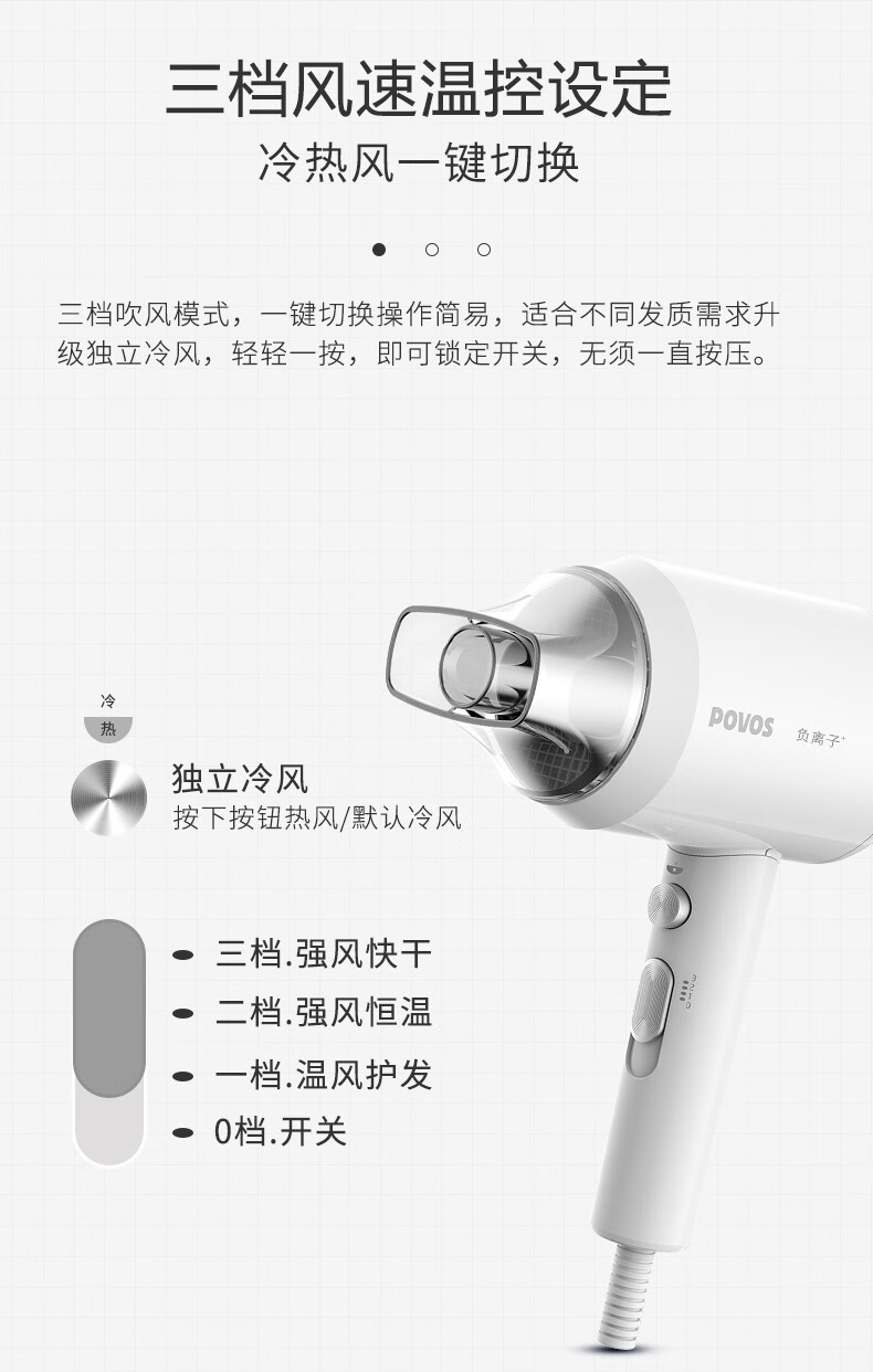【自营】 奔腾POVOS 家用电吹风 吹风机1600W负离子吹风筒 3档风速 白色