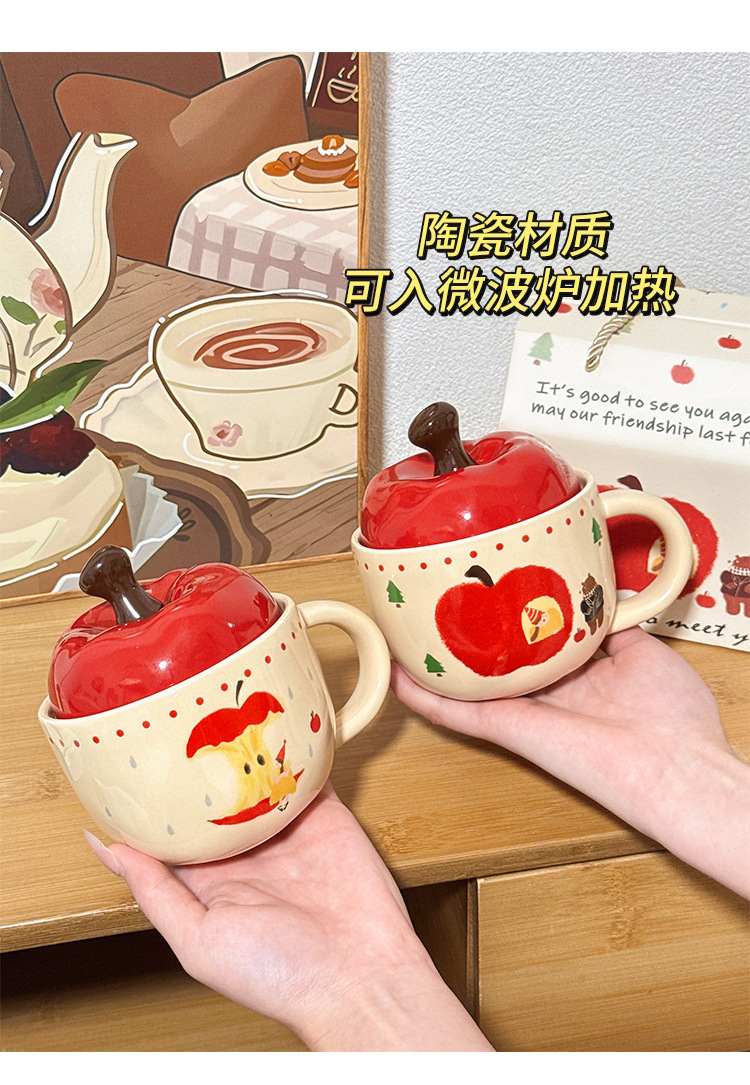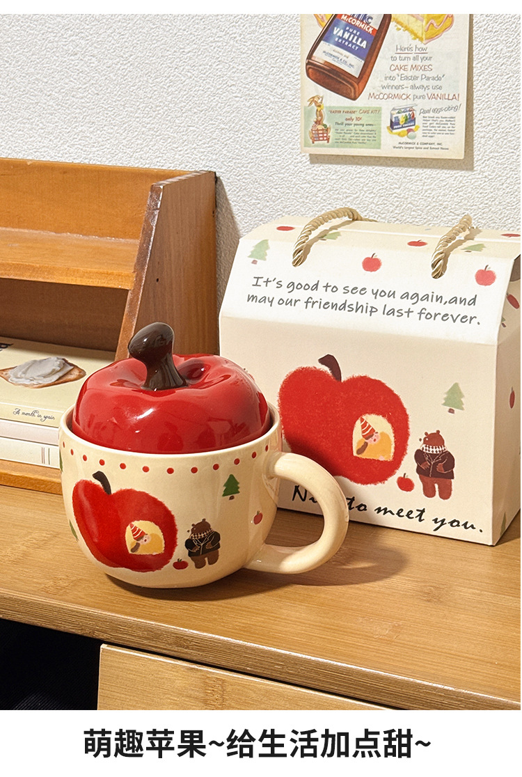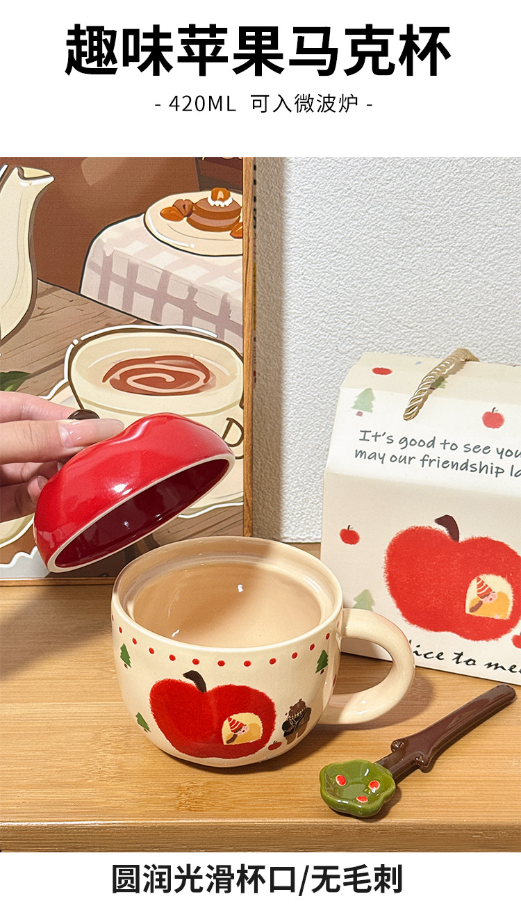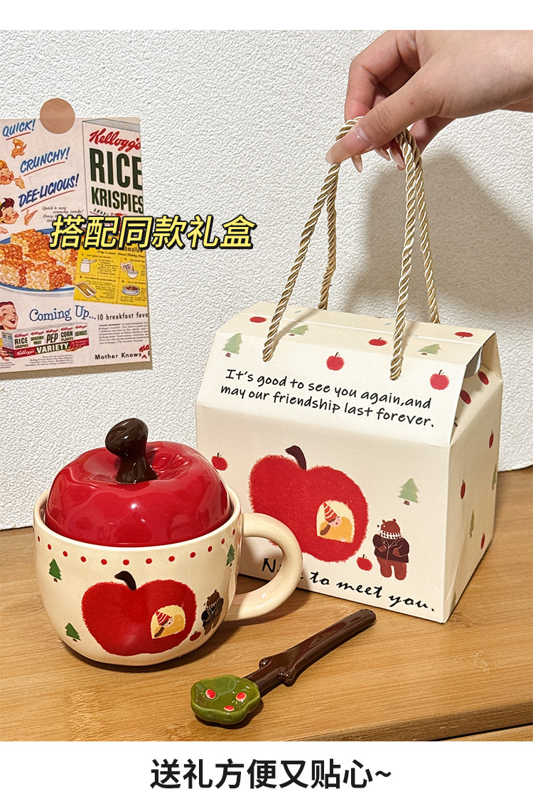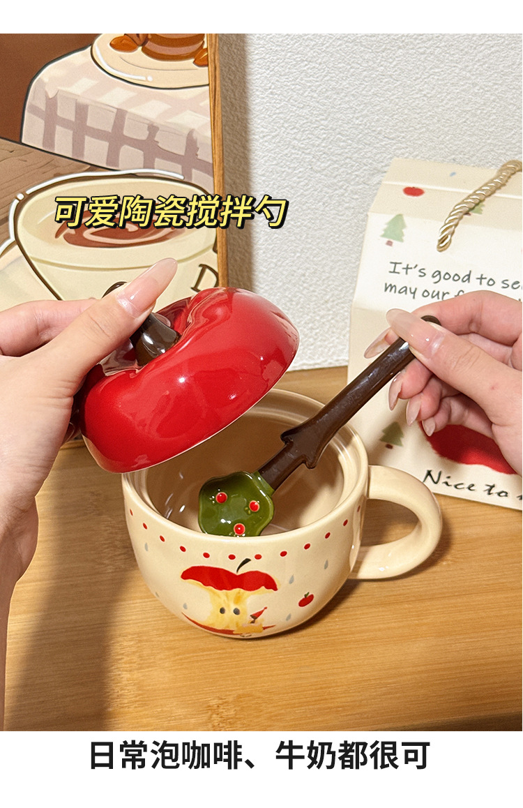 「礼盒装!陶瓷马克杯」可爱带盖勺早餐杯办公室喝水情侣水杯生日礼物女苹果陶瓷杯马克杯餐饮用具
