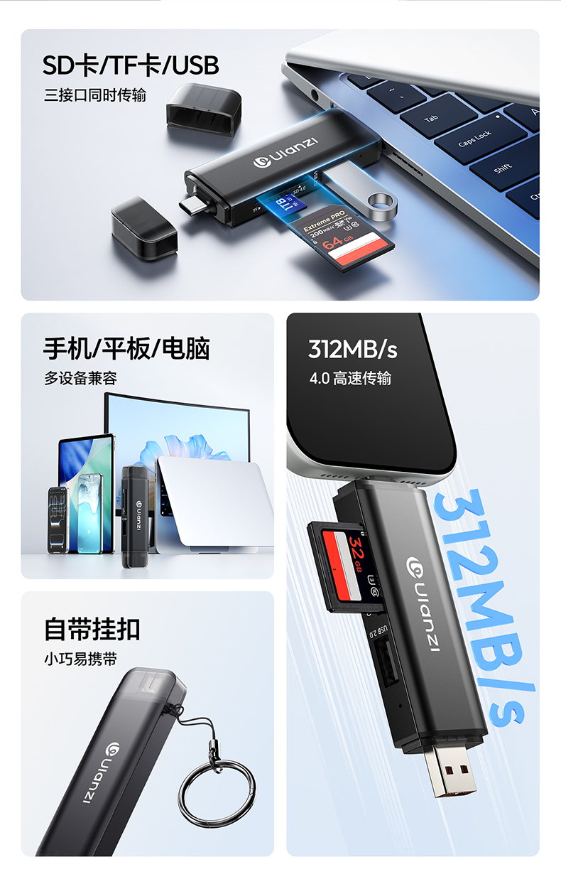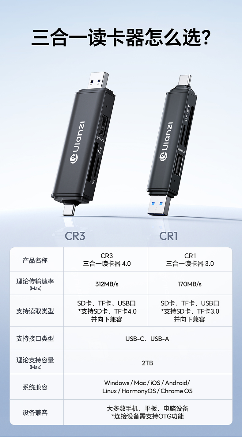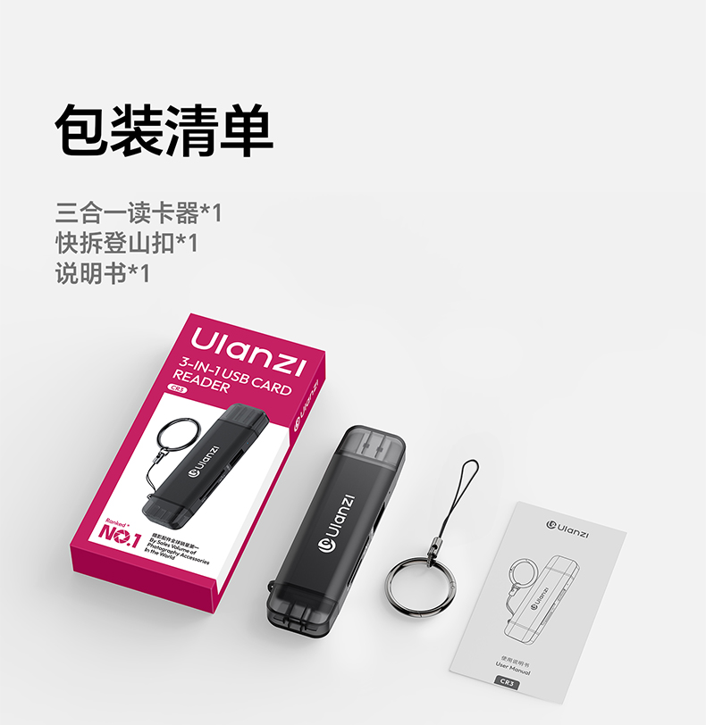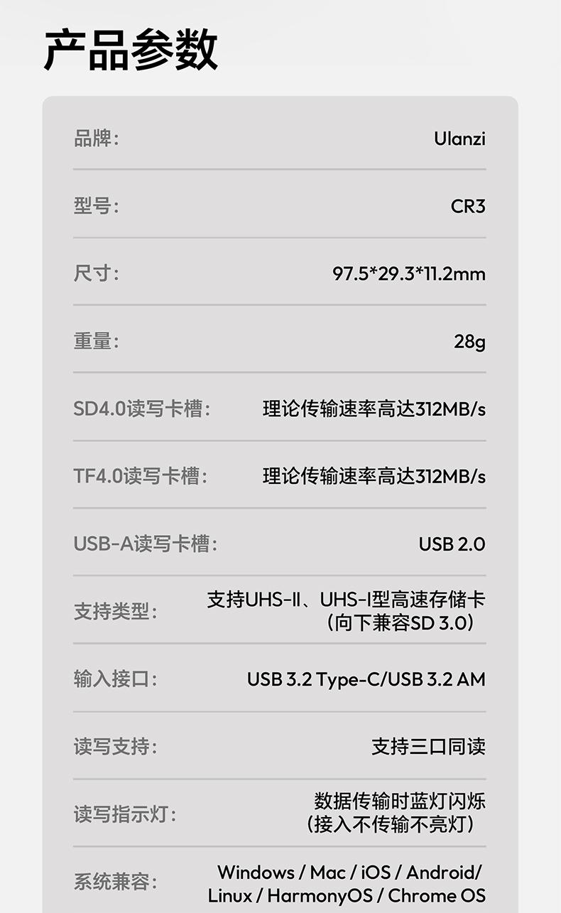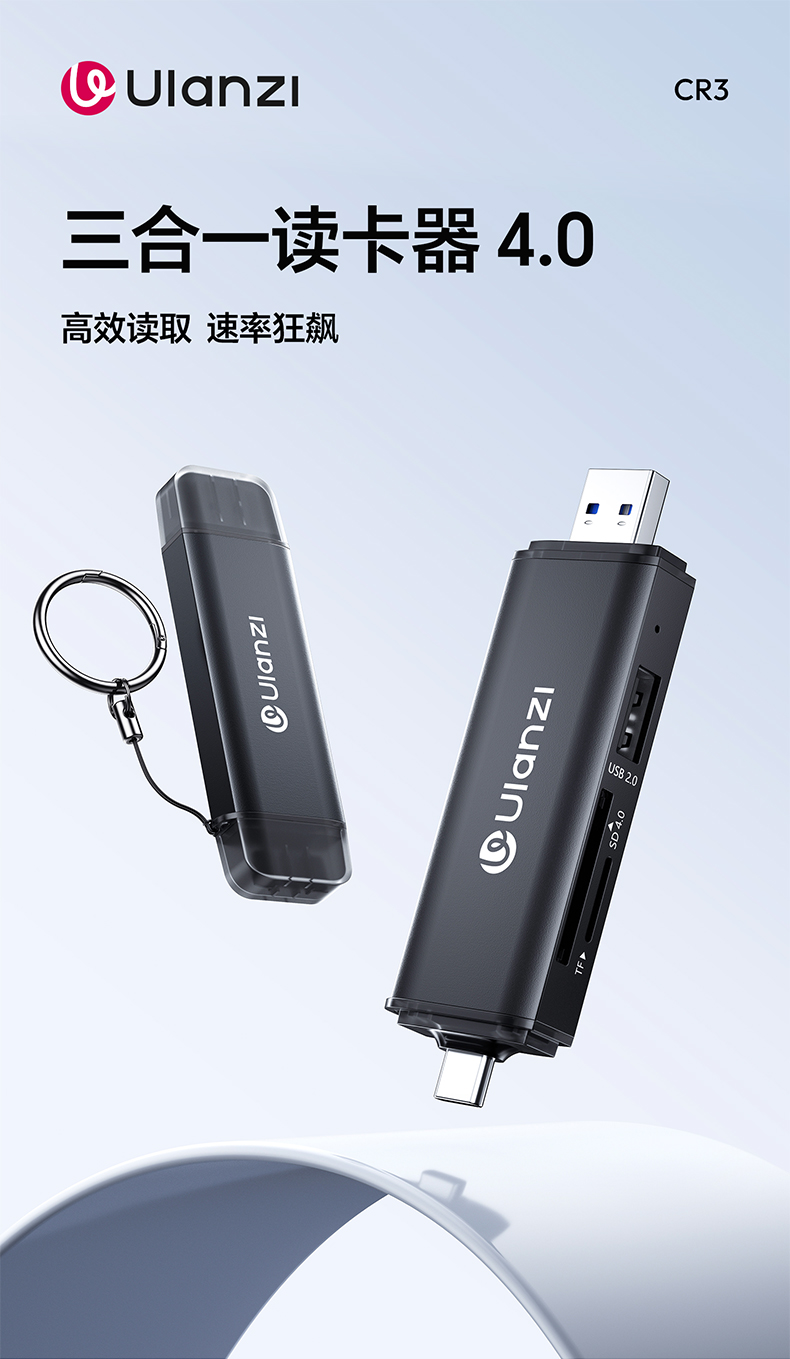 Ulanzi优篮子CR3三合一读卡器4.0多接口高速读取SD卡/TF卡闪传设备USB内存卡type-c兼容平板手机电脑即插即用