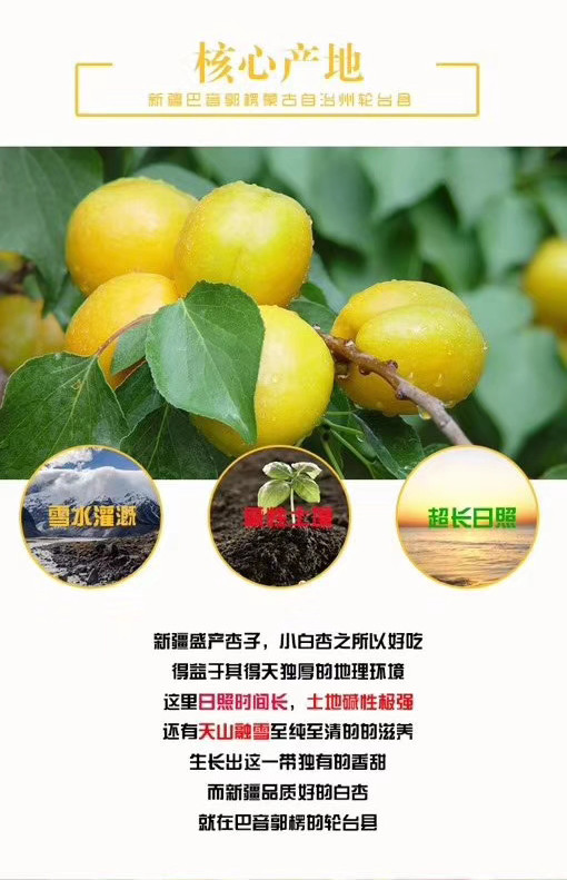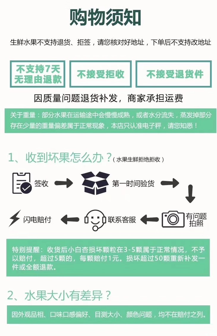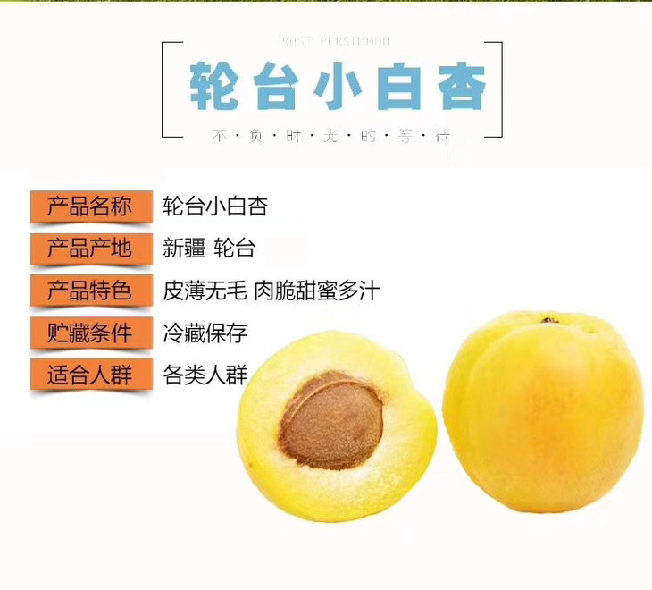 【属品名】 阳光小杏 【品种】小白杏 【规格】净重3.5斤±50克 【产地】轮台县 【发货地】轮台县 【发货快递】顺丰快递 【发货时效】72小时(如遇降雨无法采摘发货顺延) 【不发货地区】西藏,县级以下不售后 【储存方法】 放置在阴凉通风处 【包装方式】 单独网套+网框+纸箱包装 【卖点】果皮光滑、果肉厚、风味浓、甜度高、肉质紧、纤维少、汁液多。 【售后标准】 生鲜水果,一旦发货不支持拒收,退货,修改地址。 有任何问题请及时联系客服;收到先开箱验货,如有破损请和快递单一起(5颗以内不售后),12小时内拍照给客服处理 赔付金额:(价格/个数)*坏果个数; |