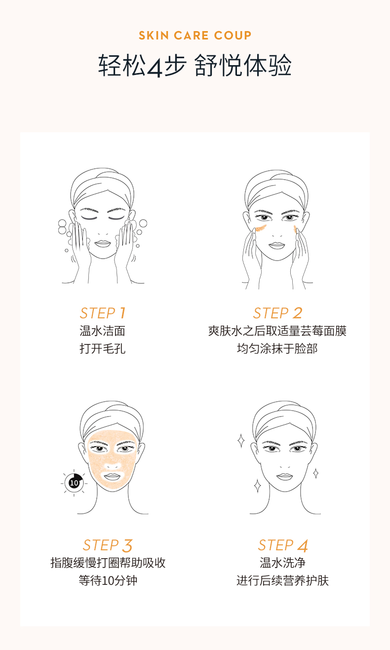 一周使用2次即可,涂在清洁后的皮肤上,指腹缓慢打圈按摩10分钟帮助吸收,然后彻底冲洗,即可清理皮肤表层老废角质。