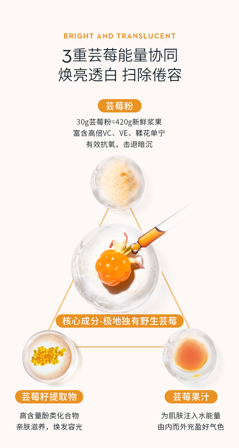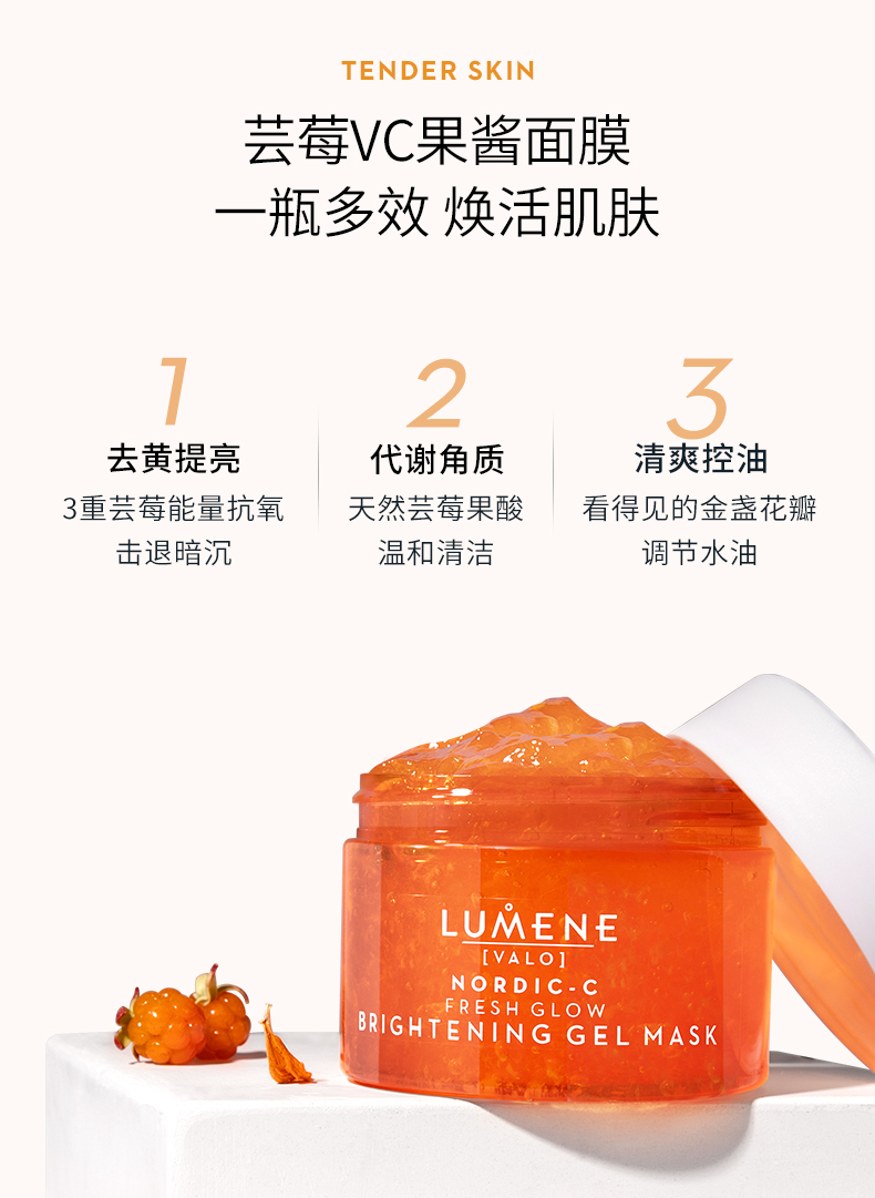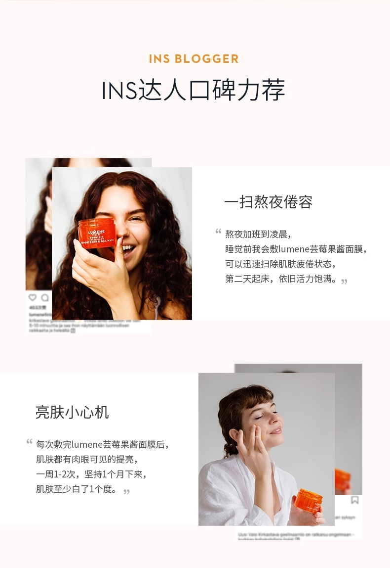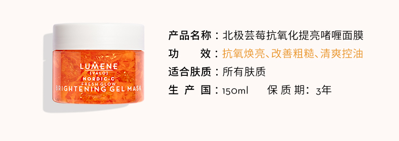 极地芸莓面膜之所以可以温和代谢角质,提亮肤色,是因为LUMENE从芸莓果醋中创新性地提取温和aha(PH值4.5-5不伤肤),具有天然清洁、温和去角质的作用,而且果酸可以深入肌肤表层,吸收游离自由基,可以改善皮肤粗糙的问题。