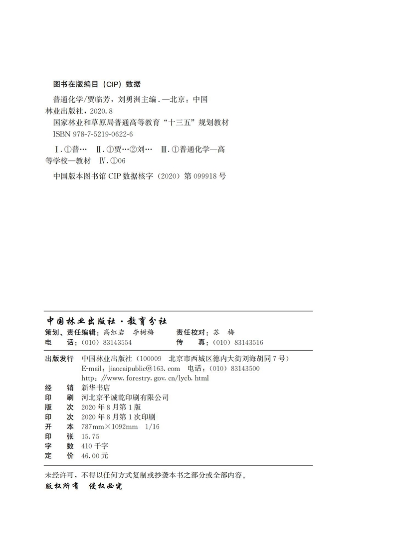 普通化学 贾临芳 刘勇洲 国家林业和草原局普通高等教育十三五规划教材 0622 中国林业出版社
