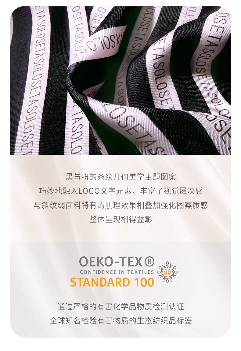 - soloseta专注于真丝织物,灵感源自意大利语,中文含义为“只做真丝”的意思。让睡衣变时尚,居家和外出瞬间切换,使其更具有出街,度假,参加宴会等功能。