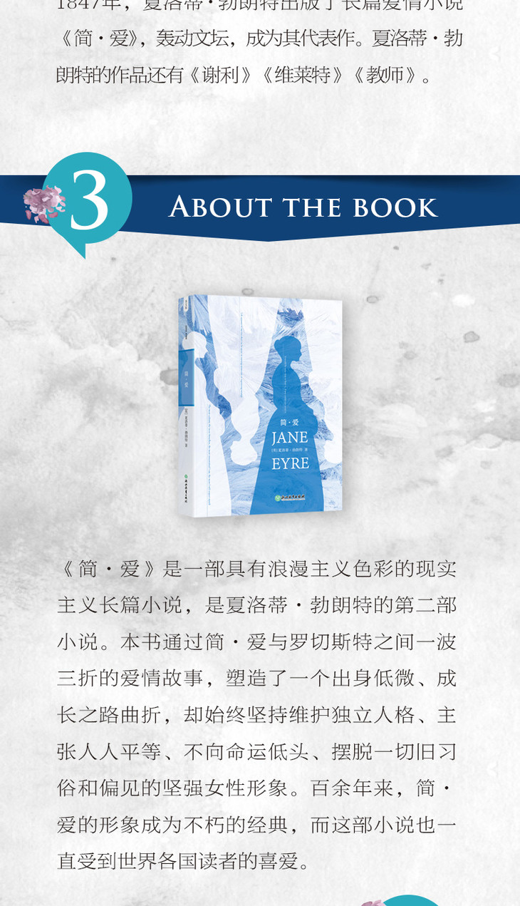 《简·爱》是一部具有浪漫主义色彩的现实主义长篇小说,是夏洛蒂·勃朗特的第二部小说。本书通过简·爱与罗切斯特之间一波三折的爱情故事,塑造了一个出身低微、成长之路曲折,却始终坚持维护独立人格、主张人人平等、不向命运低头、摆脱一切旧习俗和偏见的坚强女性形象。百余年来,简·爱的形象成为不朽的经典,而这部小说也一直受到世界各国读者的喜爱。