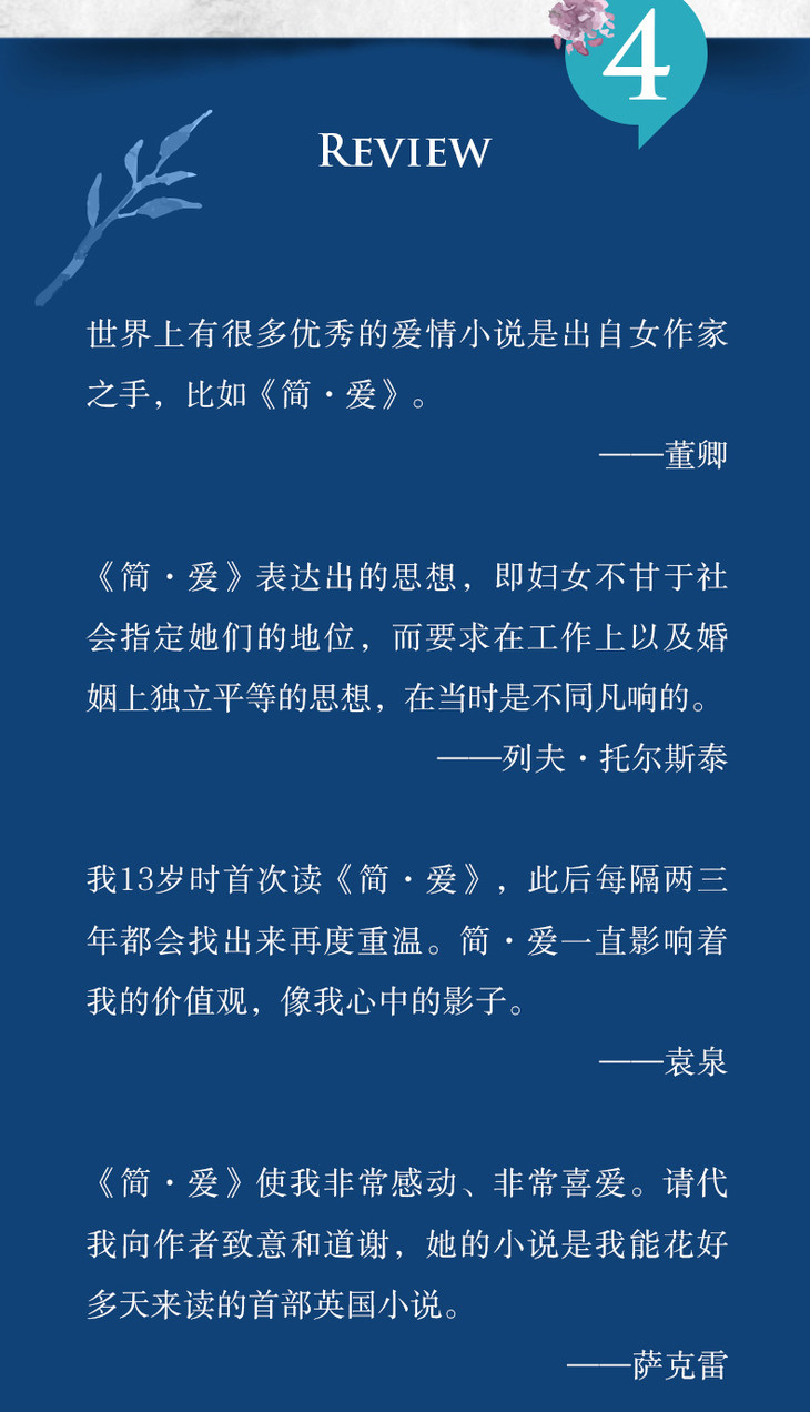 《简·爱》表达出的思想,即妇女不甘于社会指定她们的地位,而要求在工作上以及婚姻上独立平等的思想,在当时是不同凡响的。(列夫·托尔斯泰)