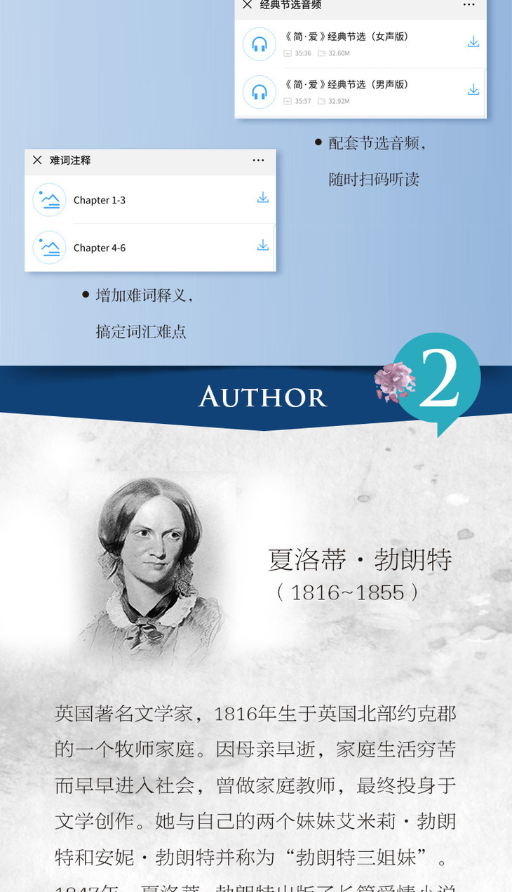 夏洛蒂·勃朗特(1816—1855),英国著名文学家,1816年生于英国北部*克郡的一个牧师家庭。因母亲早逝,家庭生活穷苦而早早进入社会,曾做家庭教师,*终投身于文学创作。她与自己的两个妹妹艾米莉·勃朗特和安妮·勃朗特并称为“勃朗特三姐妹”。1847年,夏洛蒂·勃朗特出版了长篇小说《简·爱》,轰动文坛,成为其代表作。夏洛蒂·勃朗特的作品还有《谢利》《维莱特》《教师》。